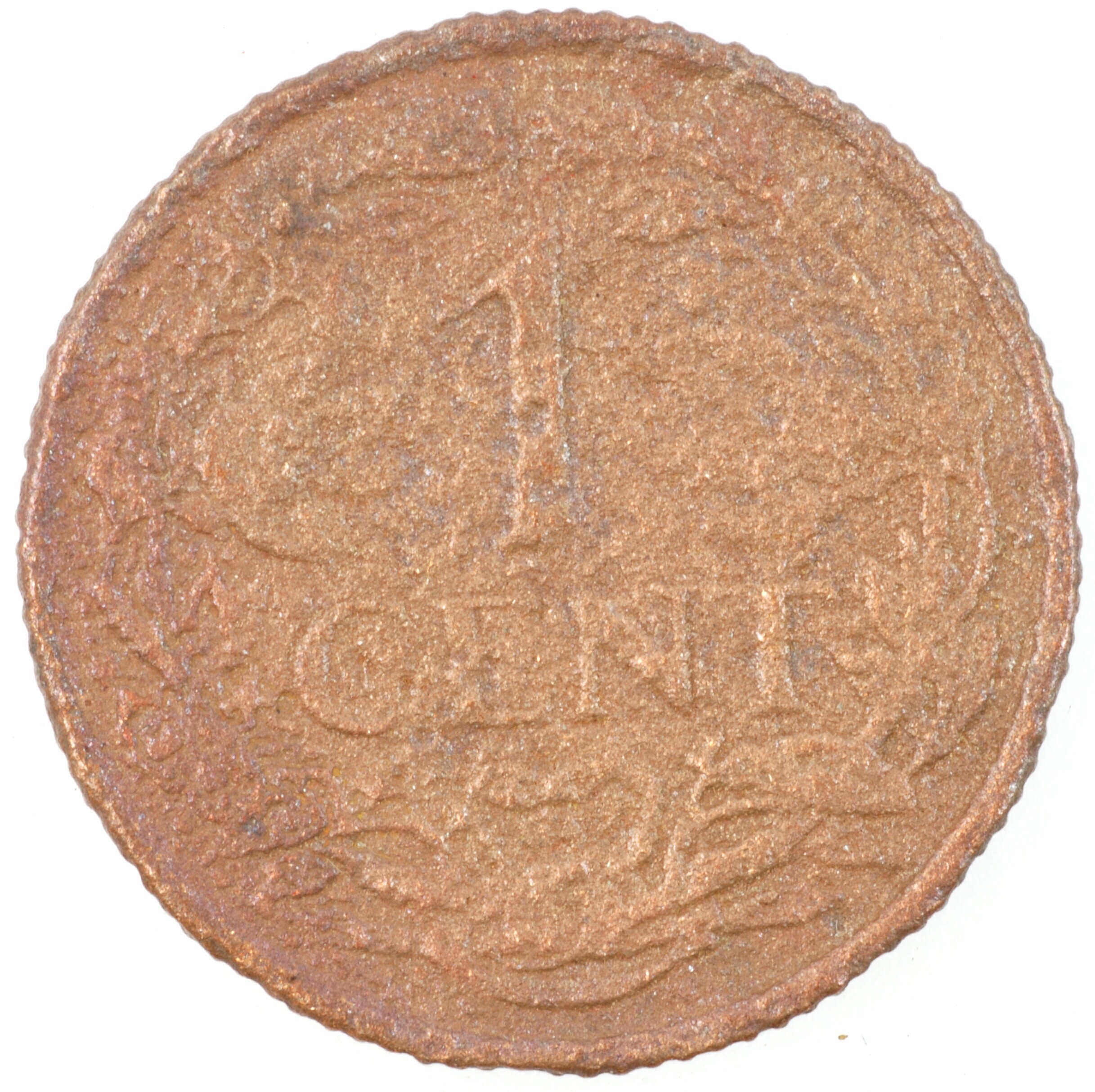 Cent; Nederland Koninkrijk (1813-heden); Wilhelmina (1890-1948); vz.: klimmende leeuw naar links met zwaard en pijlenbundel op een veld van azuur met zeventien blokken binnen parelcirkel, met omschrift (druiventros) KONINGRIJK DER NEDERLANDEN (mercuriusstaf) 1941; kz.: binnen een krans van twee samengebonden oranjetakken in twee regels: 1 / CENT; muntplaats: Utrecht; 2.20 gram; referentie: Schulman 998