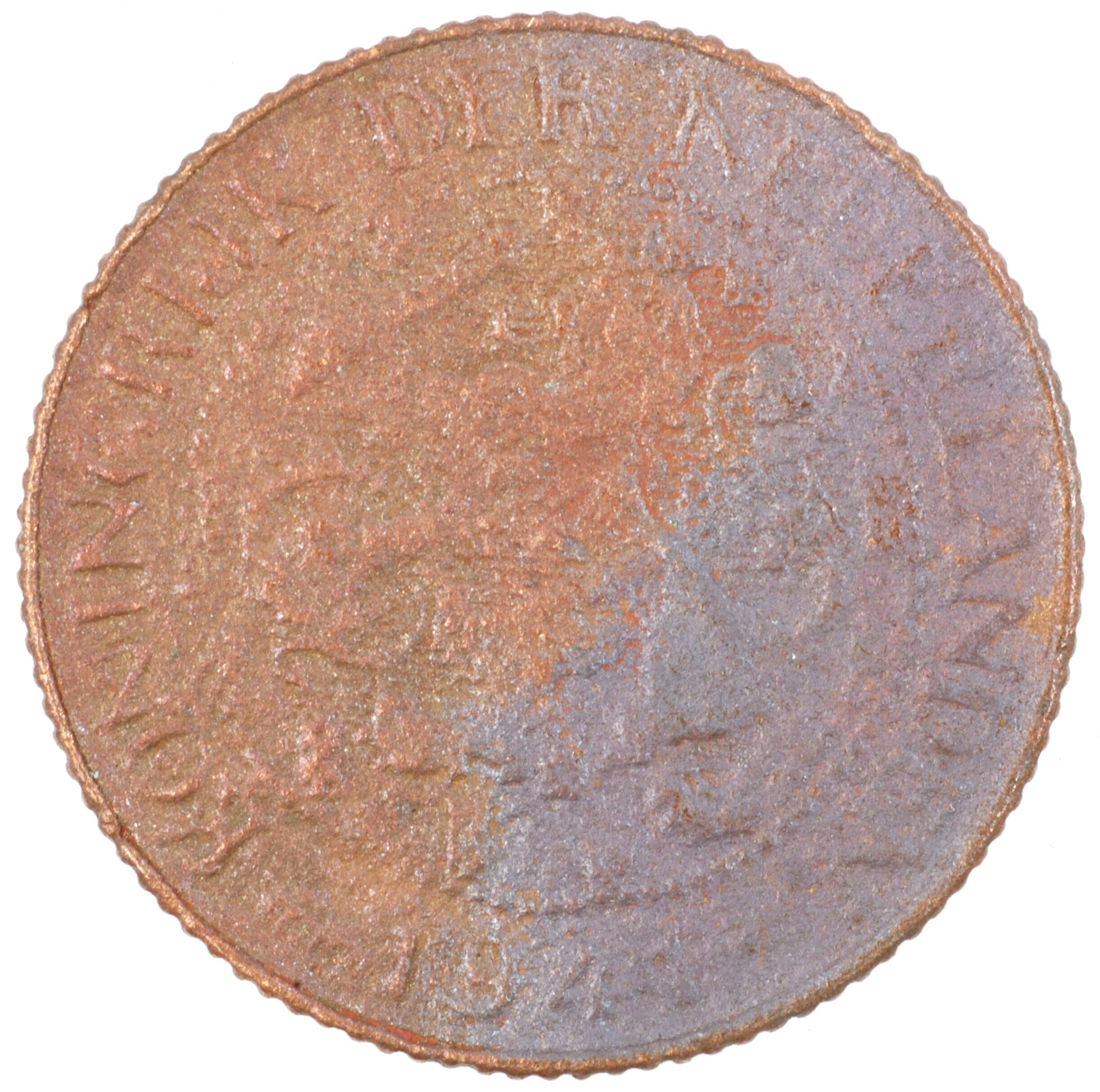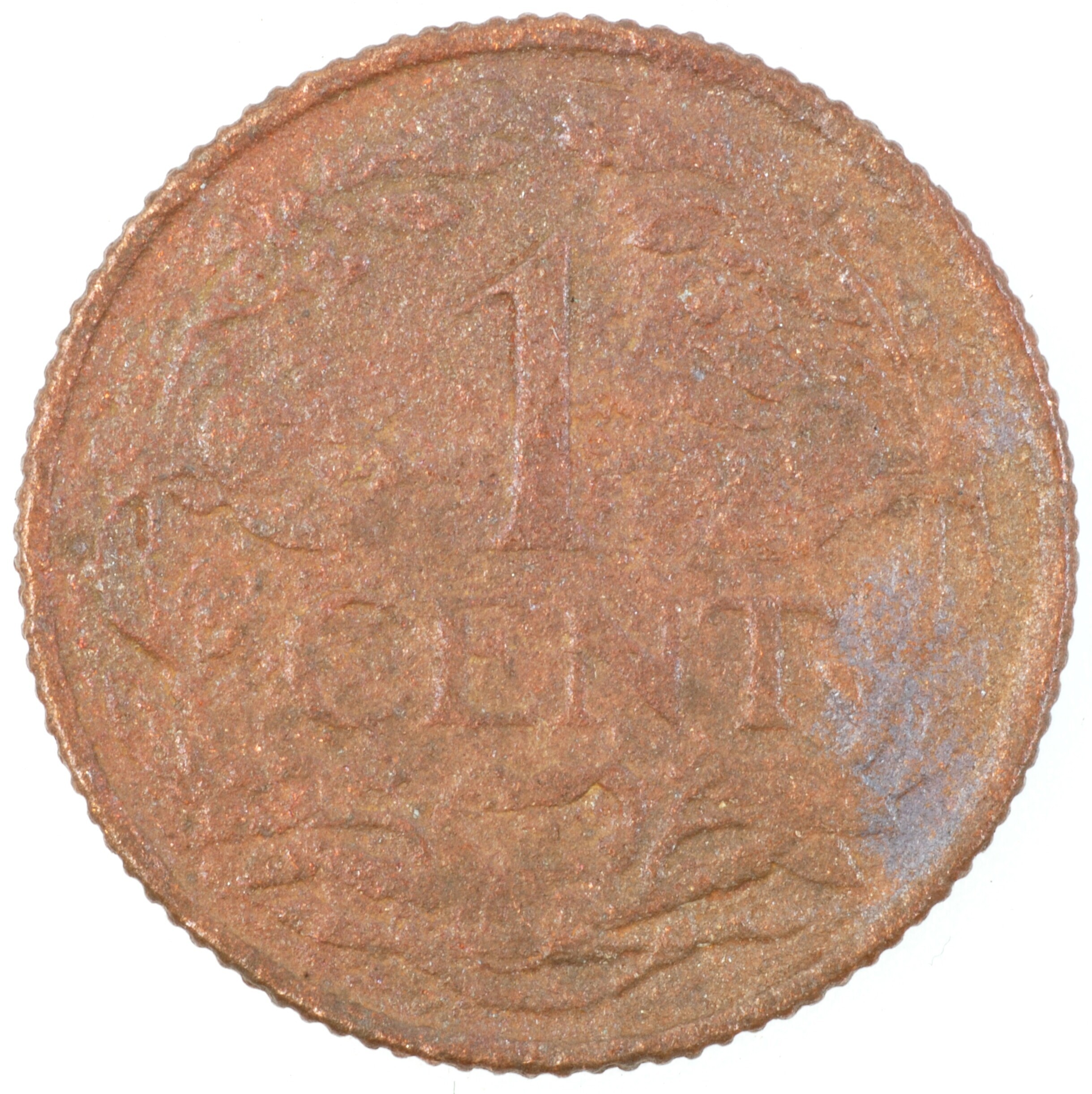 Cent; Nederland Koninkrijk (1813-heden); Wilhelmina (1890-1948); vz.: klimmende leeuw naar links met zwaard en pijlenbundel op een veld van azuur met zeventien blokken binnen parelcirkel, met omschrift (druiventros) KONINGRIJK DER NEDERLANDEN (mercuriusstaf) 1941; kz.: binnen een krans van twee samengebonden oranjetakken in twee regels: 1 / CENT; muntplaats: Utrecht; 2.18 gram; referentie: Schulman 998