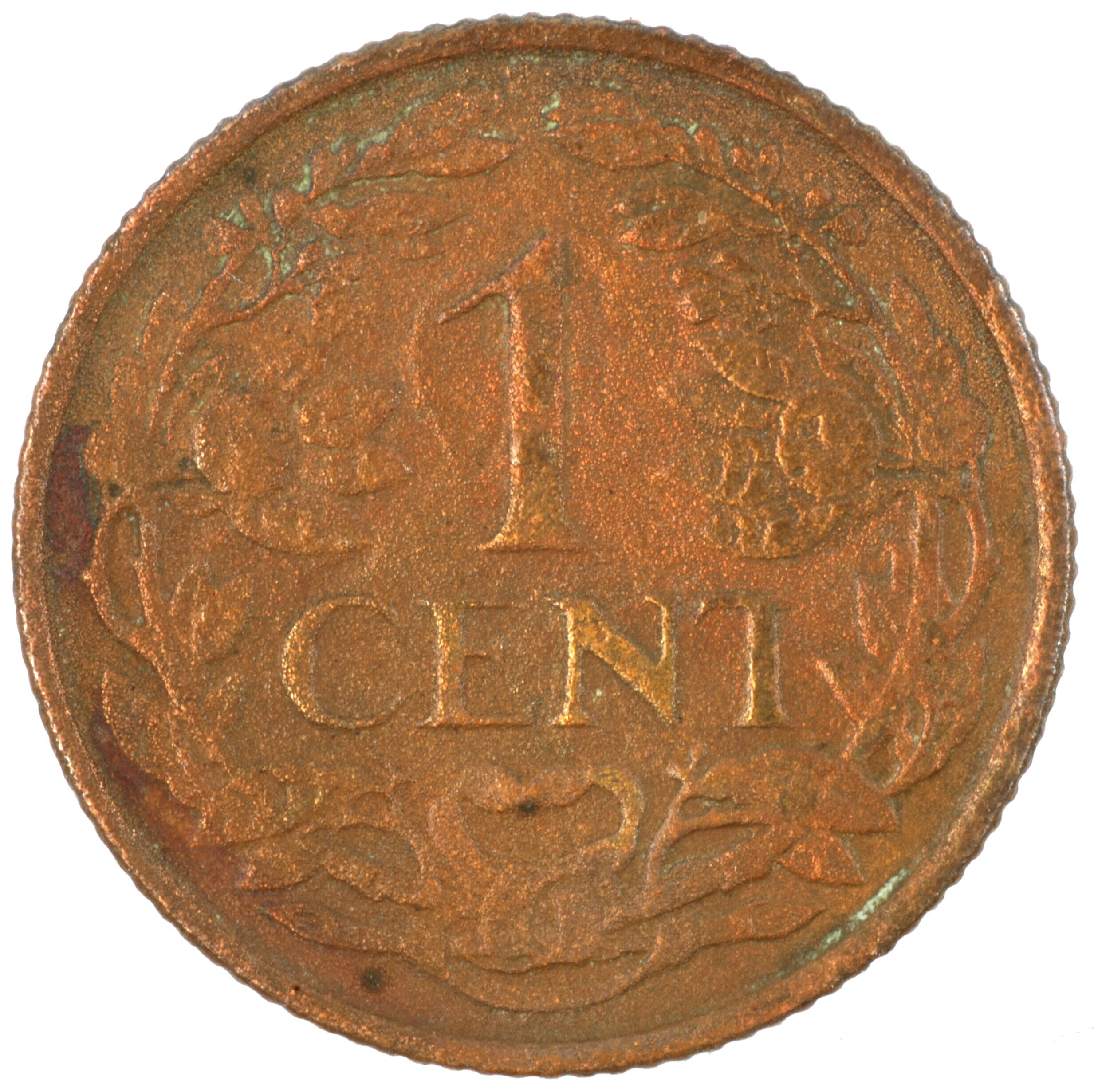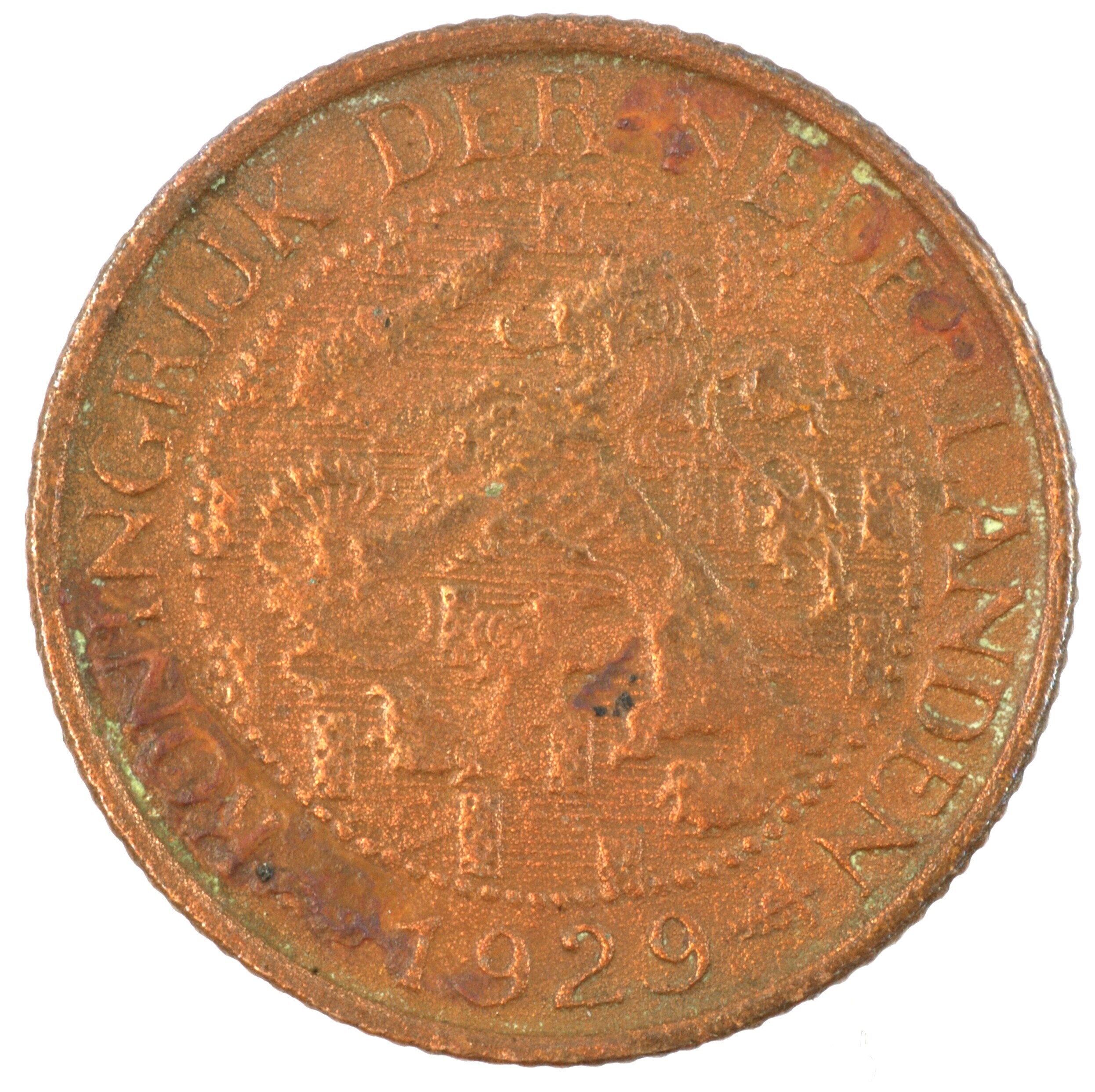 Cent; Nederland Koninkrijk (1813-heden); Wilhelmina (1890-1948); vz.: klimmende leeuw naar links met zwaard en pijlenbundel op een veld van azuur met zeventien blokken binnen parelcirkel, met omschrift (zeepaardje) KONINGRIJK DER NEDERLANDEN (mercuriusstaf) 1929; kz.: binnen een krans van twee samengebonden oranjetakken in twee regels: 1 / CENT; muntplaats: Utrecht; 2.15 gram; referentie: Schulman 991