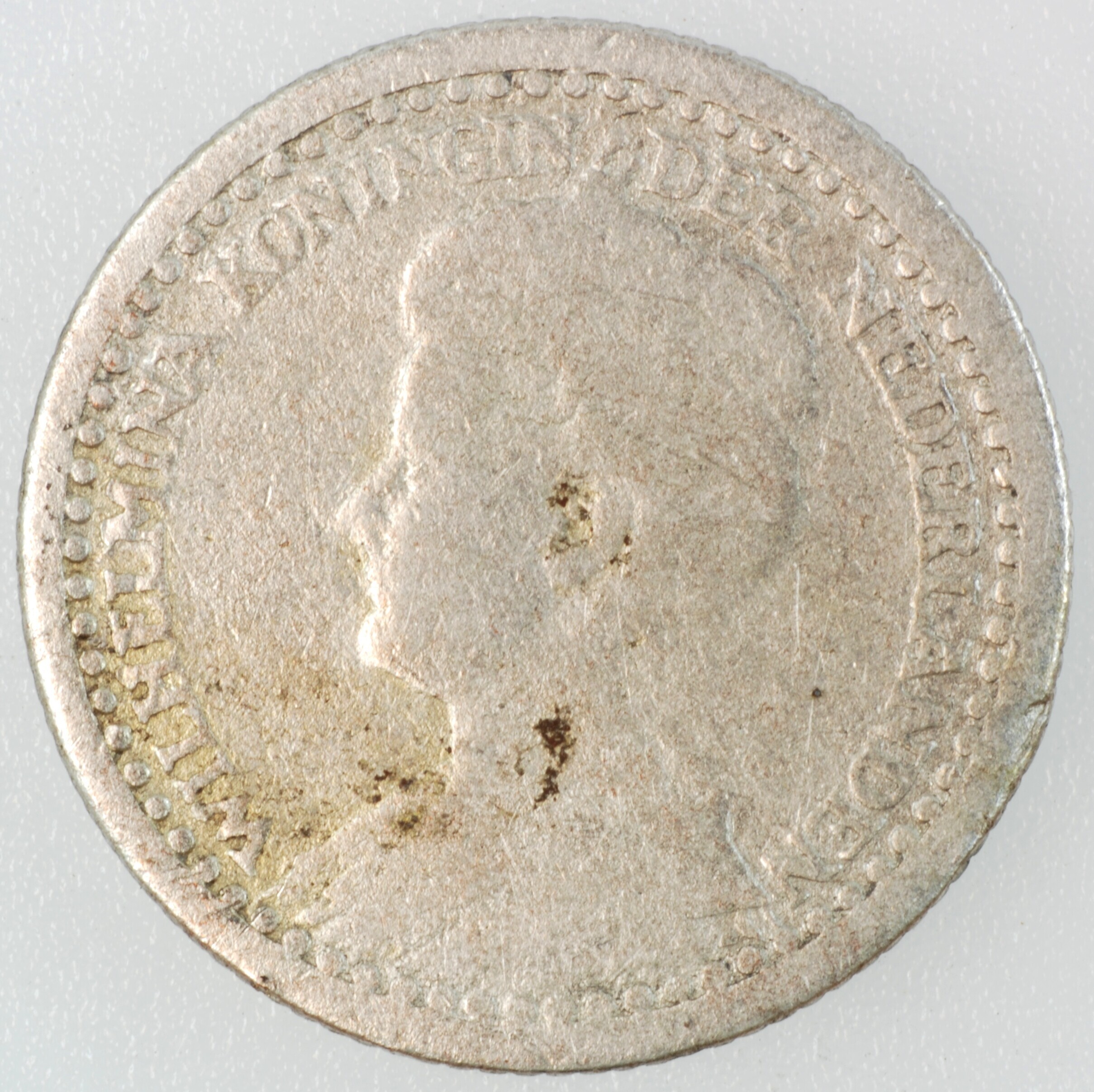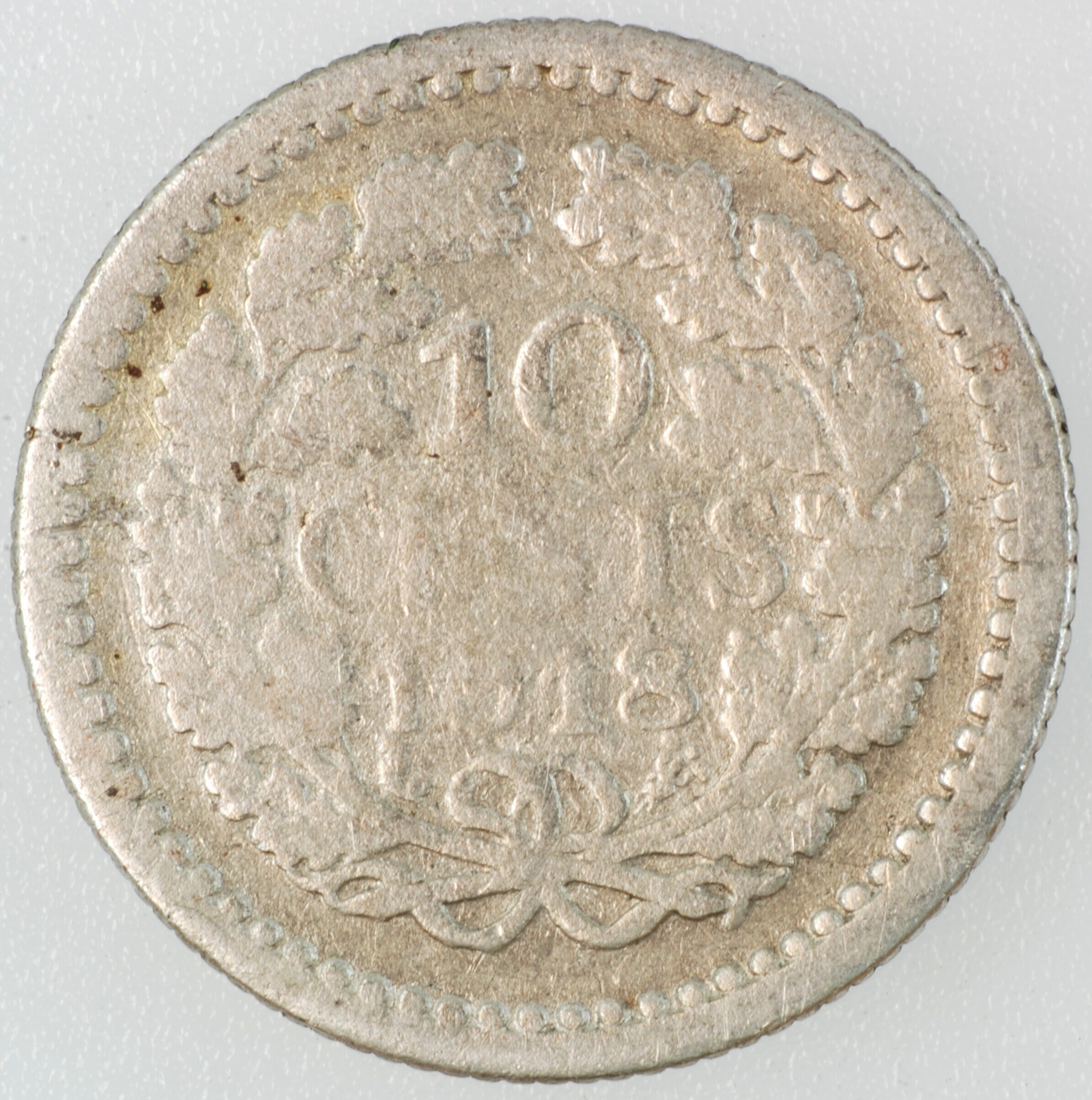 Dubbeltje; Nederland Koninkrijk (1813-heden); Wilhelmina (1890-1948); vz.: gedrapeerde buste met hermelijnen mantel naar links, met omschrift WILHELMINA KONINGIN DER NEDERLANDEN; kz.: binnen een bladerkrans in vier regels: 10 / C[EN]TS / 1918 / (zeepaardje) - (mercuriusstaf); muntplaats: Utrecht; gewicht: 1.28 gram; referentie: Schulman 897