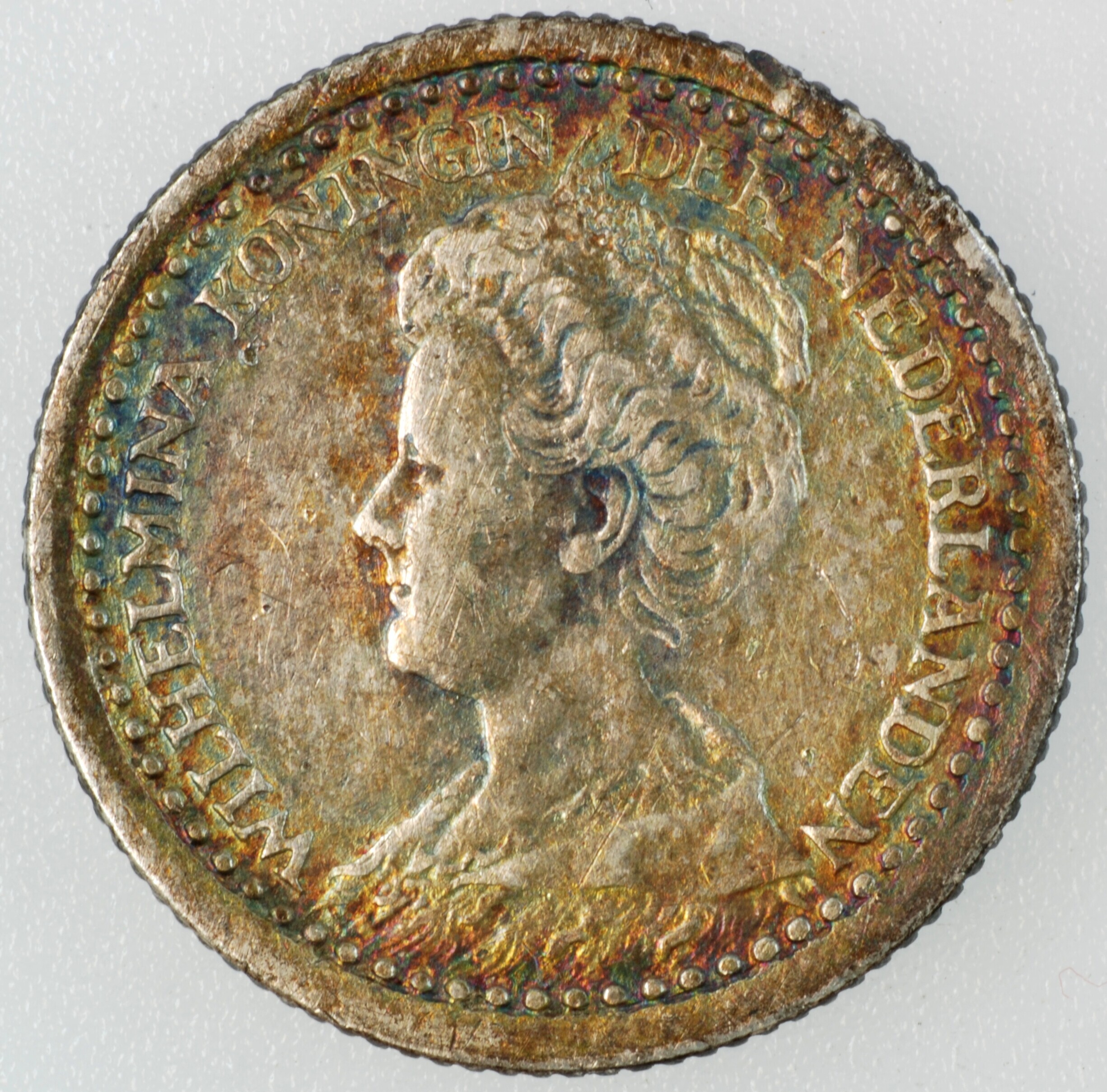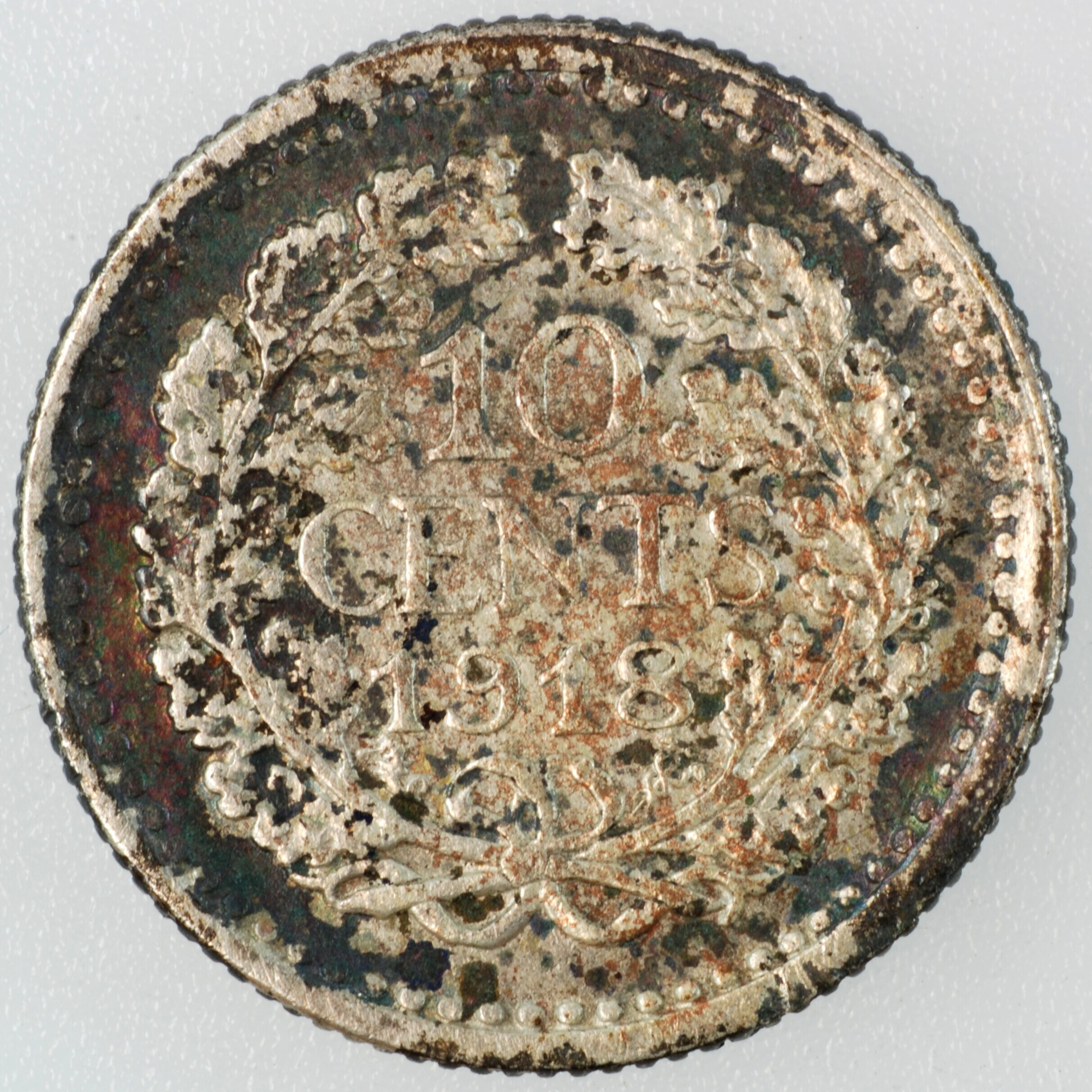 Dubbeltje; Nederland Koninkrijk (1813-heden); Wilhelmina (1890-1948); vz.: gedrapeerde buste met hermelijnen mantel naar links, met omschrift WILHELMINA KONINGIN DER NEDERLANDEN; kz.: binnen een bladerkrans in vier regels: 10 / CENTS / 1918 / (zeepaardje) - (mercuriusstaf); muntplaats: Utrecht; gewicht: 1.35 gram; referentie: Schulman 897