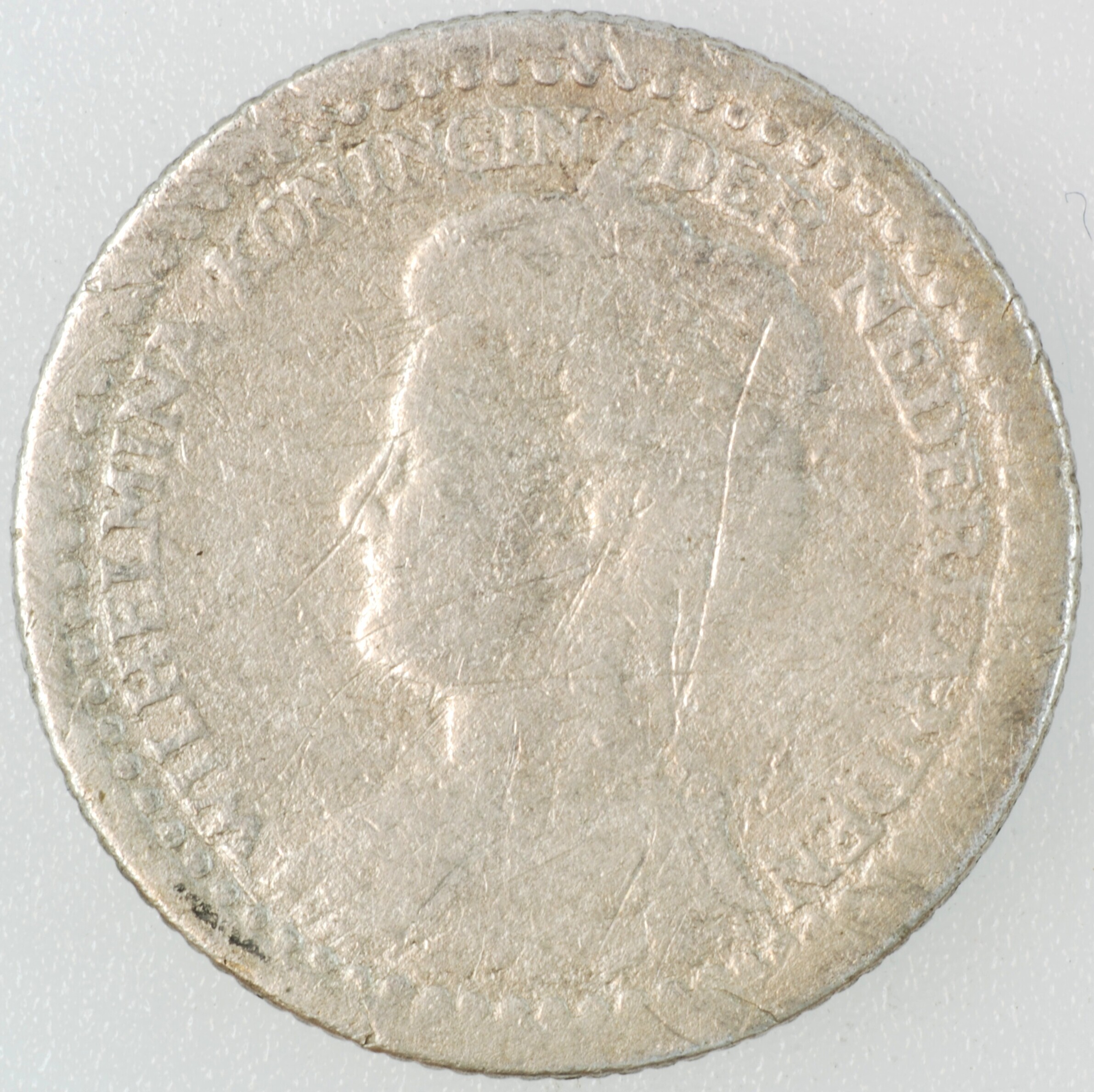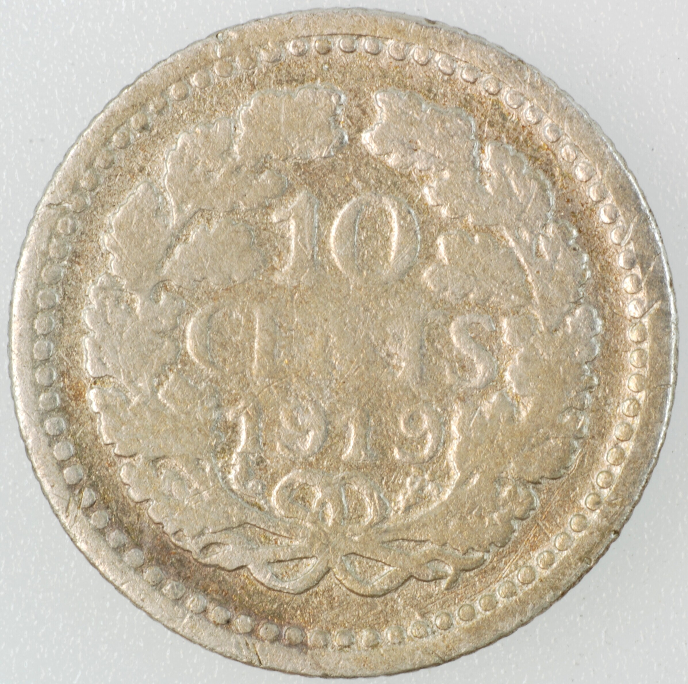 Dubbeltje; Nederland Koninkrijk (1813-heden); Wilhelmina (1890-1948); vz.: gedrapeerde buste met hermelijnen mantel naar links, met omschrift WILHELMINA KONINGIN DER NEDERLANDEN; kz.: binnen een bladerkrans in vier regels: 10 / C[EN]TS / 1919 / (zeepaardje) - (mercuriusstaf); muntplaats: Utrecht; gewicht: 1.27 gram; referentie: Schulman 898
