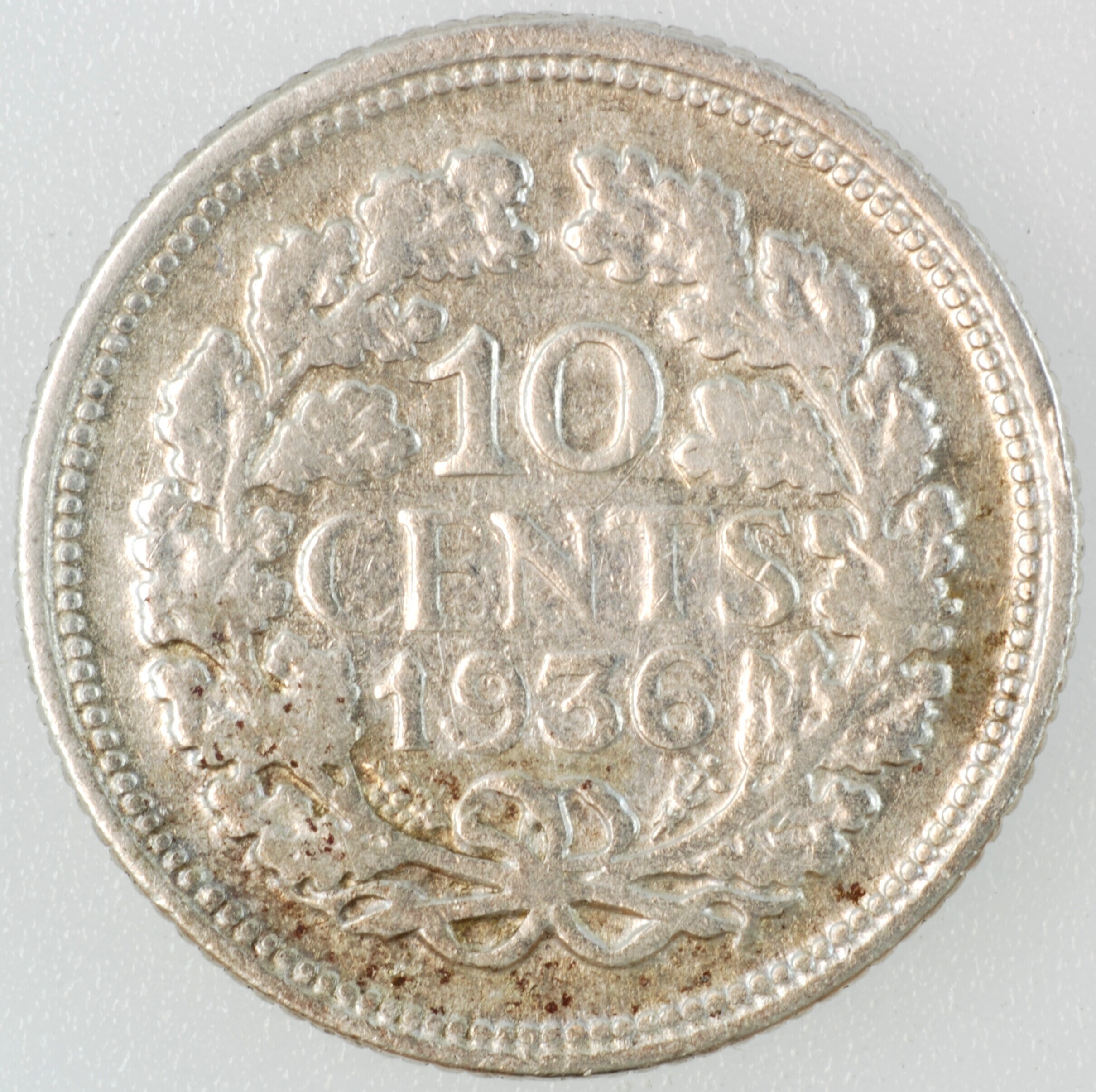 Dubbeltje; Nederland Koninkrijk (1813-heden); Wilhelmina (1890-1948); vz.: hoofd naar links, met omschrift WILHELMINA KONINGIN DER NEDERLANDEN; kz.: binnen een bladerkrans in vier regels: 10 / CENTS / 1936 / (druiventros) - (mercuriusstaf); muntplaats: Utrecht; gewicht: 1.39 gram; referentie: Schulman 907