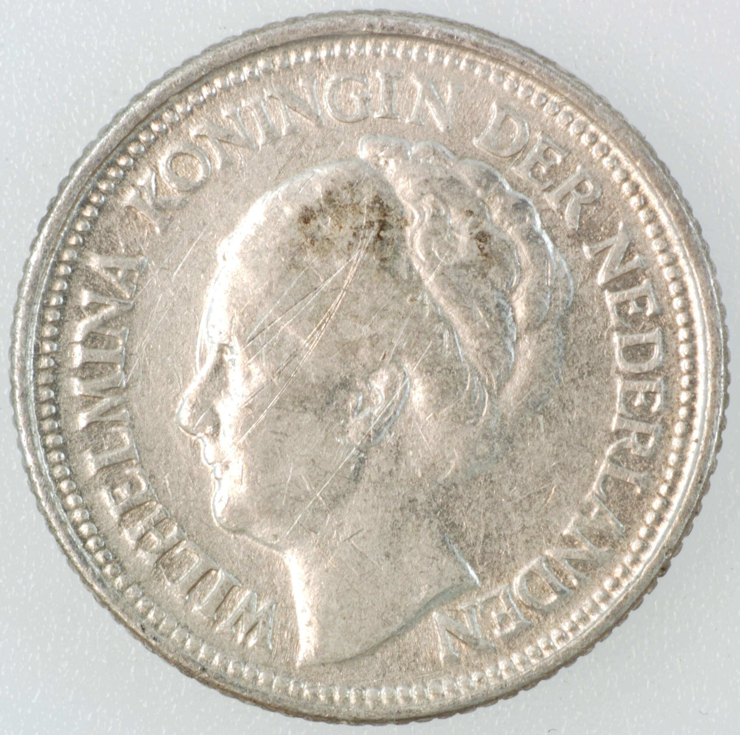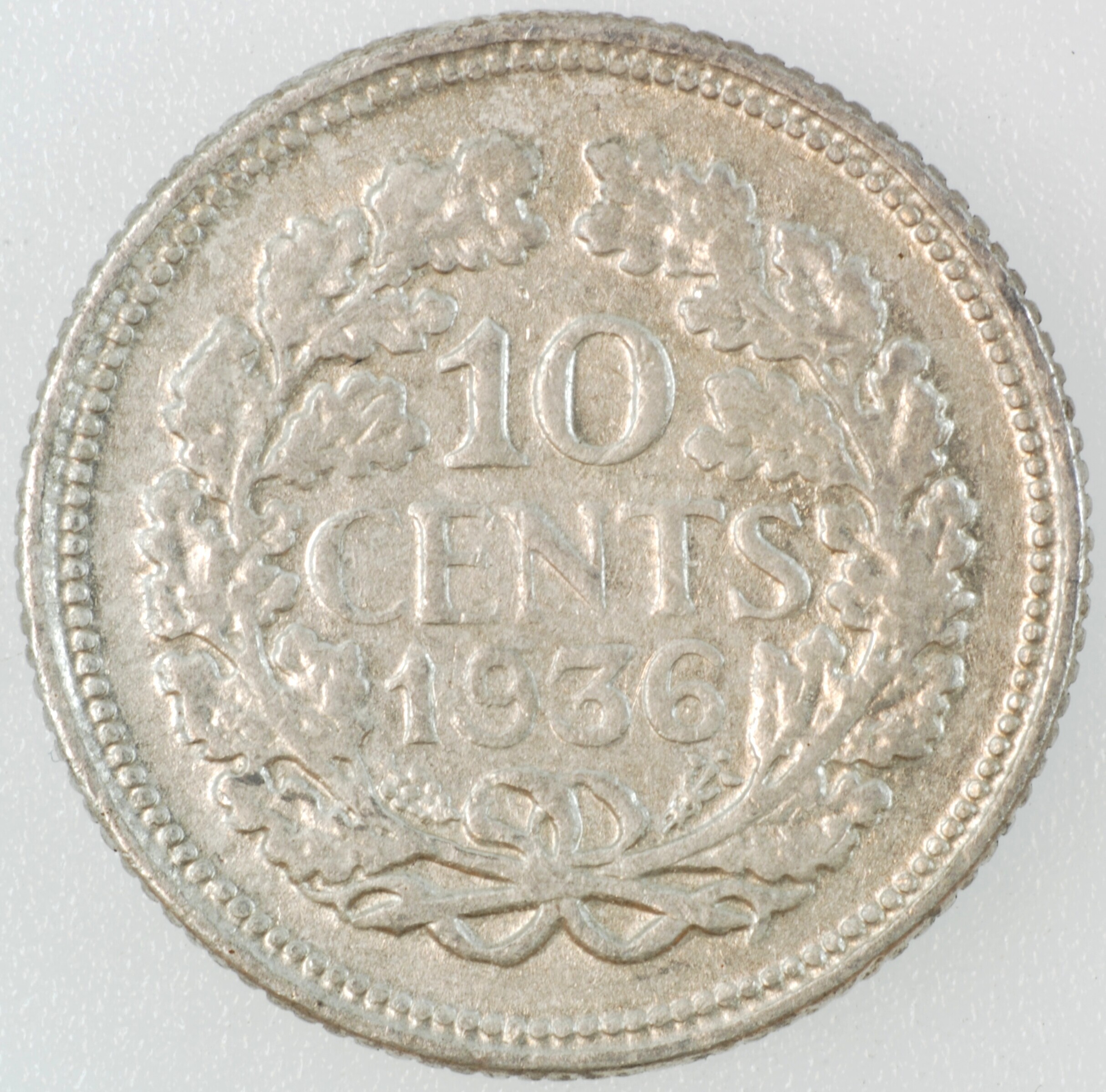 Dubbeltje; Nederland Koninkrijk (1813-heden); Wilhelmina (1890-1948); vz.: hoofd naar links, met omschrift WILHELMINA KONINGIN DER NEDERLANDEN; kz.: binnen een bladerkrans in vier regels: 10 / CENTS / 1936 / (druiventros) - (mercuriusstaf); muntplaats: Utrecht; gewicht: 1.30 gram; referentie: Schulman 907