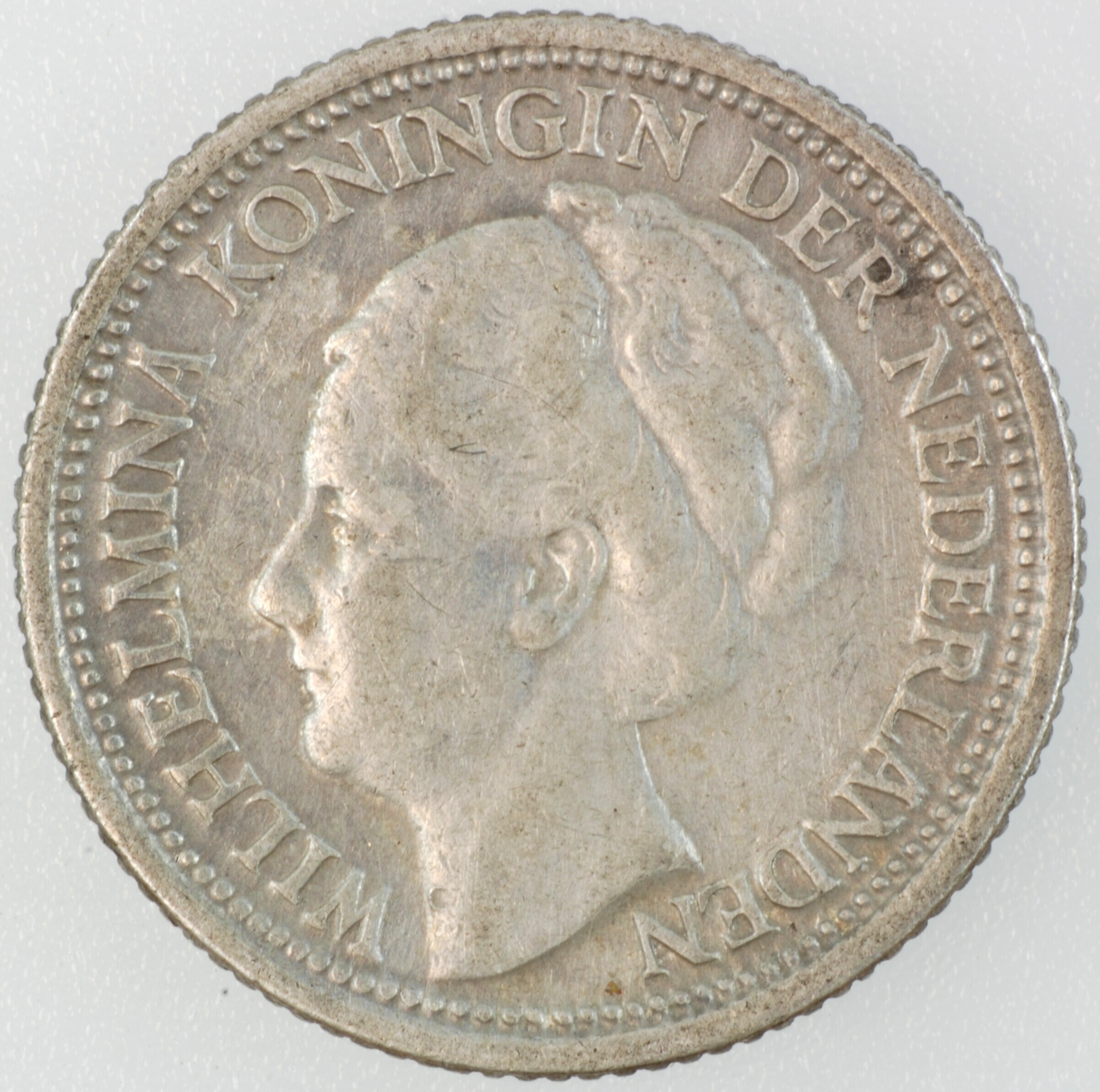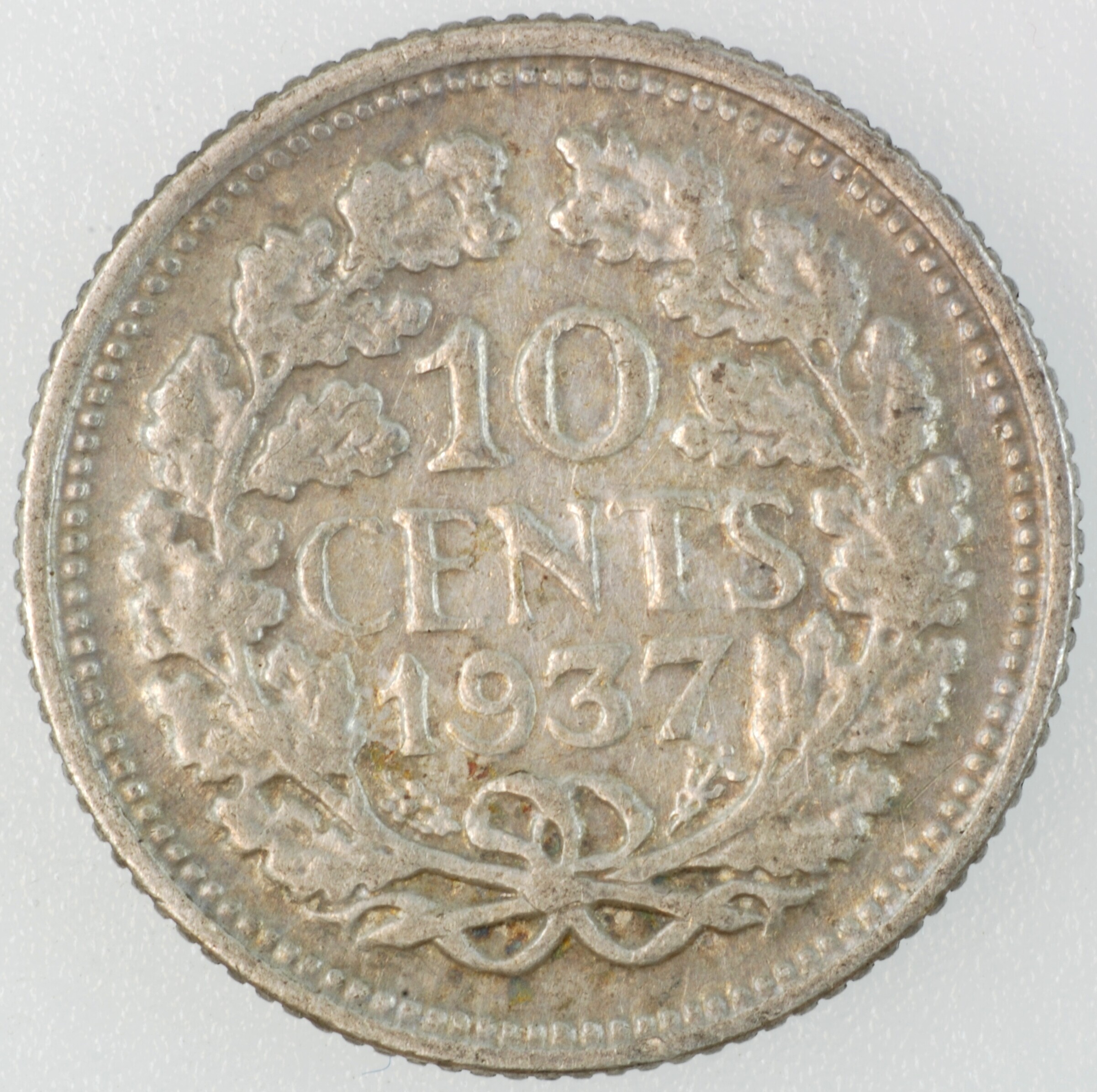 Dubbeltje; Nederland Koninkrijk (1813-heden); Wilhelmina (1890-1948); vz.: hoofd naar links, met omschrift WILHELMINA KONINGIN DER NEDERLANDEN; kz.: binnen een bladerkrans in vier regels: 10 / CENTS / 1937 / (druiventros) - (mercuriusstaf); muntplaats: Utrecht; gewicht: 1.36 gram; referentie: Schulman 908