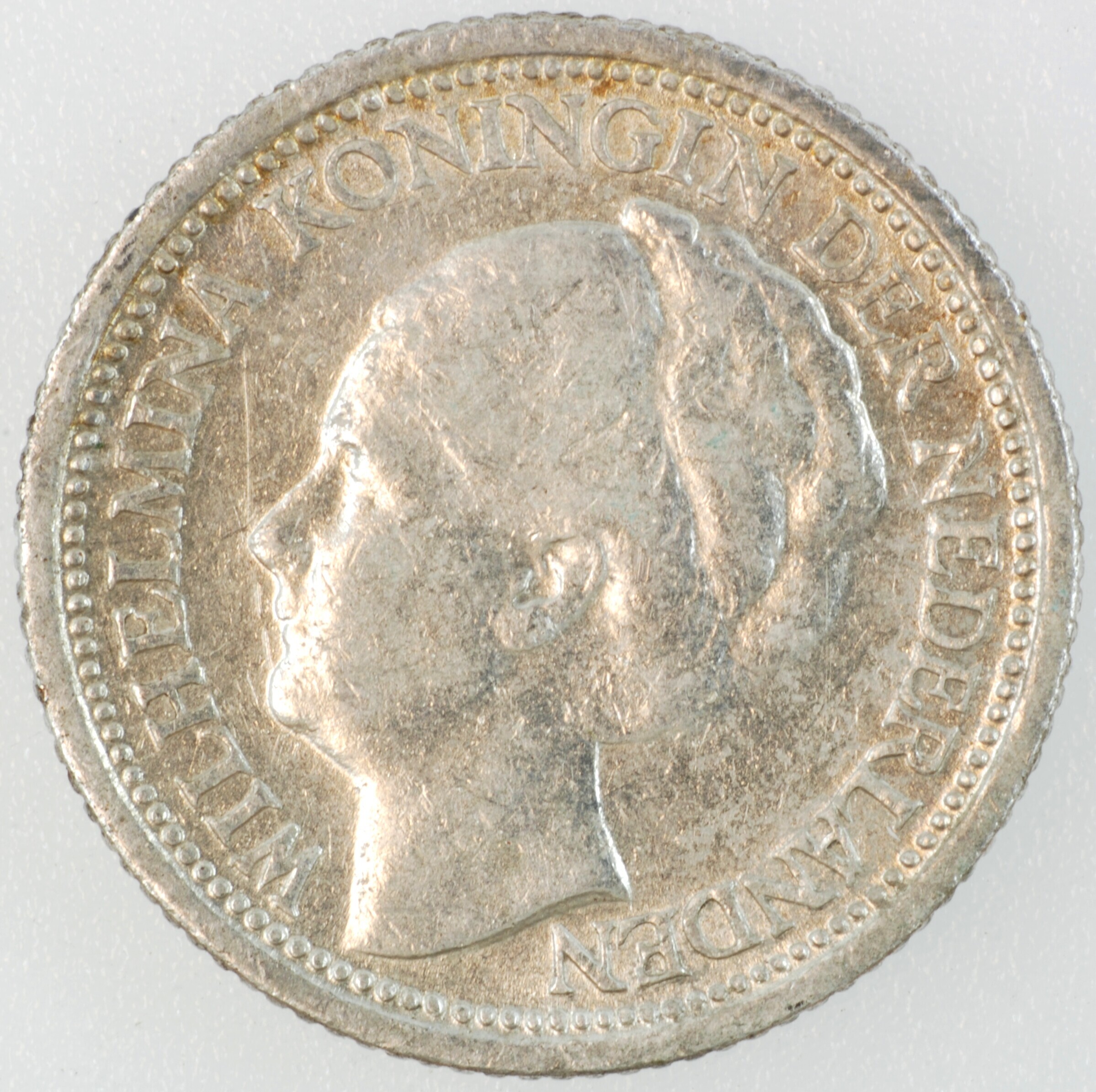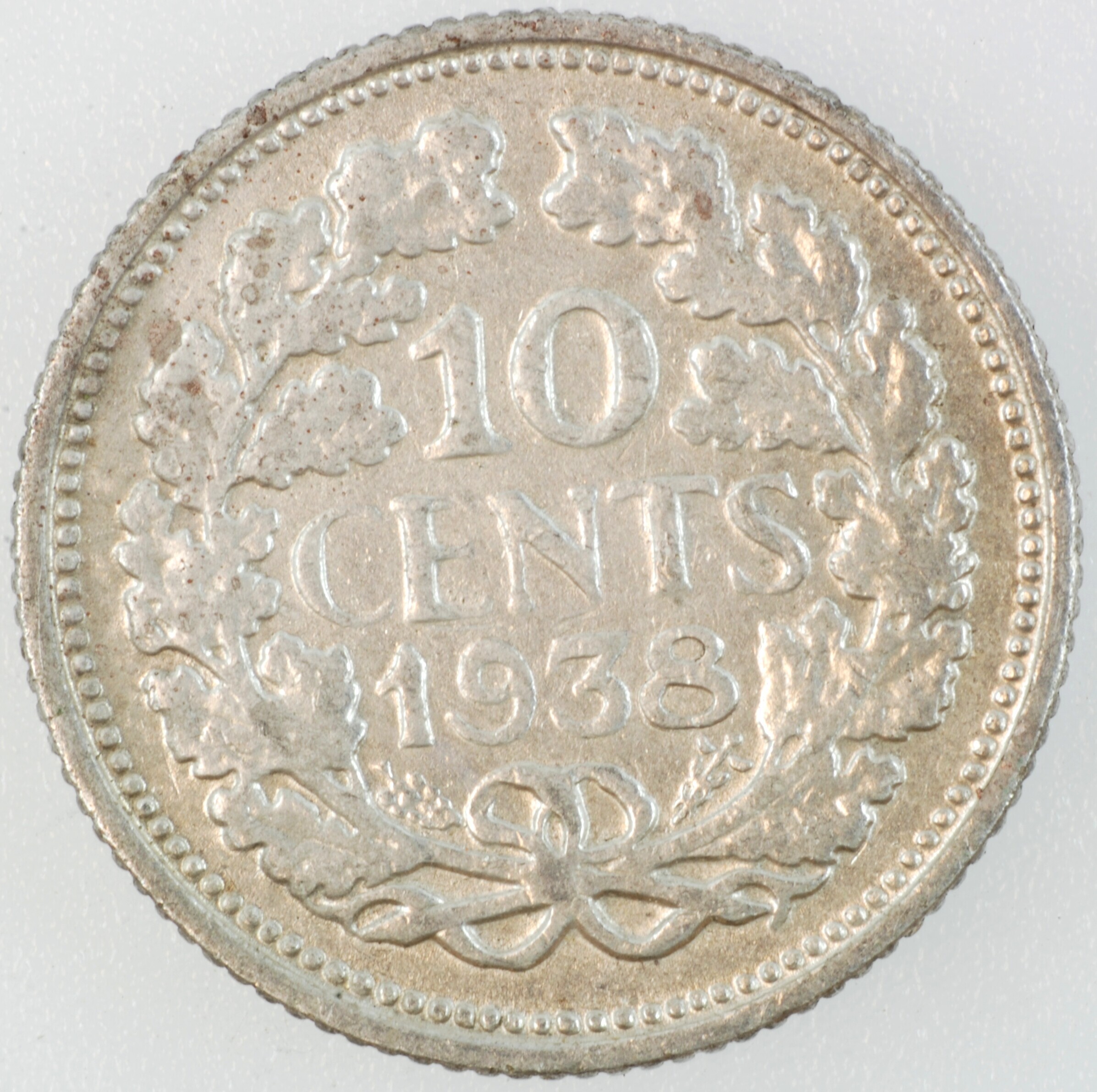Dubbeltje; Nederland Koninkrijk (1813-heden); Wilhelmina (1890-1948); vz.: hoofd naar links, met omschrift WILHELMINA KONINGIN DER NEDERLANDEN; kz.: binnen een bladerkrans in vier regels: 10 / CENTS / 1938 / (druiventros) - (mercuriusstaf); muntplaats: Utrecht; gewicht: 1.34 gram; referentie: Schulman 909