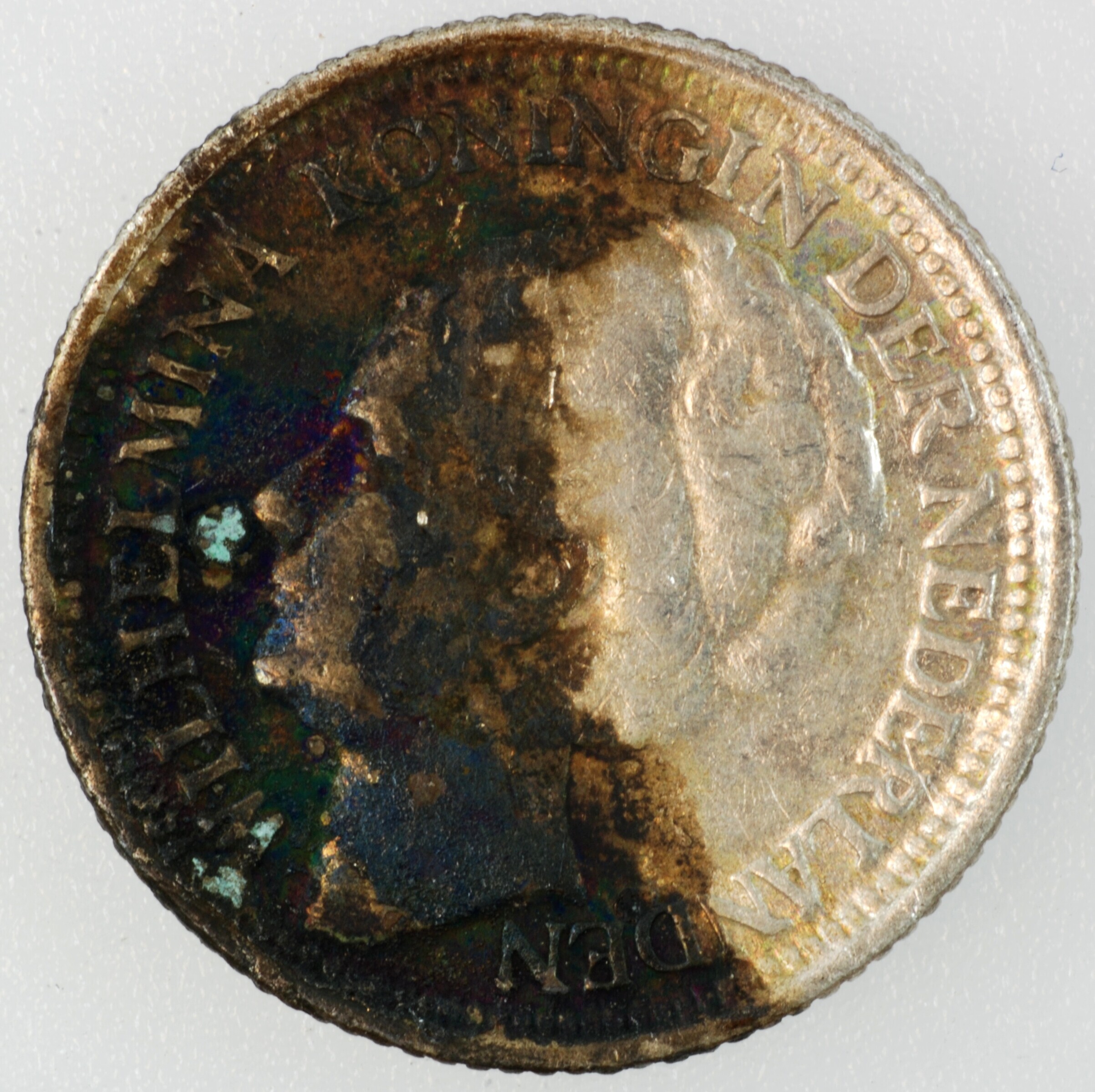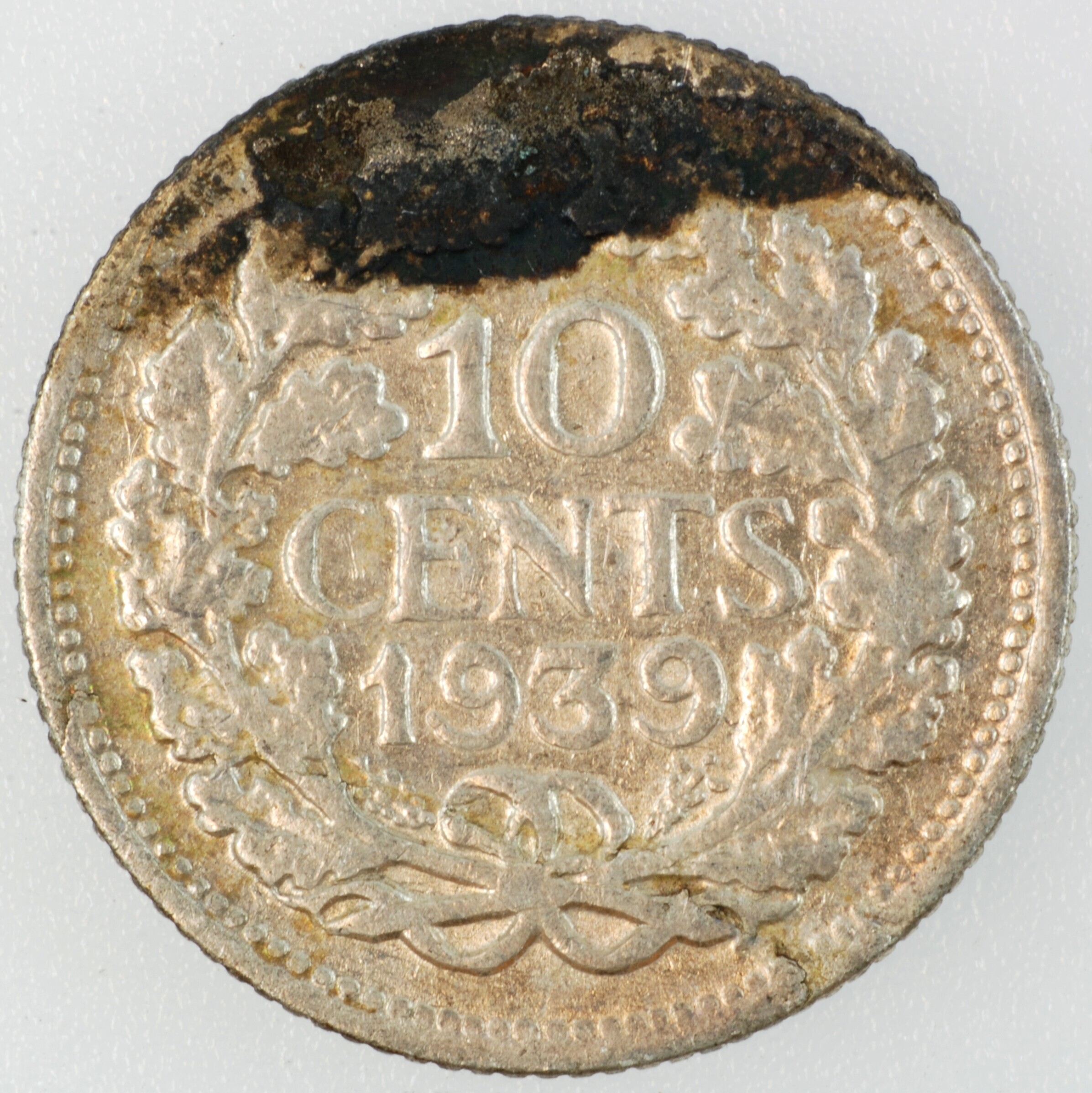 Dubbeltje; Nederland Koninkrijk (1813-heden); Wilhelmina (1890-1948); vz.: hoofd naar links, met omschrift WILHELMINA KONINGIN DER NEDERLANDEN; kz.: binnen een bladerkrans in vier regels: 10 / CENTS / 1939 / (druiventros) - (mercuriusstaf); muntplaats: Utrecht; gewicht: 1.35 gram; referentie: Schulman 910