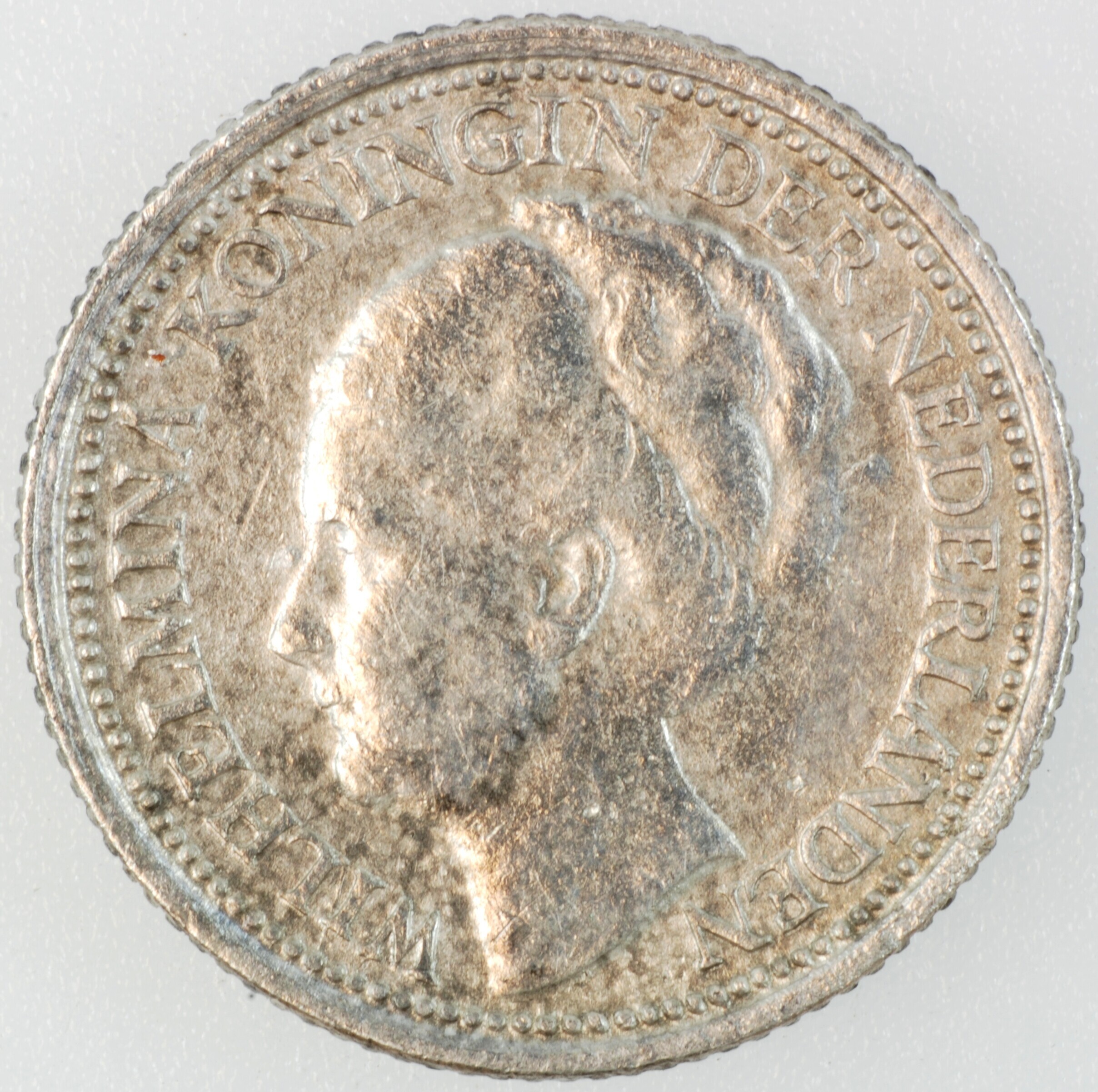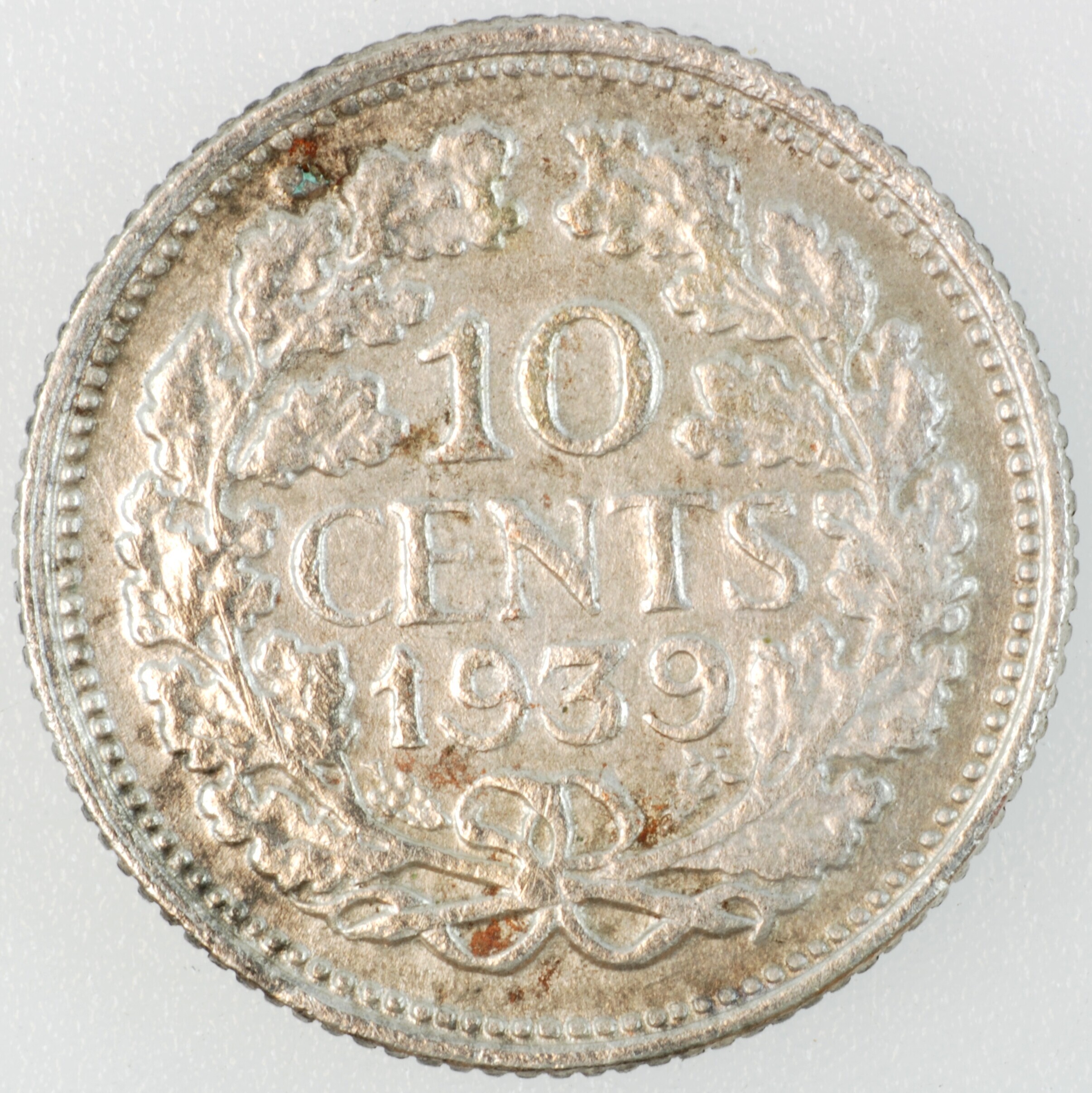 Dubbeltje; Nederland Koninkrijk (1813-heden); Wilhelmina (1890-1948); vz.: hoofd naar links, met omschrift WILHELMINA KONINGIN DER NEDERLANDEN; kz.: binnen een bladerkrans in vier regels: 10 / CENTS / 1939 / (druiventros) - (mercuriusstaf); muntplaats: Utrecht; gewicht: 1.28 gram; referentie: Schulman 910