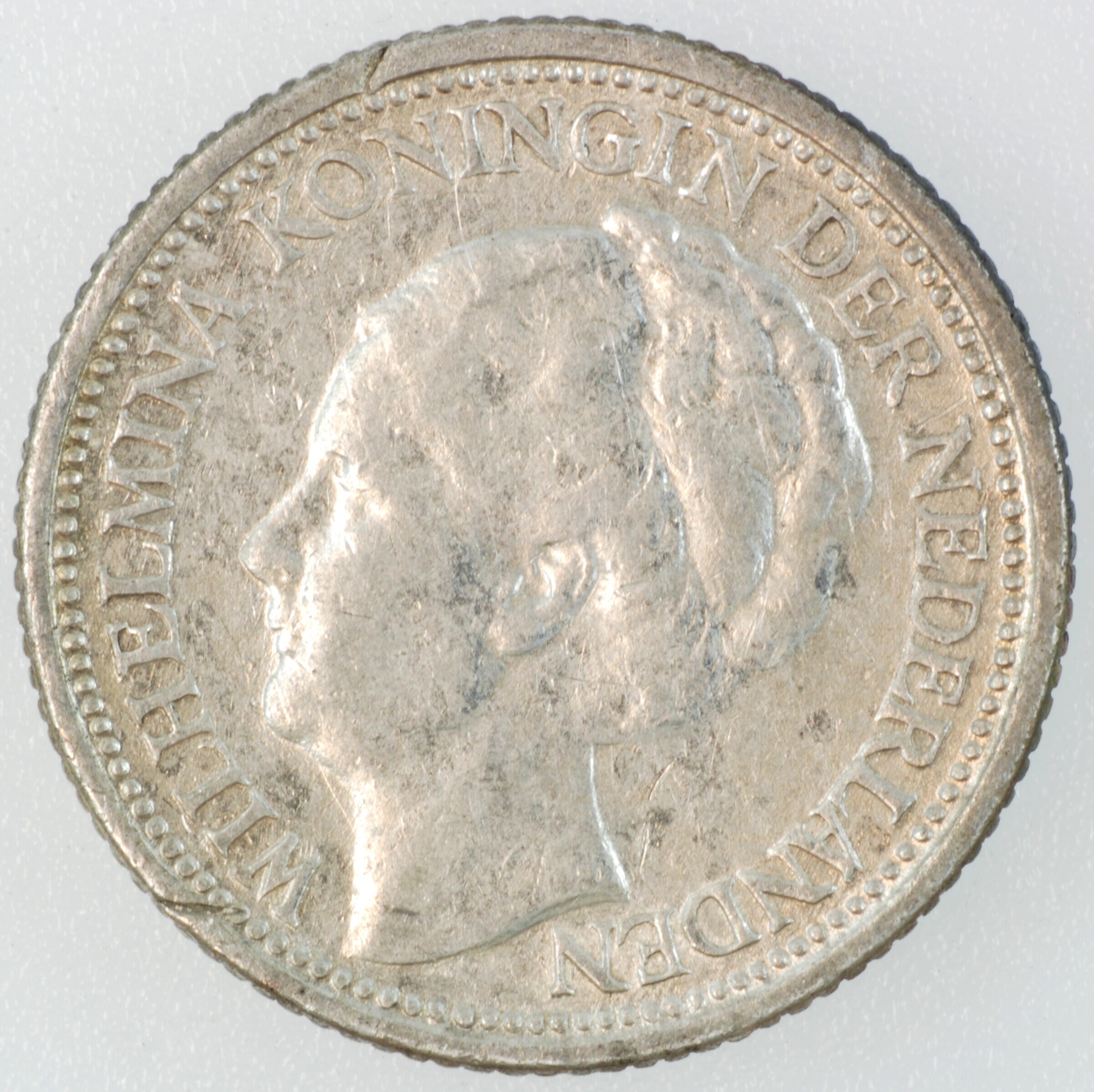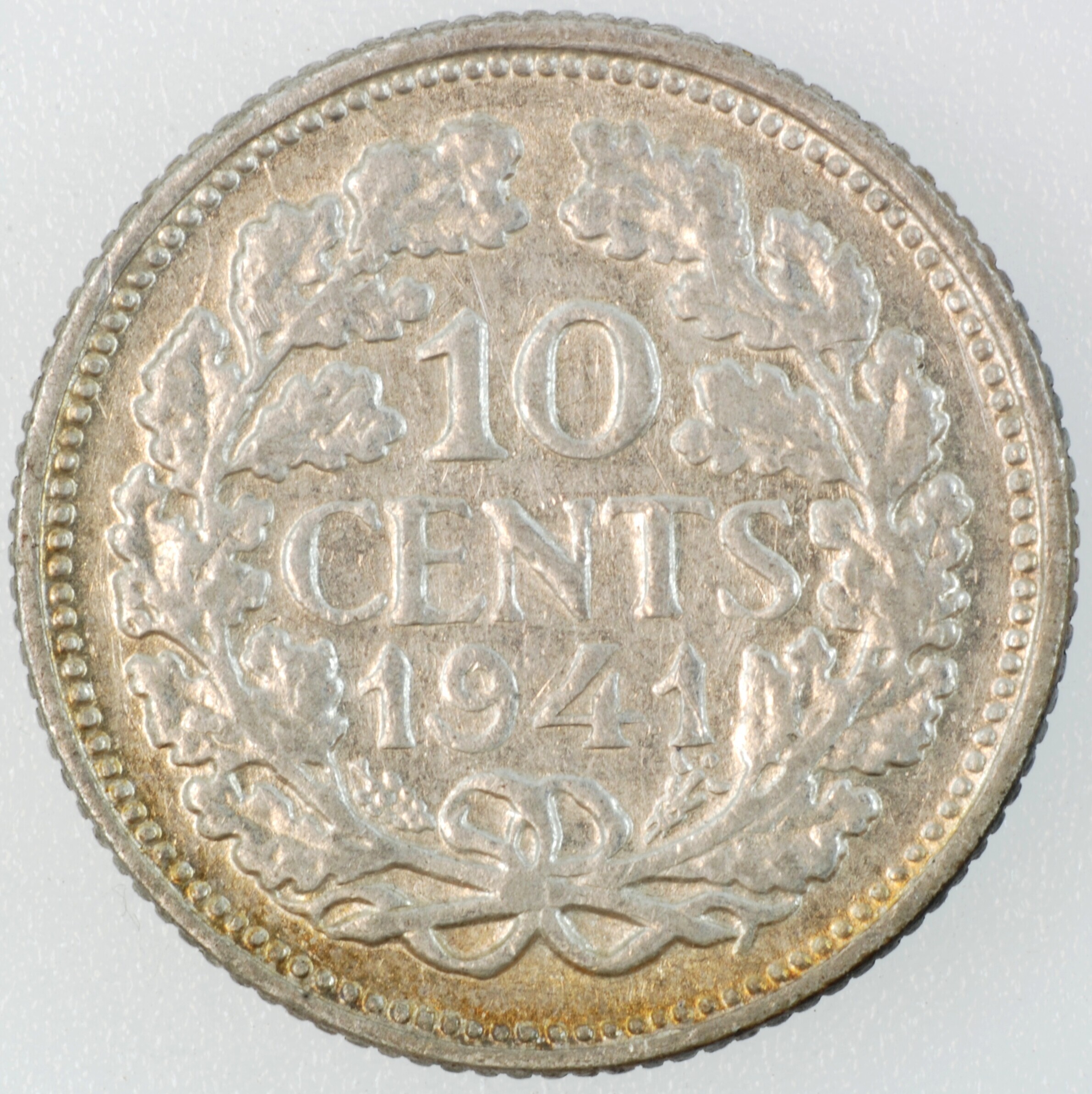 Dubbeltje; Nederland Koninkrijk (1813-heden); Wilhelmina (1890-1948); vz.: hoofd naar links, met omschrift WILHELMINA KONINGIN DER NEDERLANDEN; kz.: binnen een bladerkrans in vier regels: 10 / CENTS / 1941 / (druiventros) - (mercuriusstaf); muntplaats: Utrecht; gewicht: 1.34 gram; referentie: Schulman 911