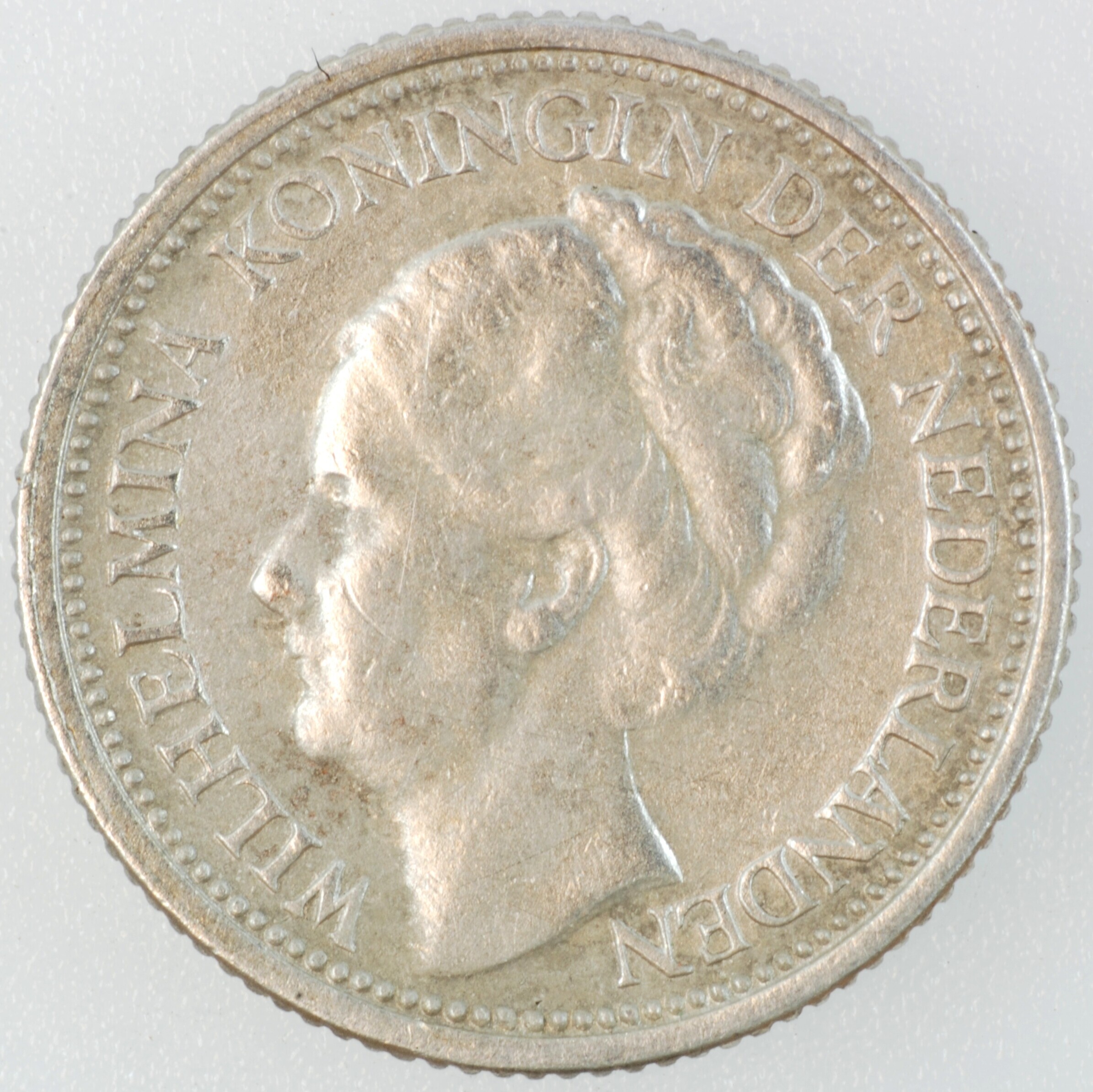Dubbeltje; Nederland Koninkrijk (1813-heden); Wilhelmina (1890-1948); vz.: hoofd naar links, met omschrift WILHELMINA KONINGIN DER NEDERLANDEN; kz.: binnen een bladerkrans in vier regels: 10 / CENTS / 1941 / (druiventros) - (mercuriusstaf); muntplaats: Utrecht; gewicht: 1.36 gram; referentie: Schulman 911