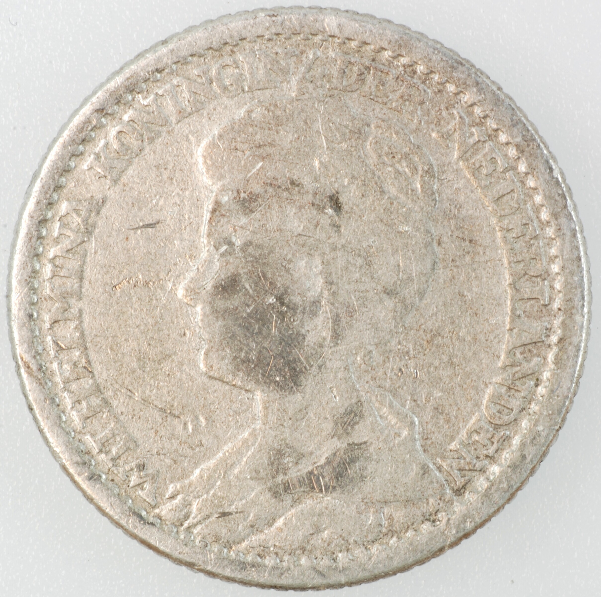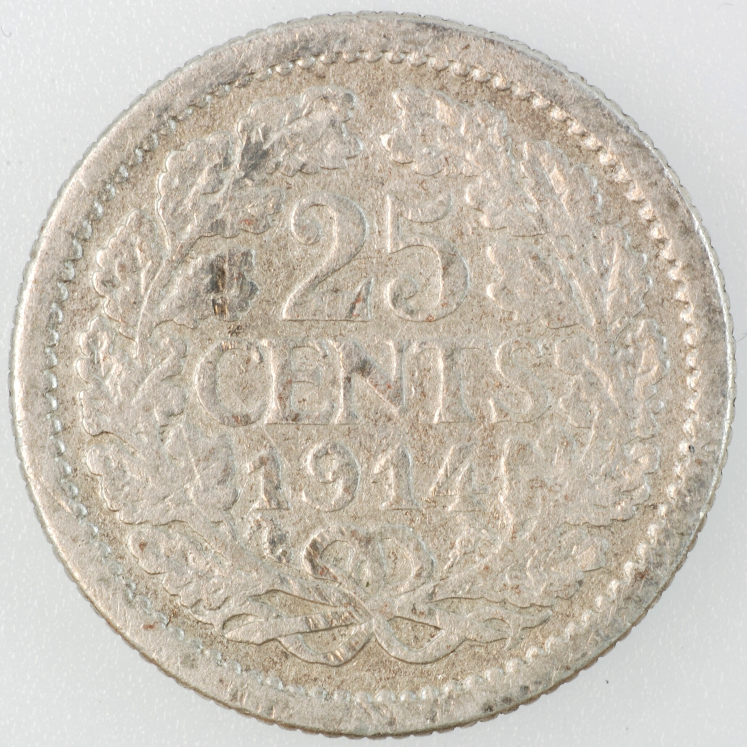 Kwartje; Nederland Koninkrijk (1813-heden); Wilhelmina (1890-1948); vz.: hoofd met diadeem naar links, met omschrift WILHELMINA KONINGIN DER NEDERLANDEN; kz.: binnen een bladerkrans in vier regels: 25 / CENTS / 1914 / (hellebaard) - (mercuriusstaf); muntplaats: Utrecht; gewicht: 3.36 gram; referentie: Schulman 864