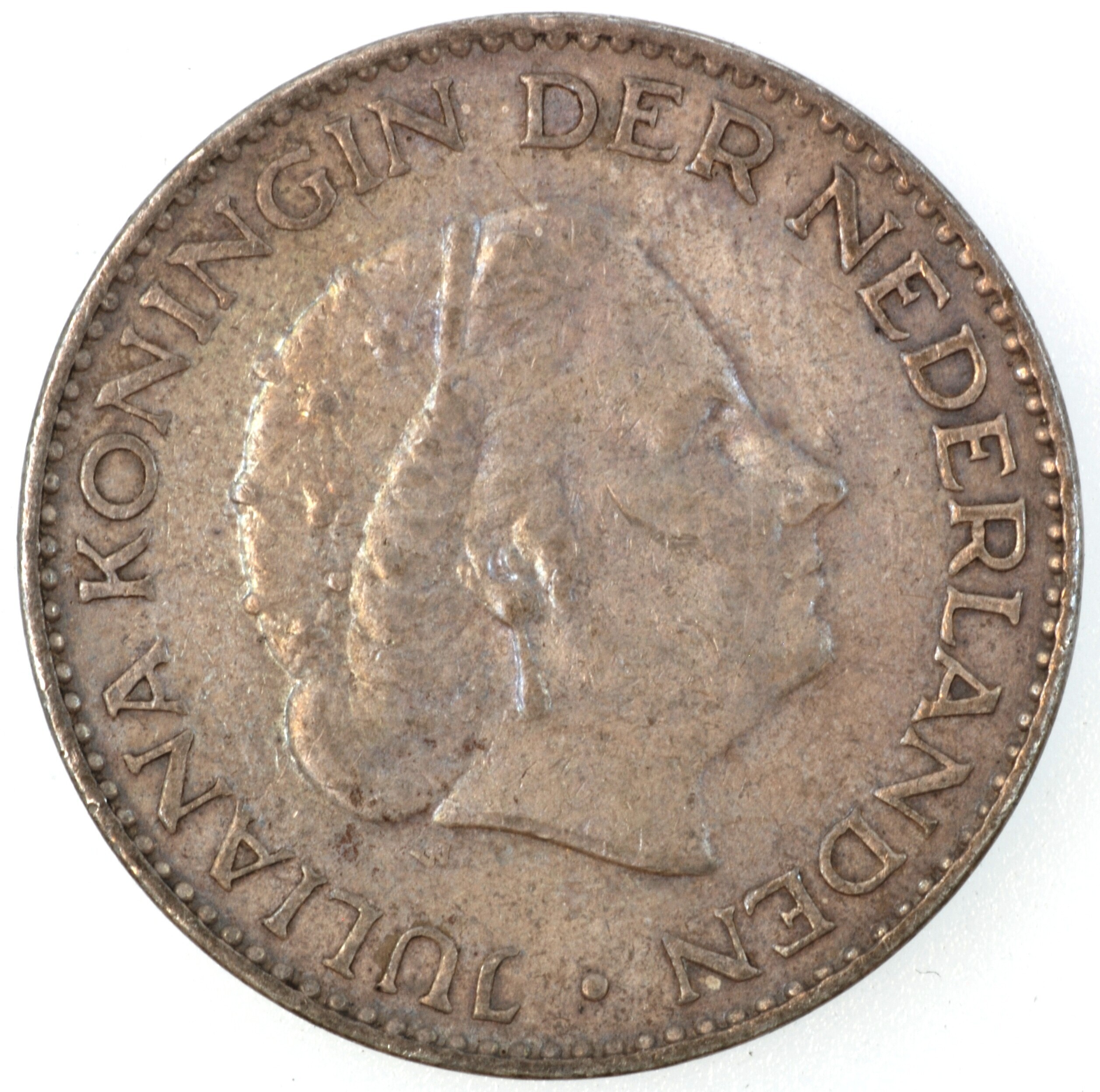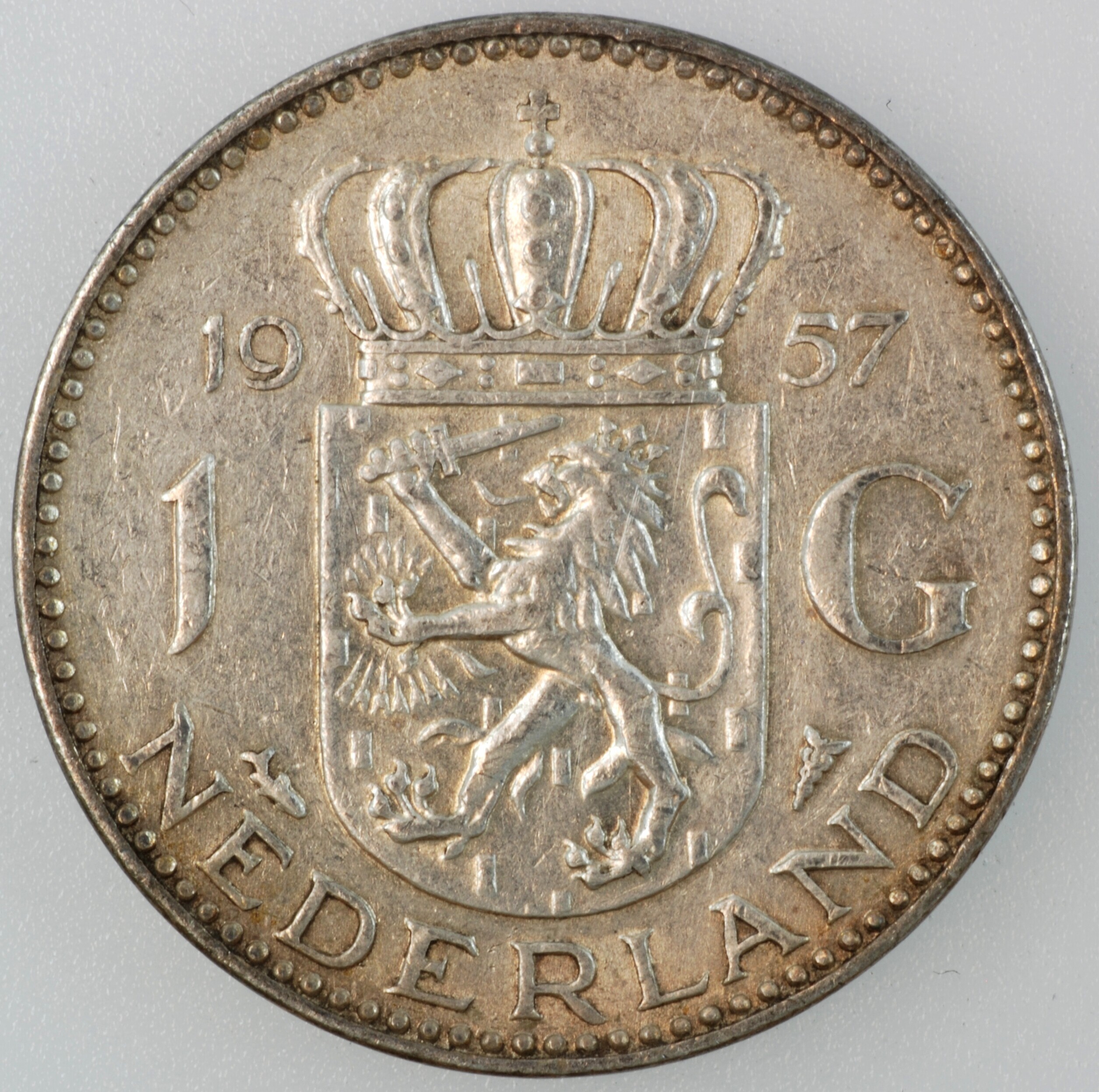 Gulden; Nederland Koninkrijk (1813-heden); Juliana (1948-1980); vz.: hoofd naar links met W aan onderzijde van de nek, met omschrift JULIANA KONINGIN DER NEDERLANDEN•; kz.: gekroond wapenschild met klimmende leeuw naar links met ter weerszijden 19 – 57 / 1 – G / (vis) – (mercuriusstaf) en aan onderzijde NEDERLAND; muntplaats: Utrecht; gewicht: 6.40 gram; referentie: ...
