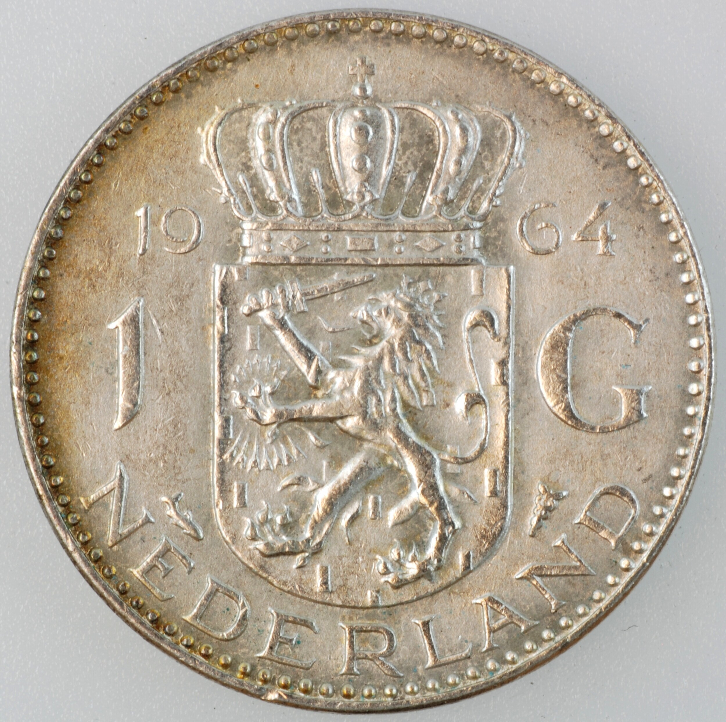 Gulden; Nederland Koninkrijk (1813-heden); Juliana (1948-1980); vz.: hoofd naar links met W aan onderzijde van de nek, met omschrift JULIANA KONINGIN DER NEDERLANDEN•; kz.: gekroond wapenschild met klimmende leeuw naar links met ter weerszijden 19 – 64 / 1 – G / (vis) – (mercuriusstaf) en aan onderzijde NEDERLAND; muntplaats: Utrecht; gewicht: 6.46 gram; referentie: ...