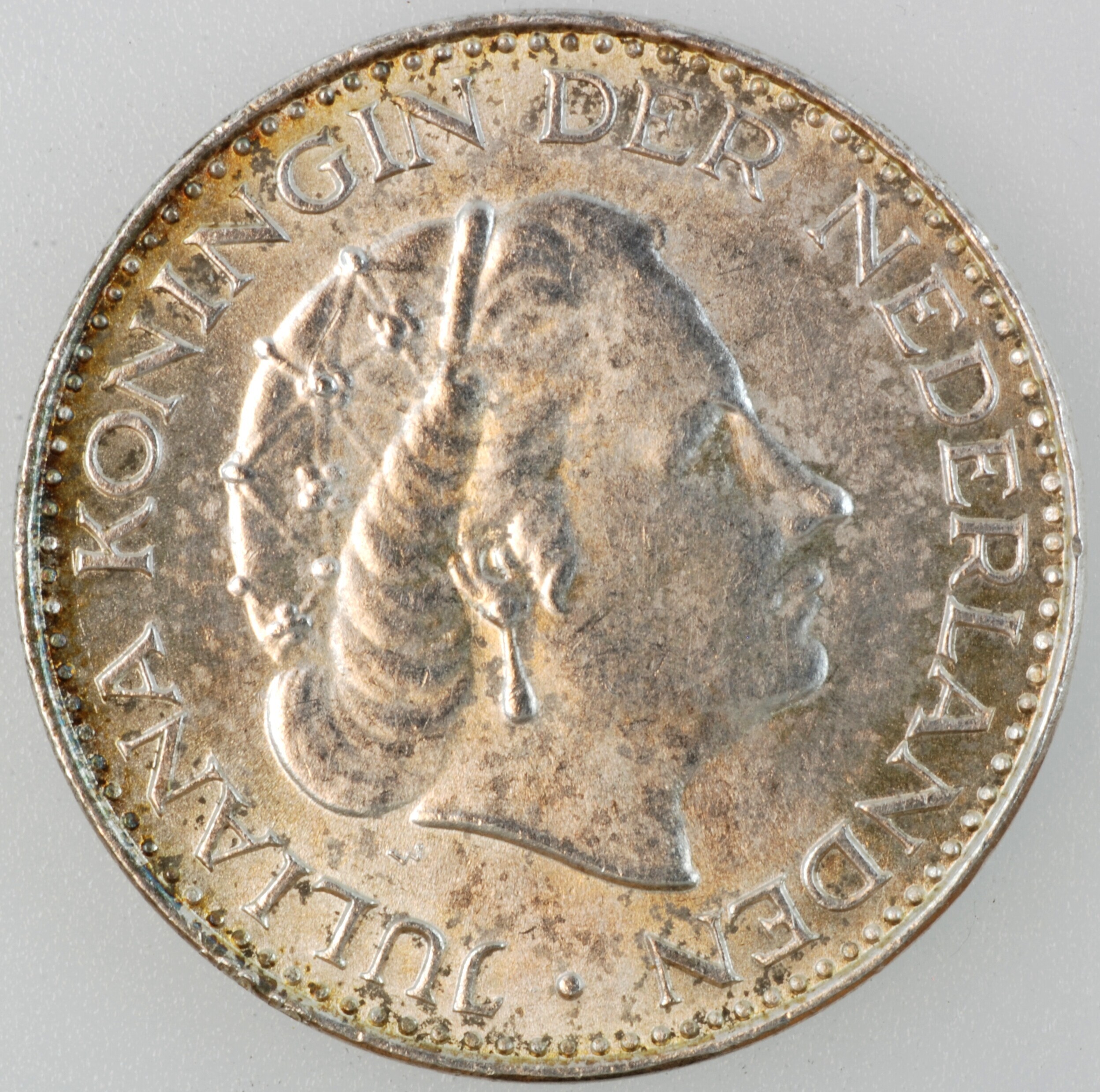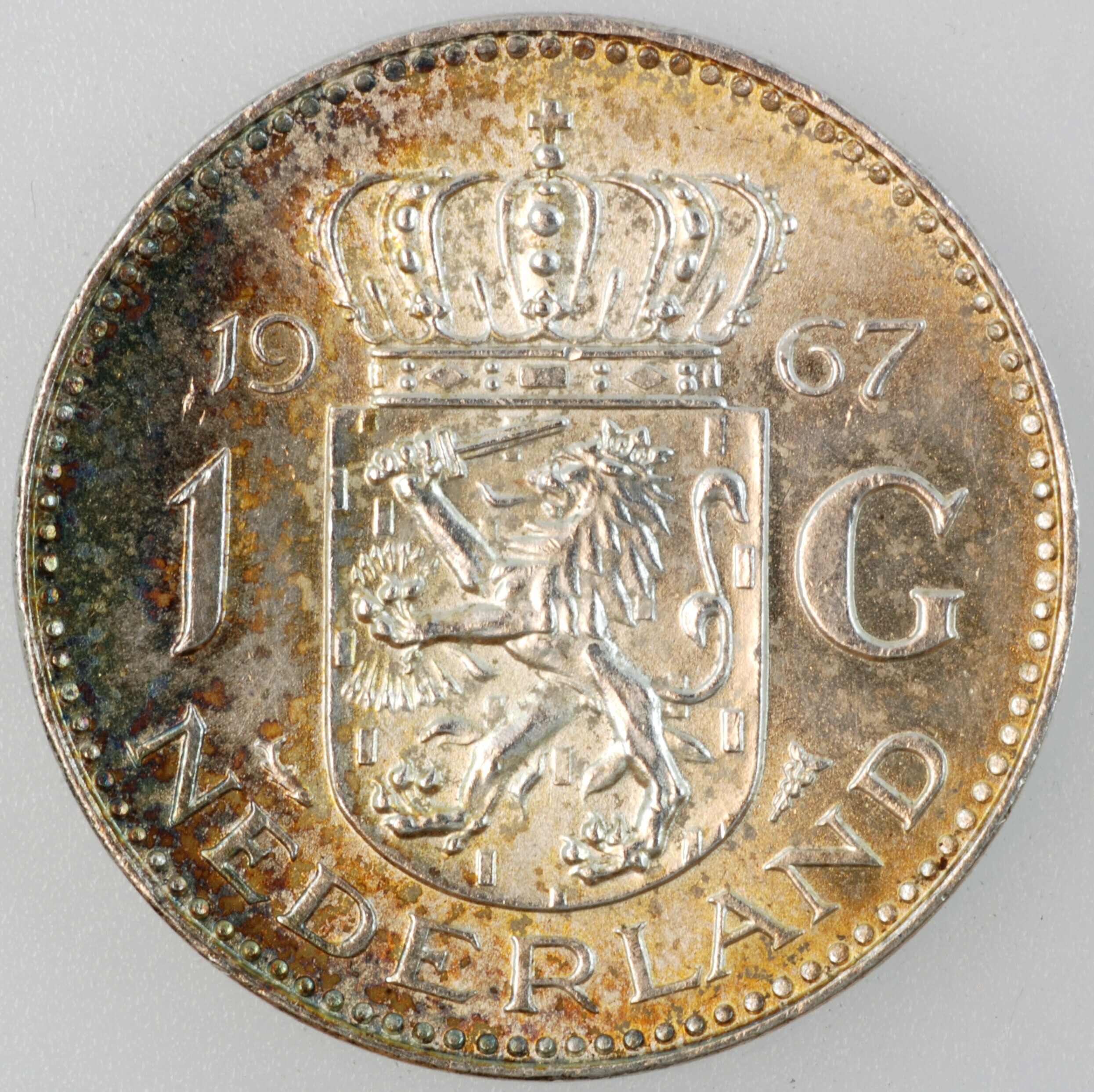 Gulden; Nederland Koninkrijk (1813-heden); Juliana (1948-1980); vz.: hoofd naar links met W aan onderzijde van de nek, met omschrift JULIANA KONINGIN DER NEDERLANDEN•; kz.: gekroond wapenschild met klimmende leeuw naar links met ter weerszijden 19 – 67 / 1 – G / (vis) – (mercuriusstaf) en aan onderzijde NEDERLAND; muntplaats: Utrecht; gewicht: 6.47 gram; referentie: ...