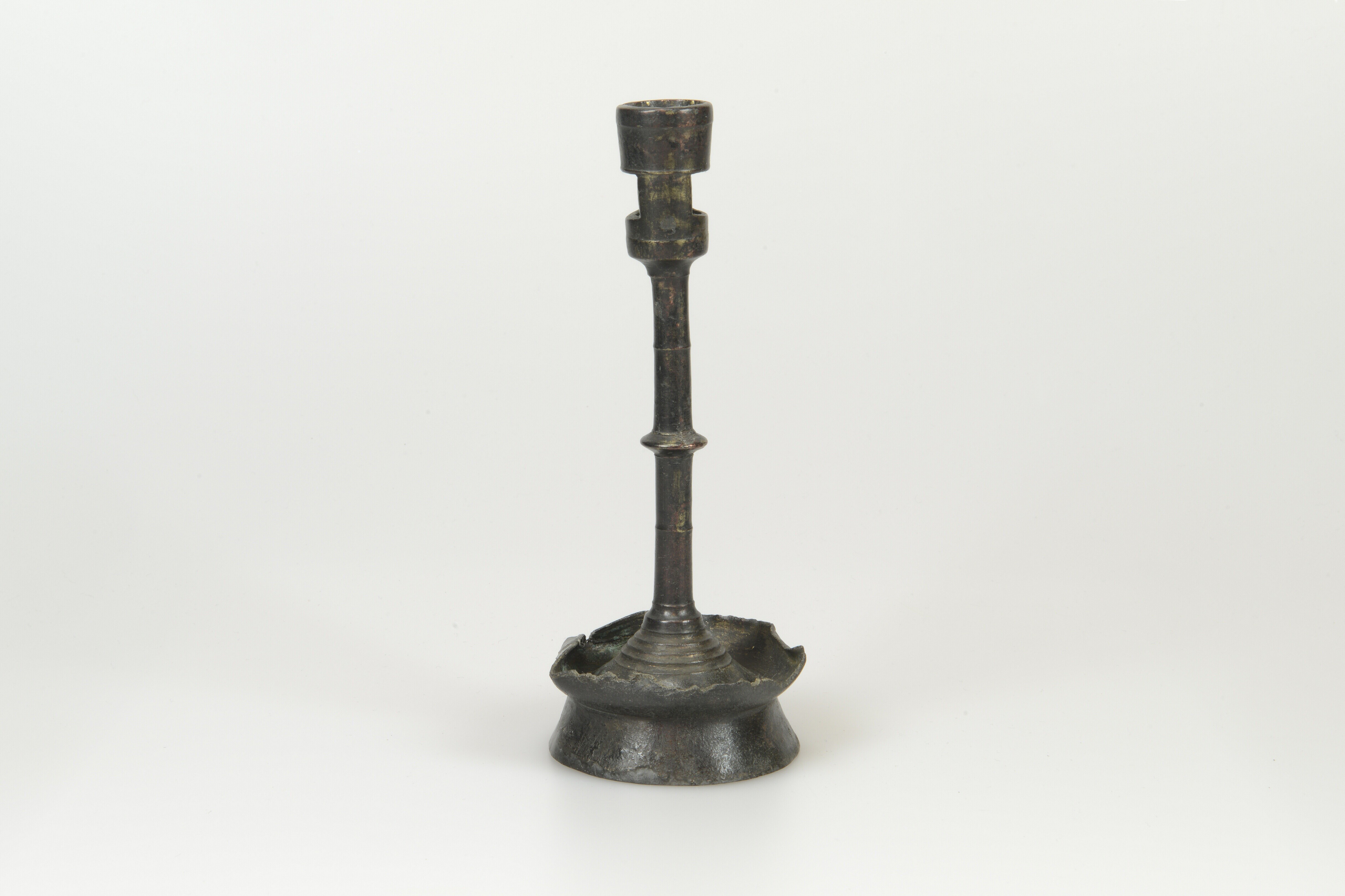 Knoopkandelaar; ronde voet met kraagrand, ronde stam met halverwege een knopversiering; cilindrische kaarsenhouder met twee rechthoekige lekgaten