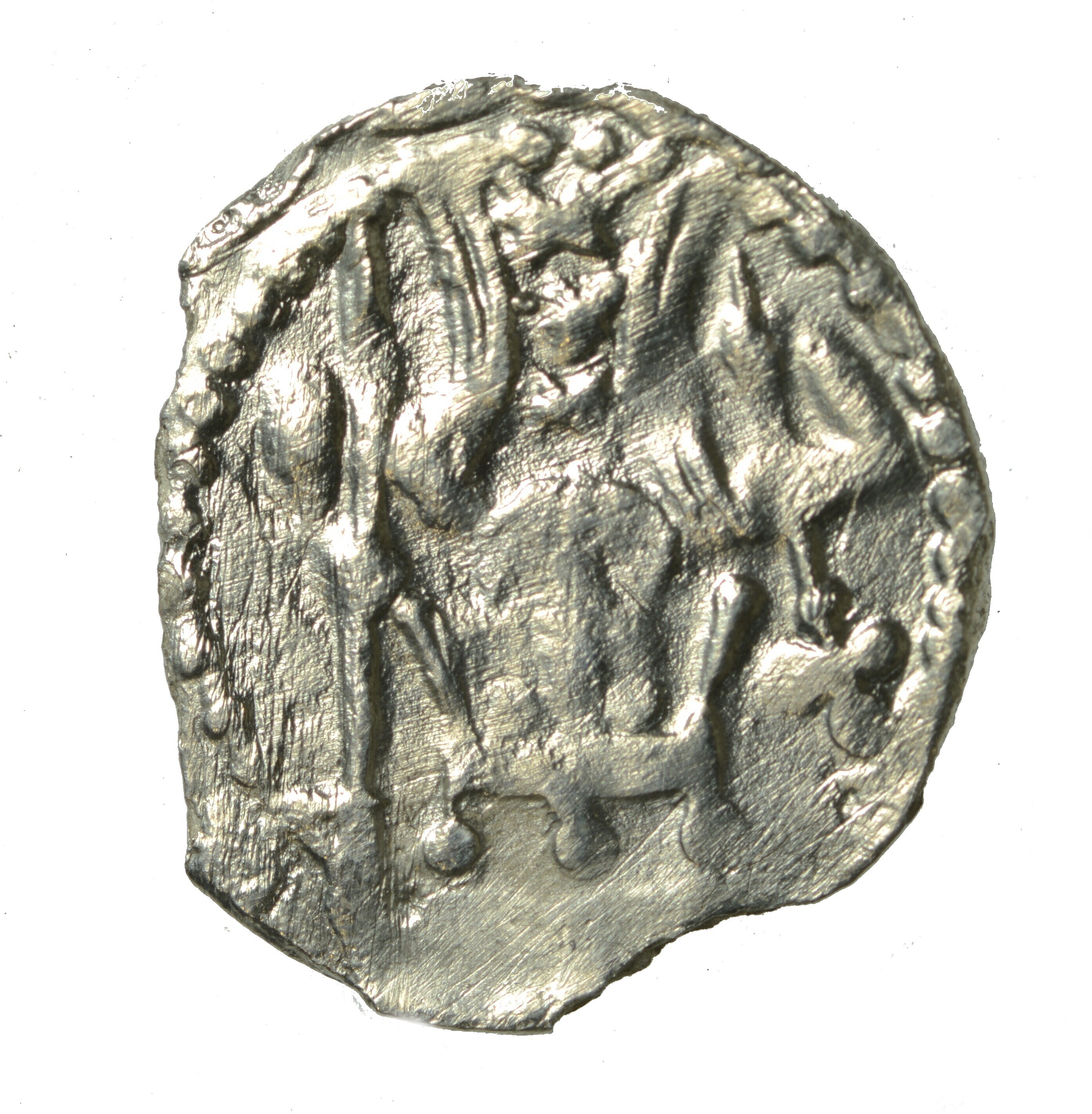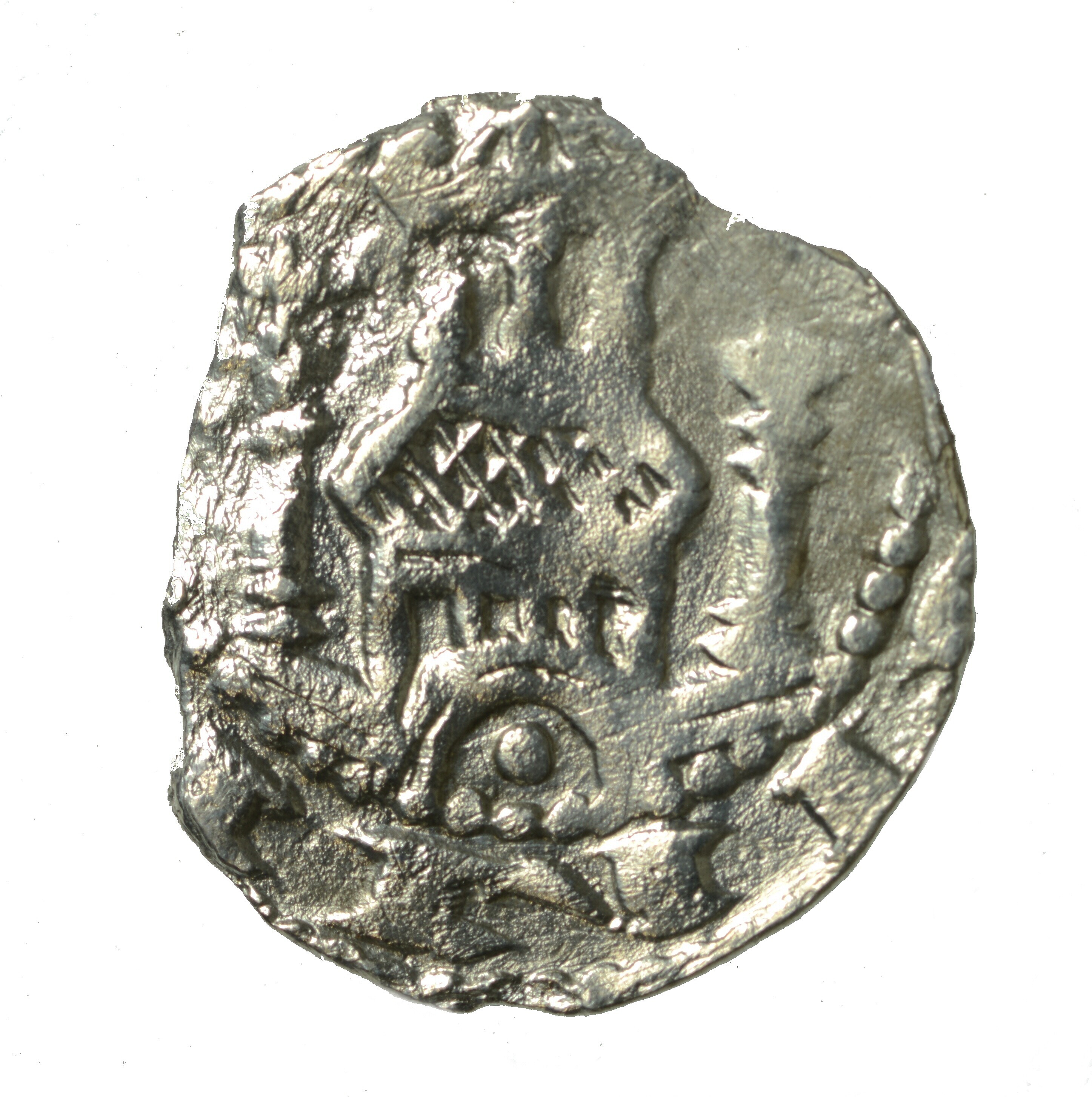 Penning; Hendrik VII (1220-1235); vz.: de keizer, koning of regent afgebeeld tot aan het middel, en face met in linkerhand een bolkruisscepter en in rechterhand een speer, die doorloopt tot in de muntrand. De kleding is versiert met drie vijfbladige bloemen.Omschrift: “[+ H ?] N + [R I C (vs)]; kz.: Binnen parelcirkel een grote ...