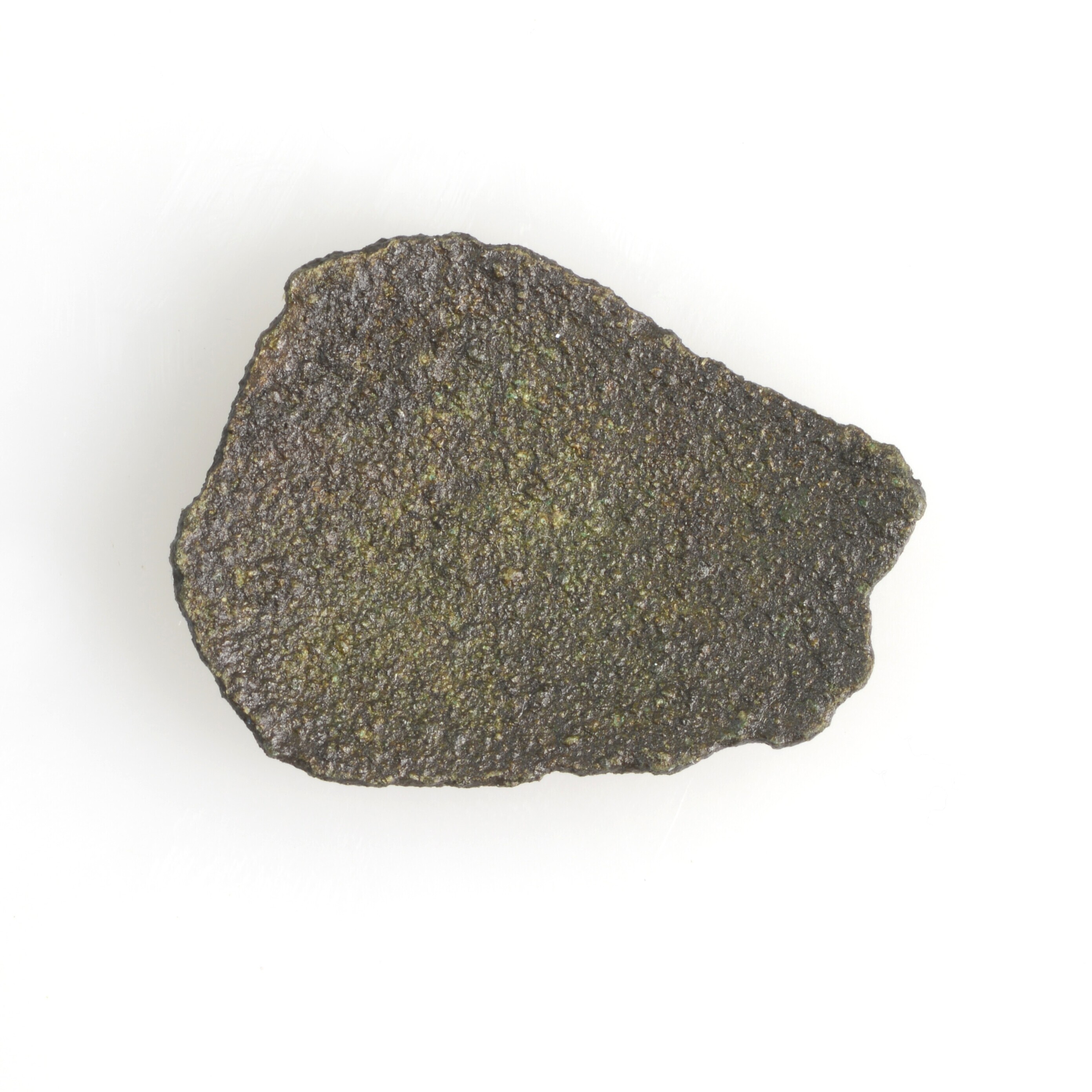 Brilfibula; type Oerel; deel van een decoratieplaat, waarop versiering te zien is in de vorm van een punt met twee cirkels, in dit geval vergezeld van een deel van een (vermoedelijk hoefijzervormige) band; vindplaats: Texel, Den Burg, Akenbuurt, Pontweg, Rozendijk, Laanweg