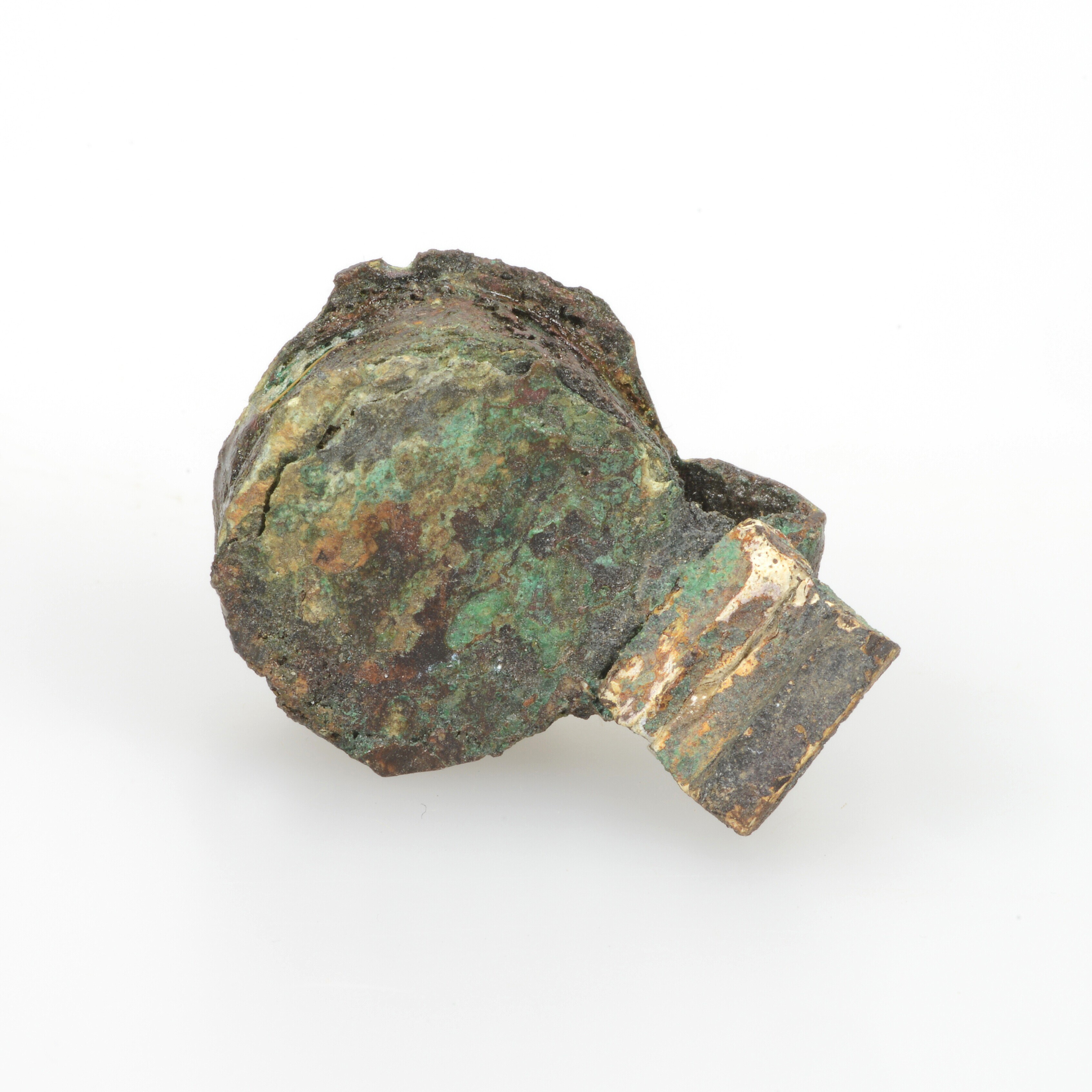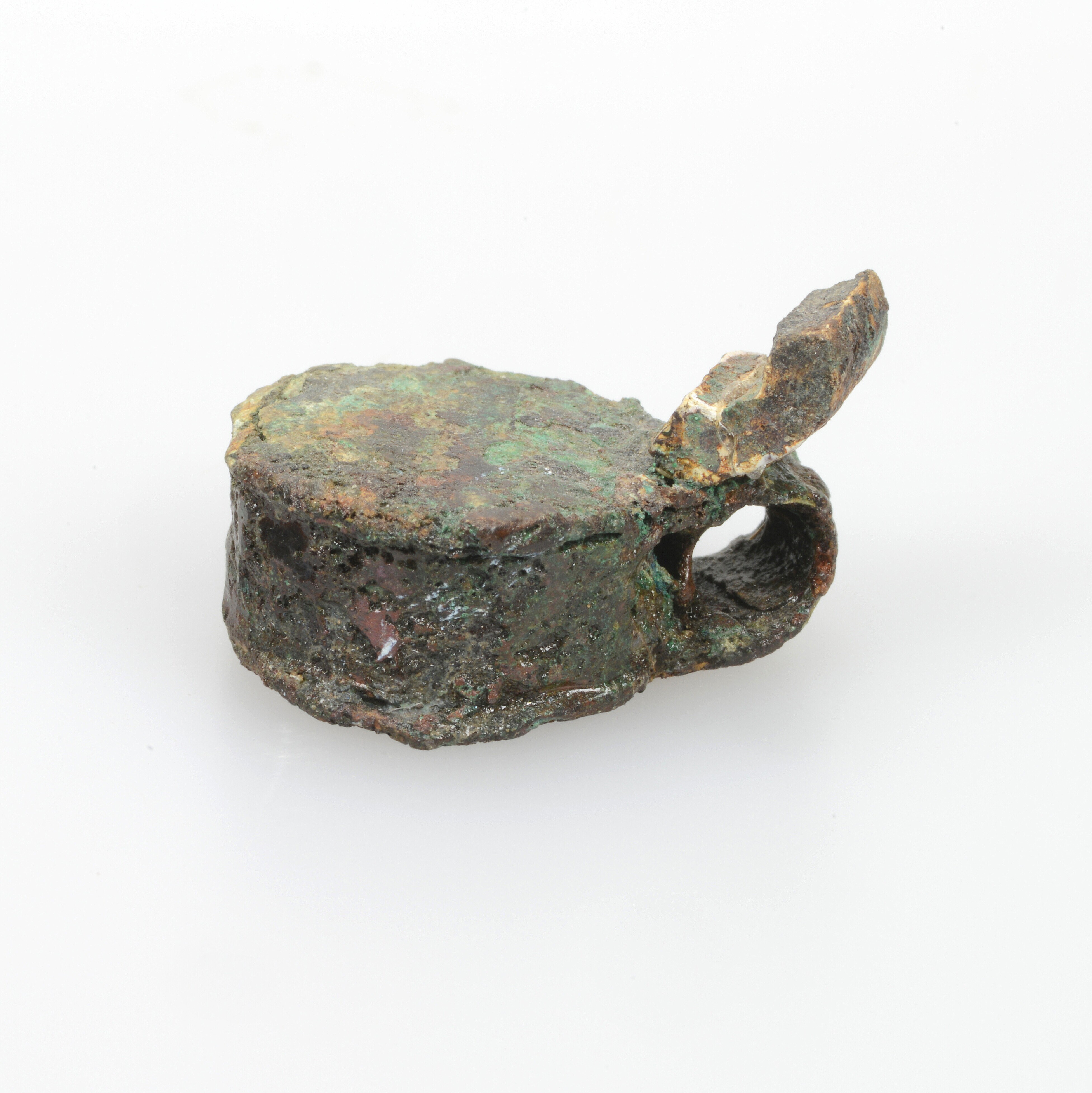 Hanger; capsulevormige hanger van bronsblik; hol, rond van vorm en onversierd. De beugel die beide delen met elkaar verbindt is breed en rechthoekig