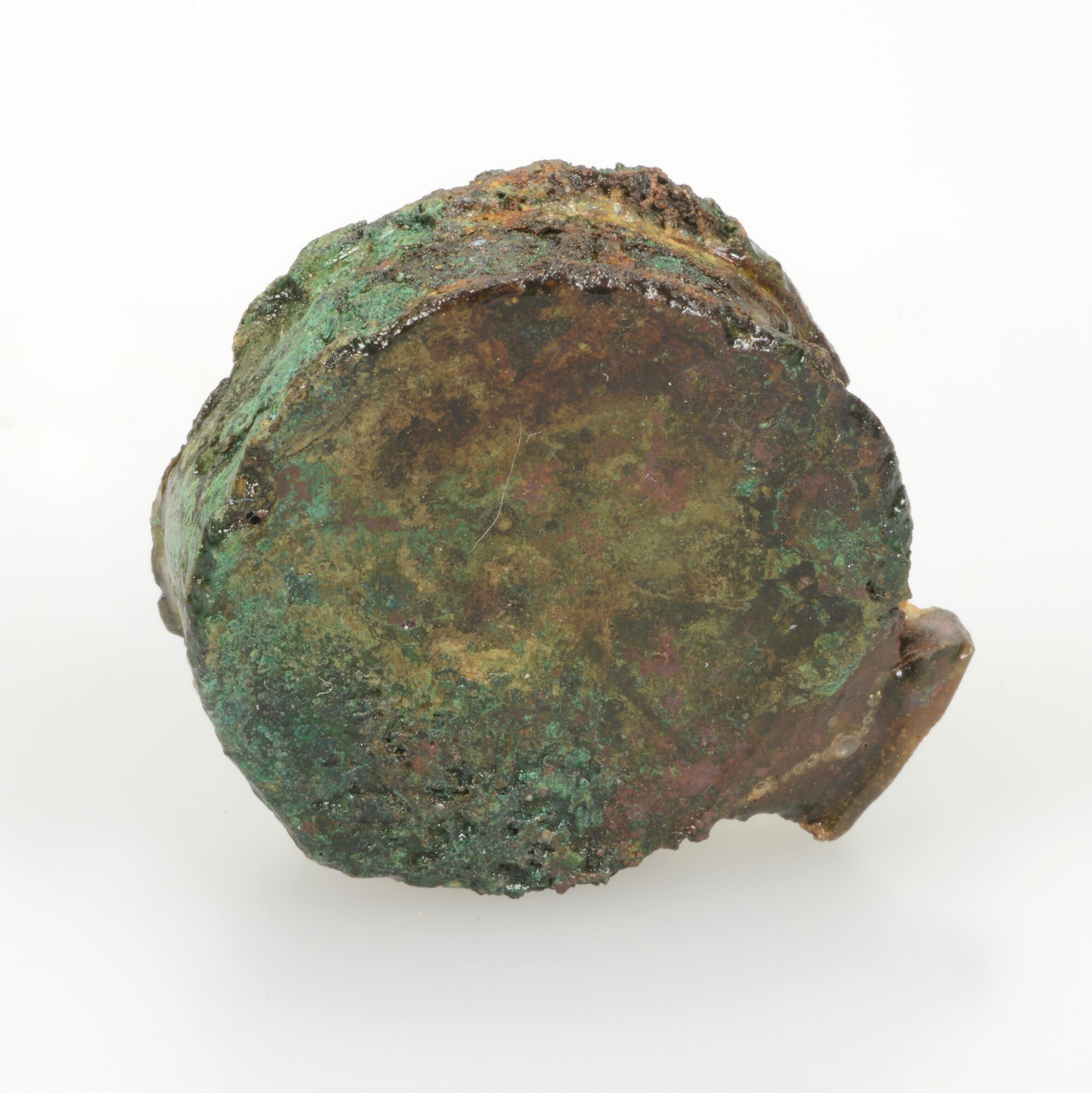 Hanger; capsulevormige hanger van bronsblik; hol, rond van vorm en onversierd. De beugel die beide delen met elkaar verbindt is breed en rechthoekig
