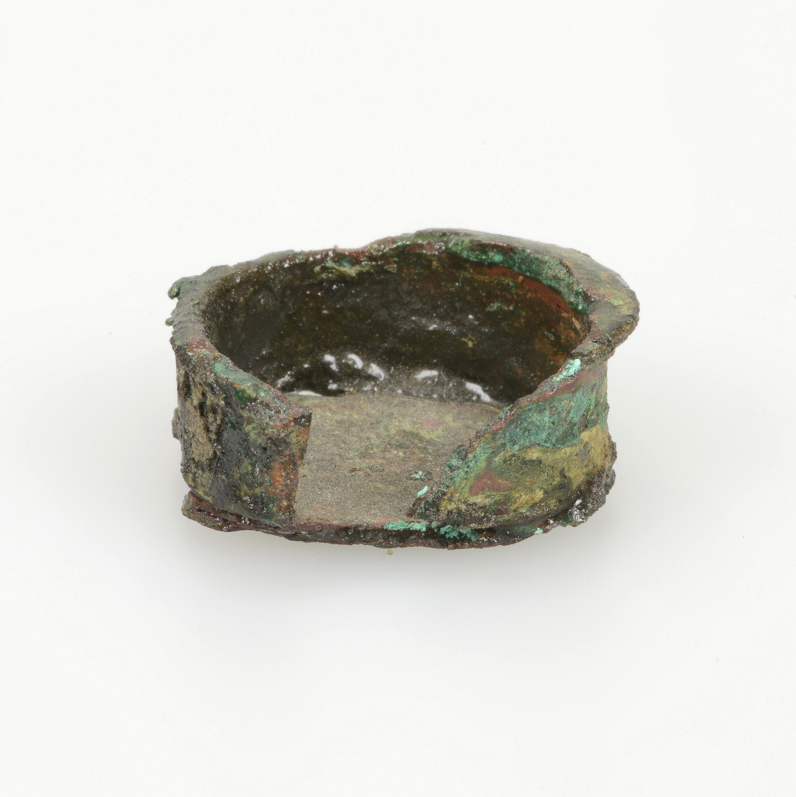 Hanger; capsulevormige hanger van bronsblik; hol, rond van vorm en onversierd. De beugel die beide delen met elkaar verbindt is breed en rechthoekig