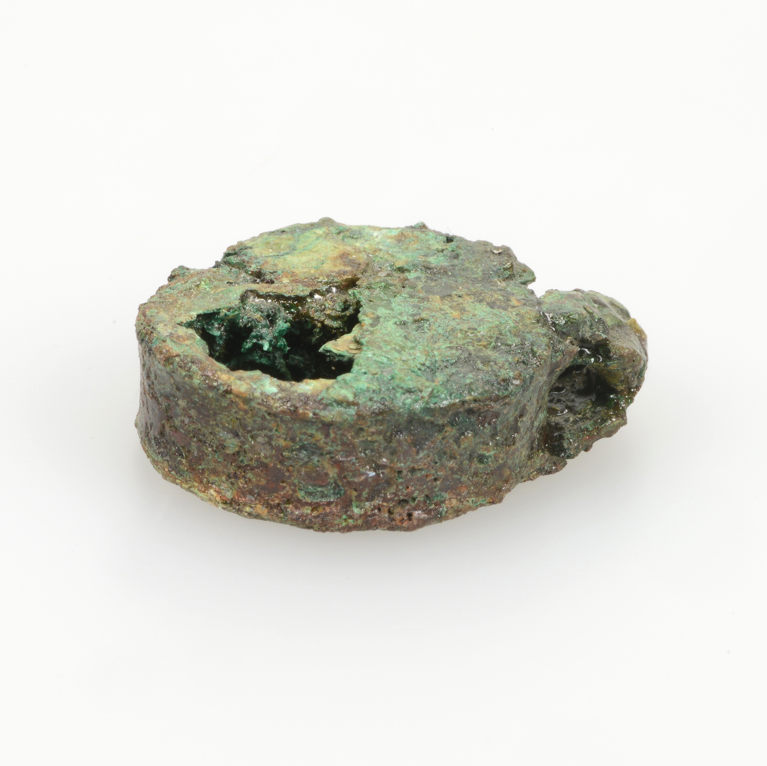 Hanger; capsulevormige hanger van bronsblik; hol, rond van vorm en onversierd. De beugel die beide delen met elkaar verbindt is breed en rechthoekig
