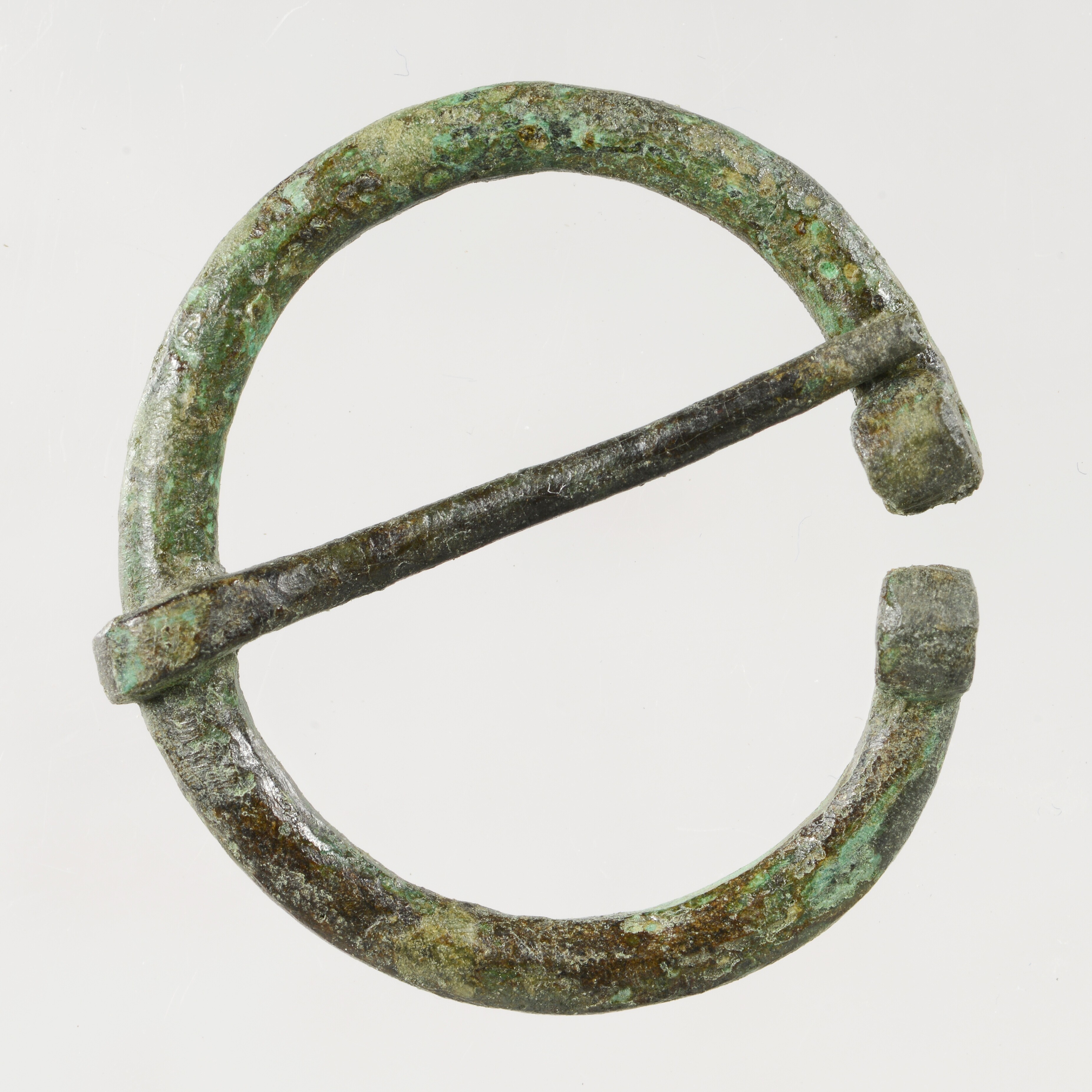 Ringfibula (met naald 5354-22); ronde doorsnede, uitlopend in afgeplatte uiteinden die zijn opgerold en zo knoppen vormen