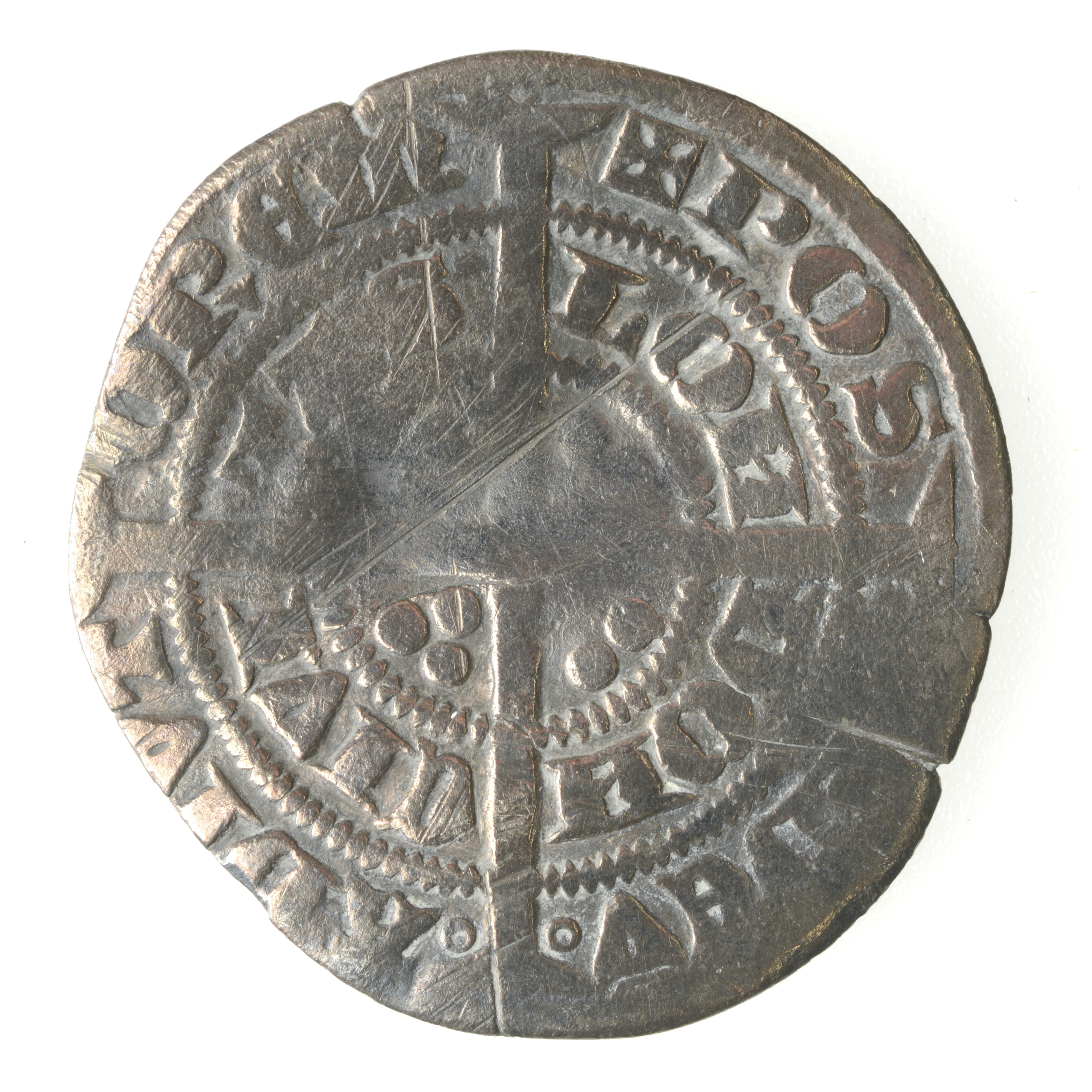 Halve Groot; Koninkrijk Engeland (c. 927-1707); Edward III (1327-1377); vz.: gekroond hoofd en omschrift EDWARDVS REX ANGLI Z FRANCI; kz.: long cross met tekst in binnencirkel CIVI TAS LON DON en omschrift POSVI DEV ADIVTOREM; muntplaats: Londen; gewicht: 1.79 gram