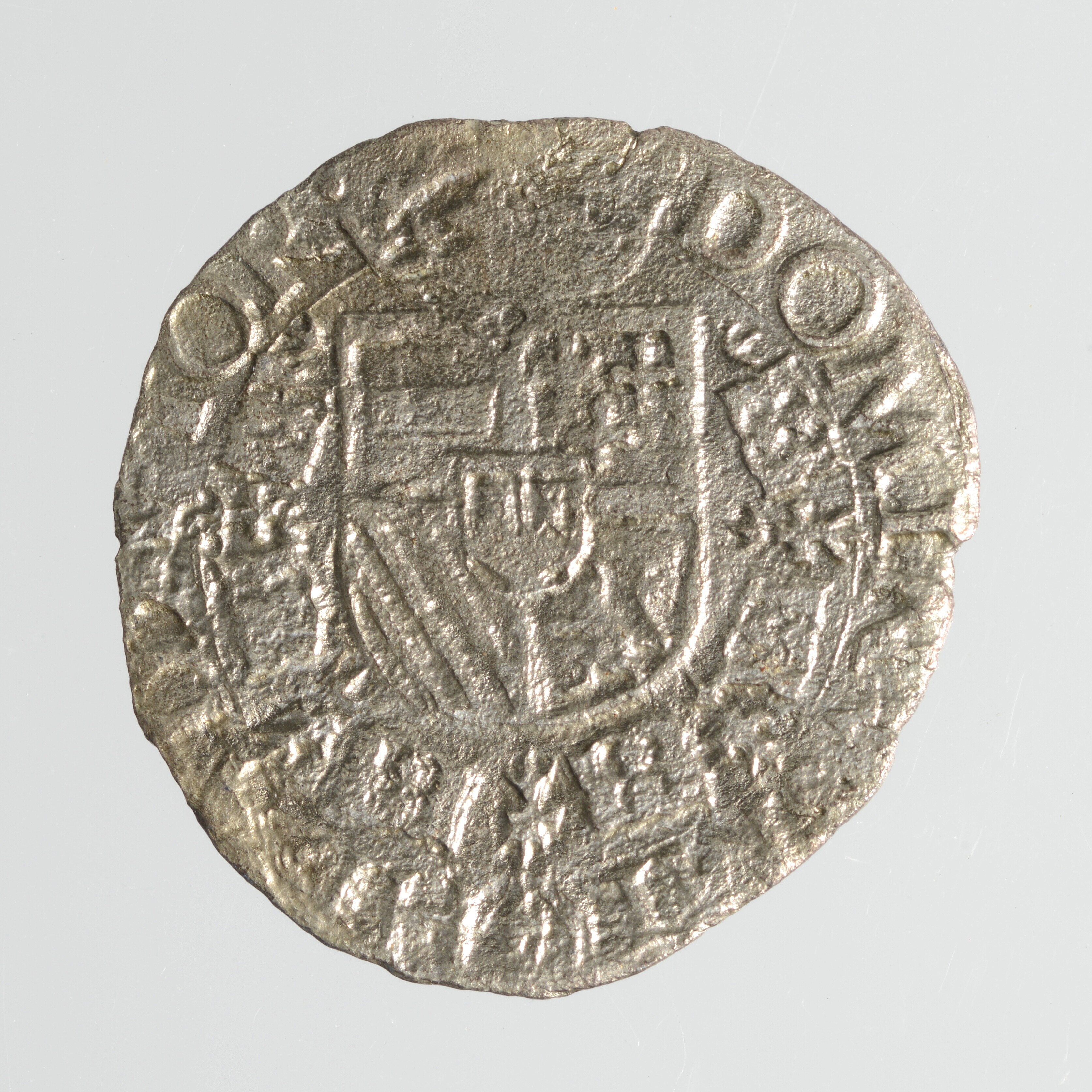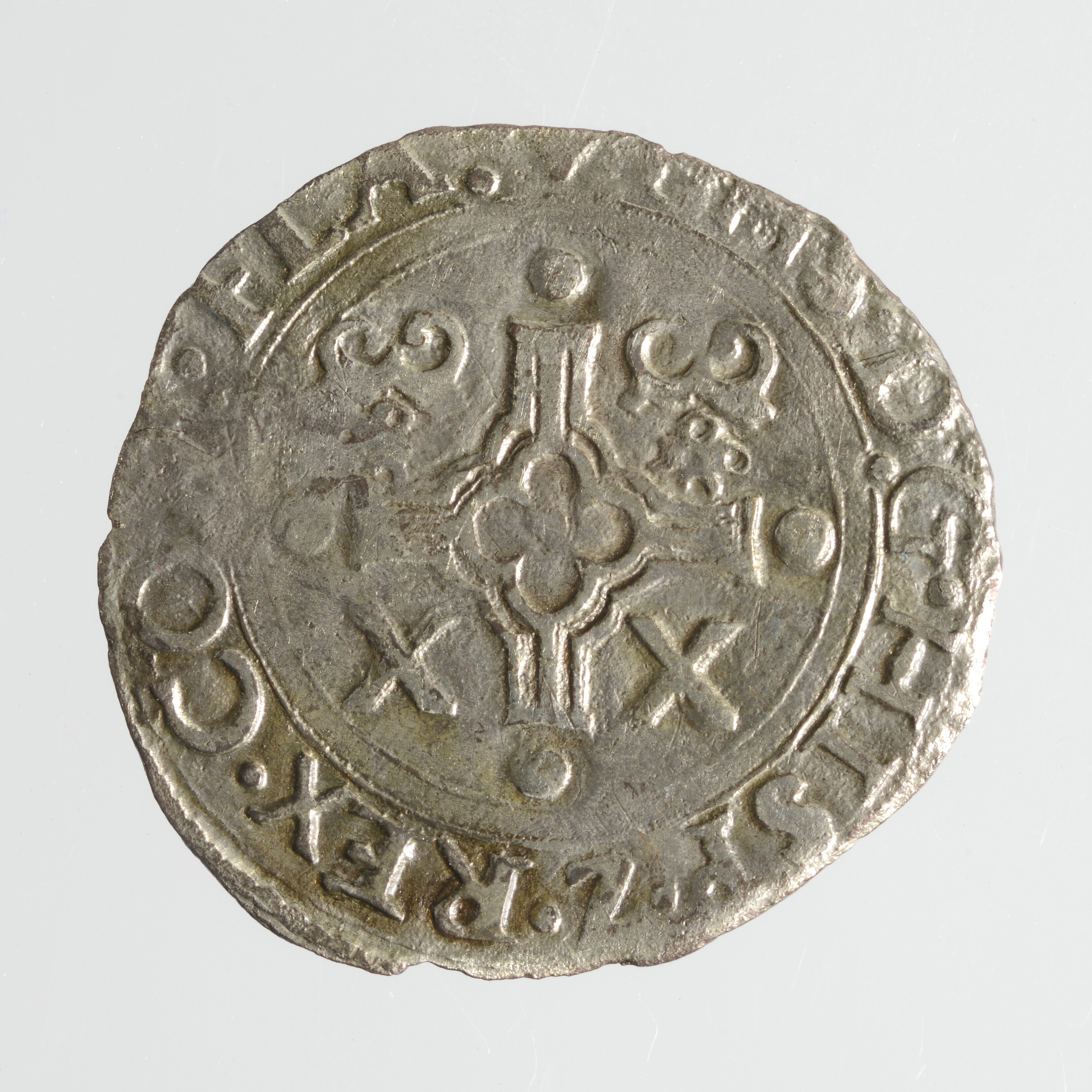 Twintigste Philipsdaalder; Vlaanderen; Philips II (1527-1598); vz.: kruis met twee vuurslagen en X X; Lelie en omschrift PHS.D:G.HISP.REX.COMES.FLA; kz.: wapen van Oostenrijk-Bourgondië, gekroond en omhangen met keten van de orde van het gulden vlies, omschrift DOMINVS.MIHI.ADIVTOR; Muntplaats: Brugge; gewicht: 1.46 gram