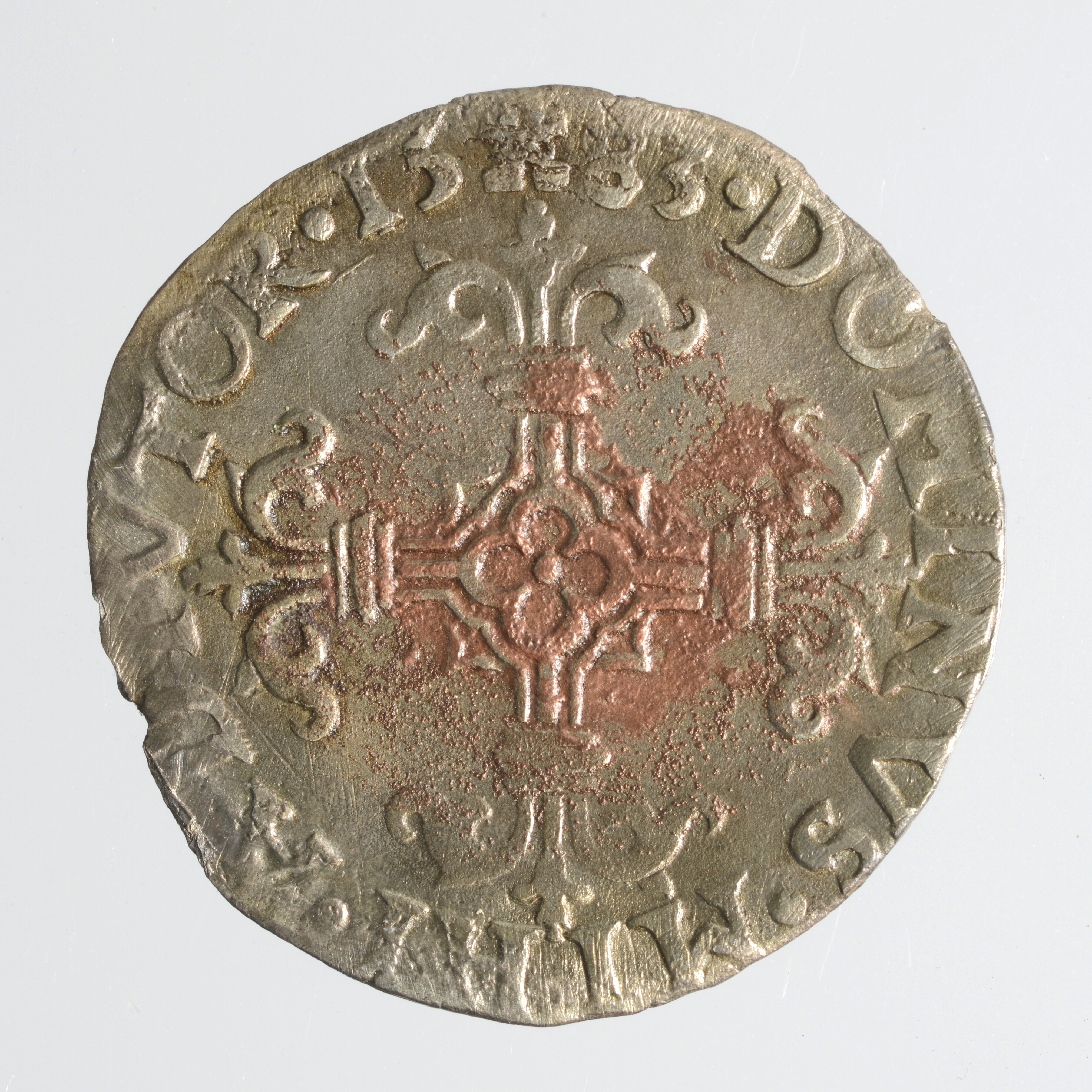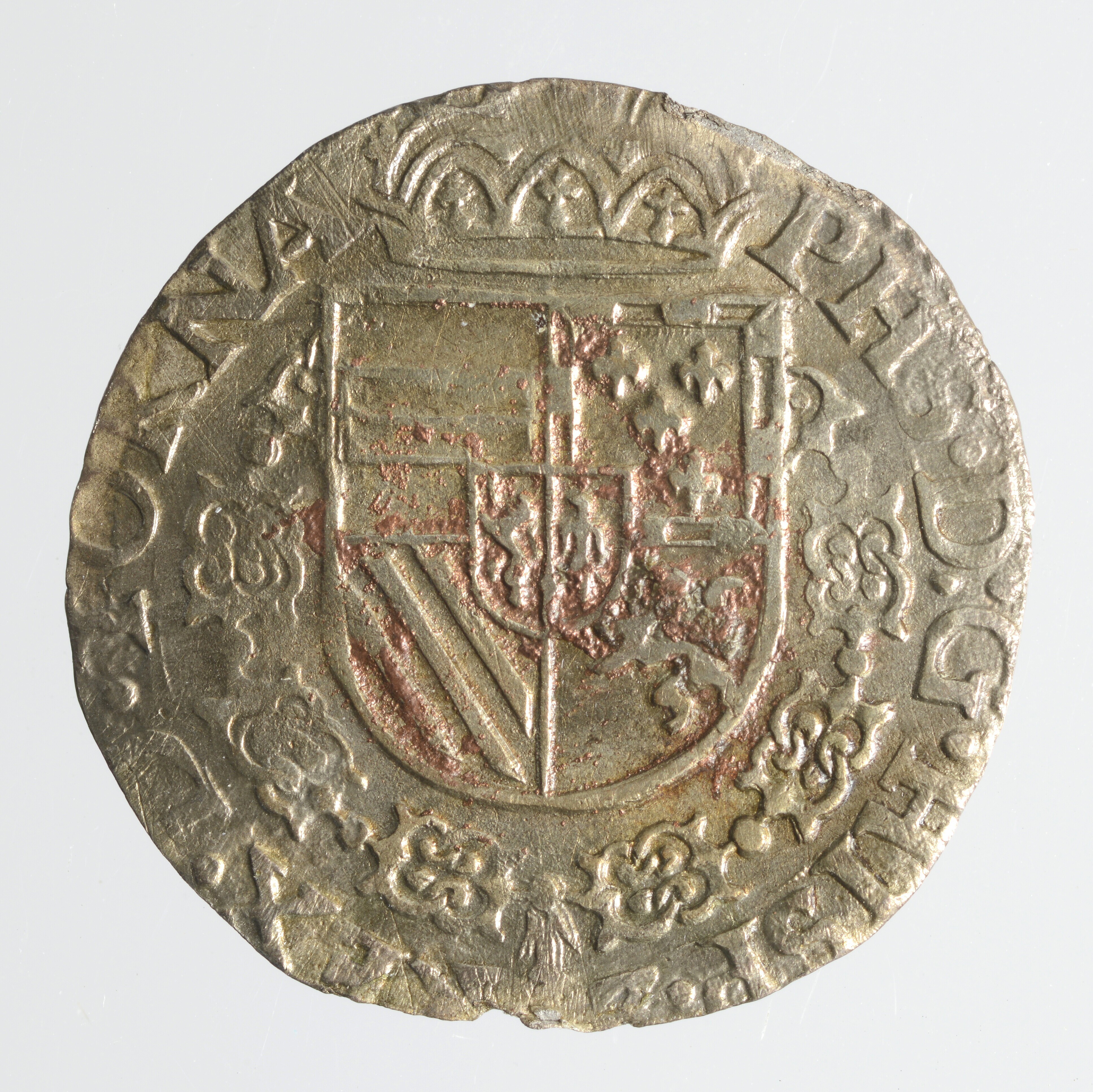 Twintigste Philipsdaalder; Philips II (1527-1598); vz.: Wapen van Oostenrijk-Bourgondië, gekroond en omhangen met keten van de orde van het gulden vlies en omschrift PHS.D:G.HISP.REX.D.TORNA; kz.: Gelelied kruis en omschrift DOMINVS.MIHI. ADIVTOR, hierboven een torentje en jaartal 1583; muntplaats: Doornik; gewicht: 2.77 gram