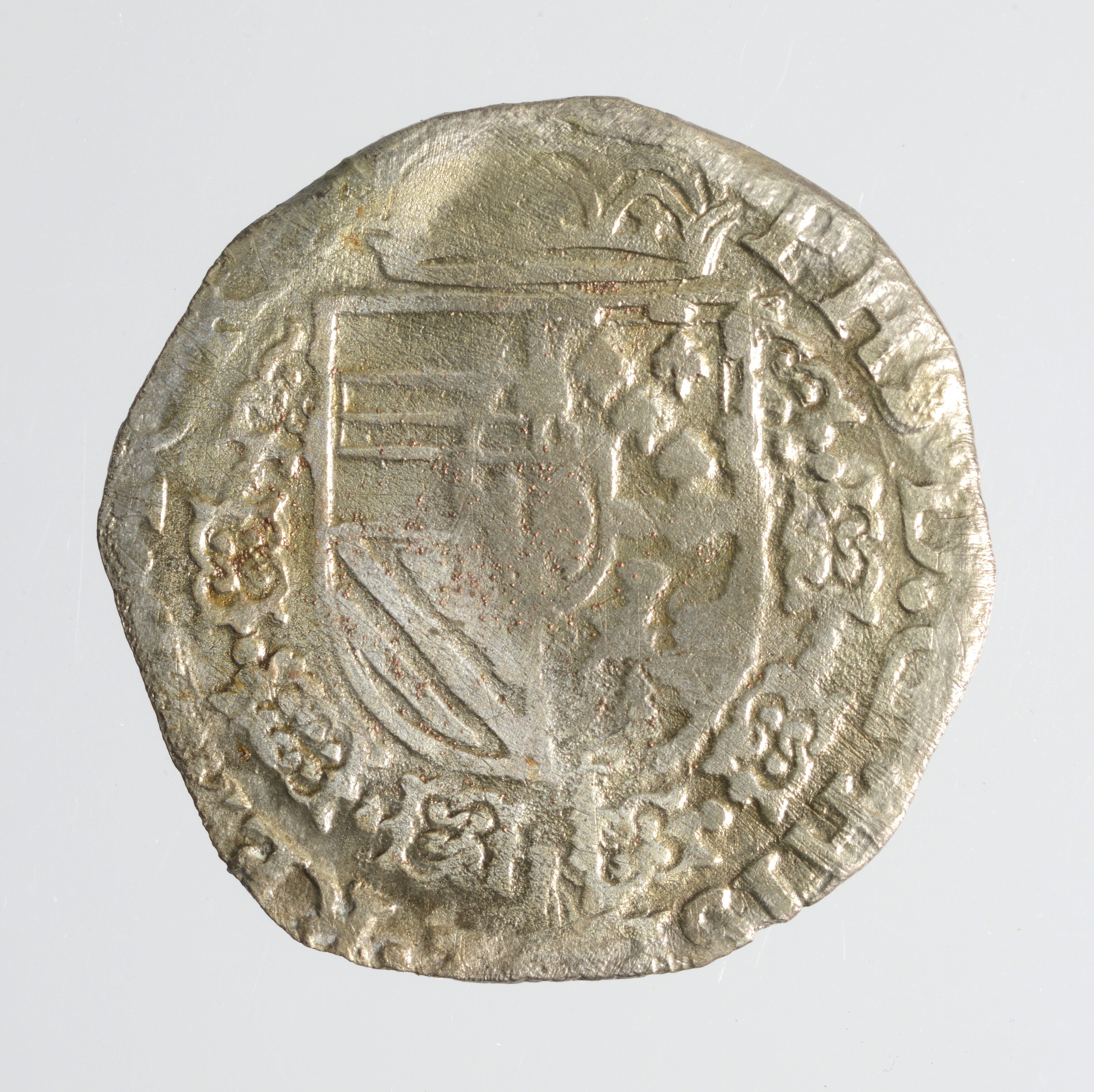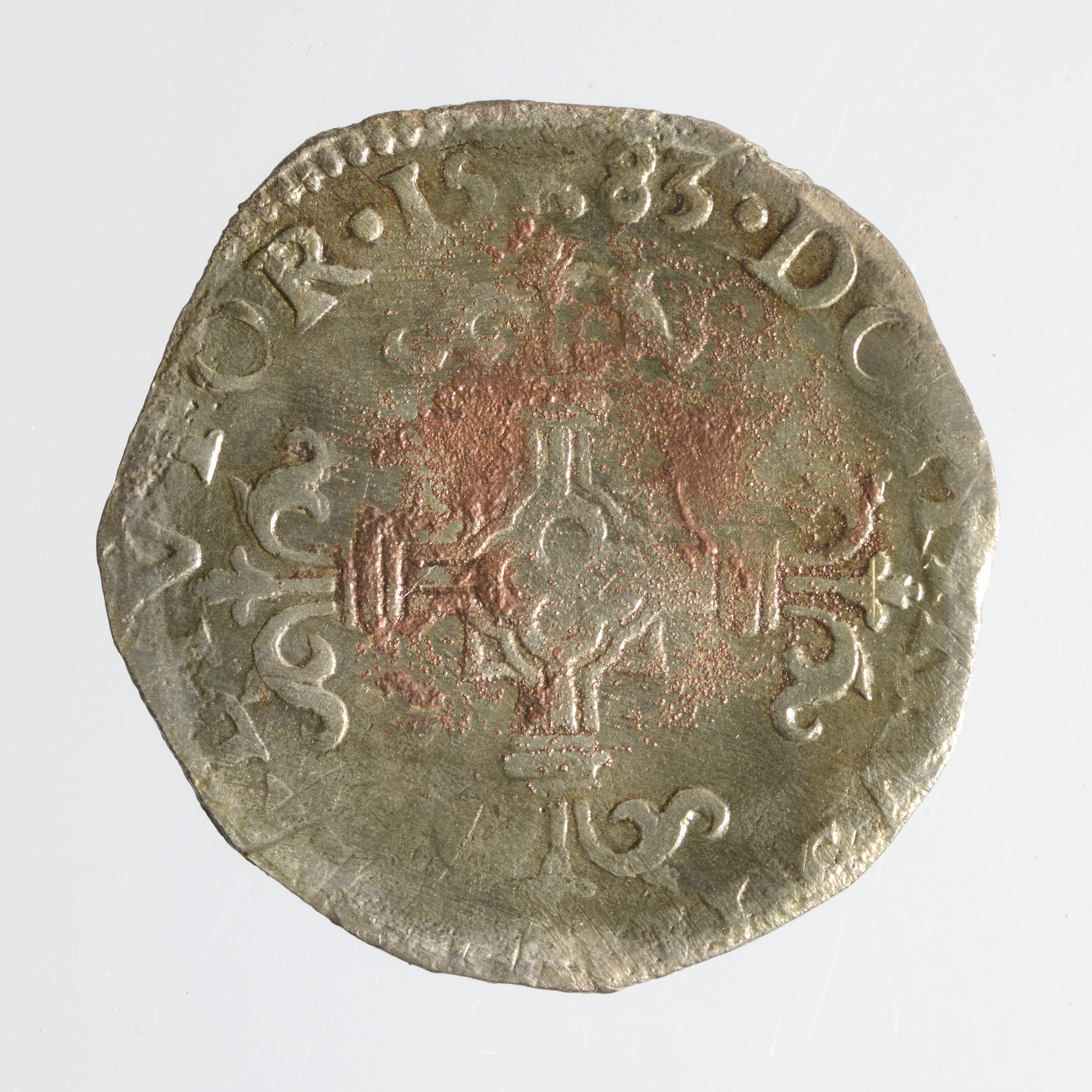Twintigste Philipsdaalder; Philips II (1527-1598); vz.: Wapen van Oostenrijk-Bourgondië, gekroond en omhangen met keten van de orde van het gulden vlies en omschrift PHS.D:G.HISP.REX.D.TORNA; kz.: Gelelied kruis en omschrift DOMINVS.MIHI. ADIVTOR, hierboven een torentje en jaartal 1583; muntplaats: Doornik; gewicht: 3.06 gram