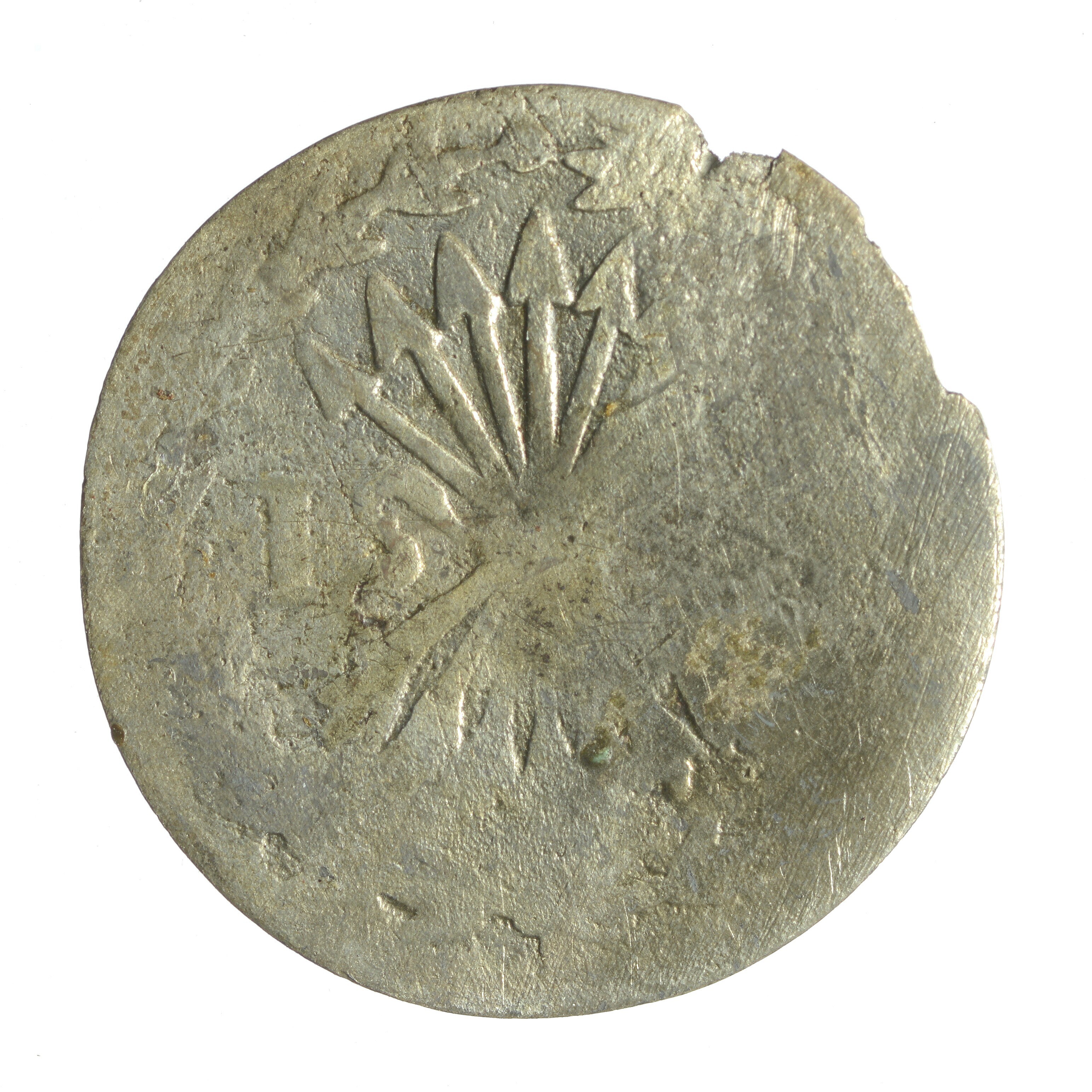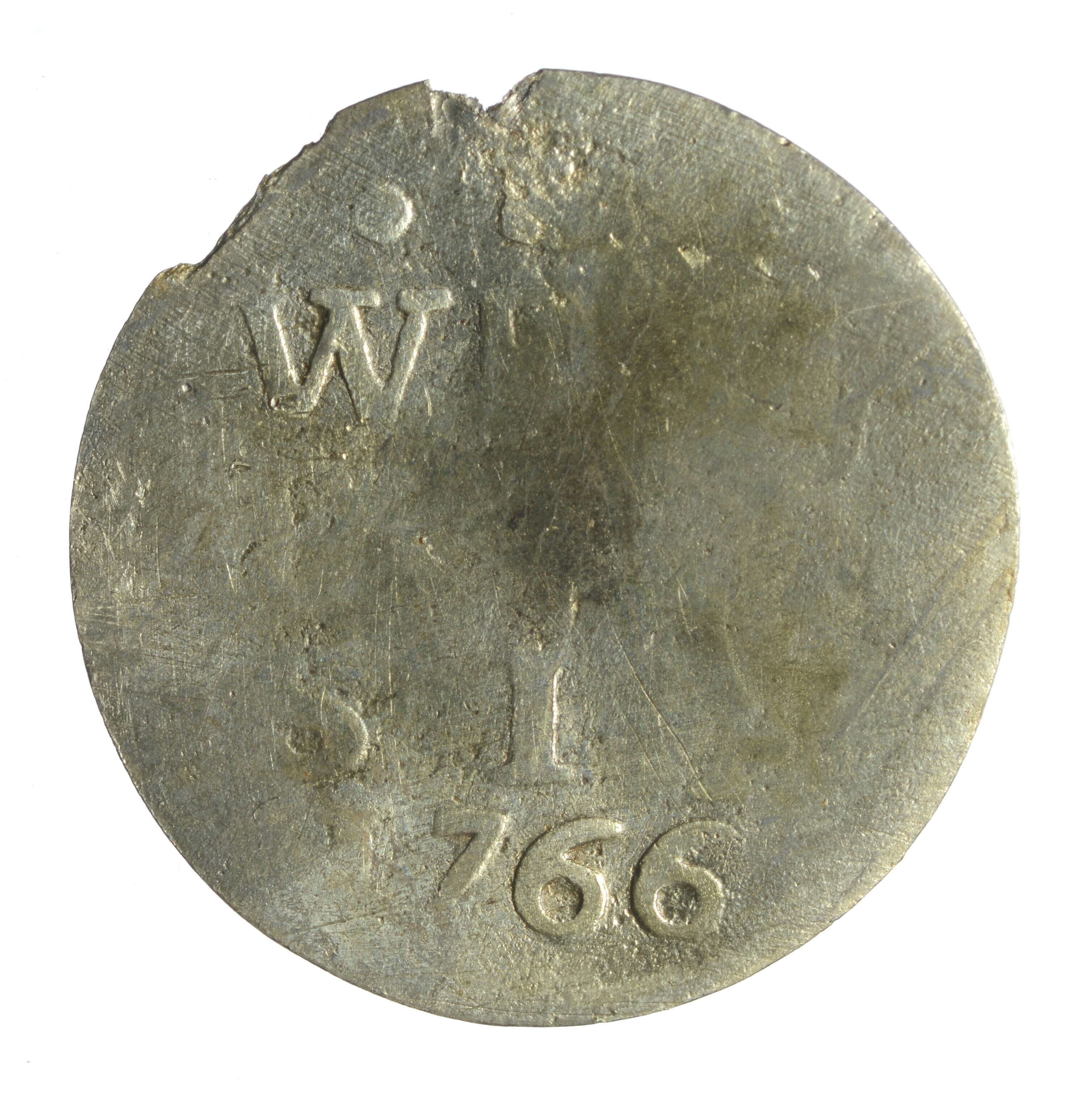 Bezemstuiver; West Friesland Provincie (1581-1795); vz.: in vier regels: WEST / FRI / SIAE / •1766•; kz.: bundel van zeven pijlen binnen een bladerkrans met 1 – S ter weerszijden; gewicht: 0.50 gram