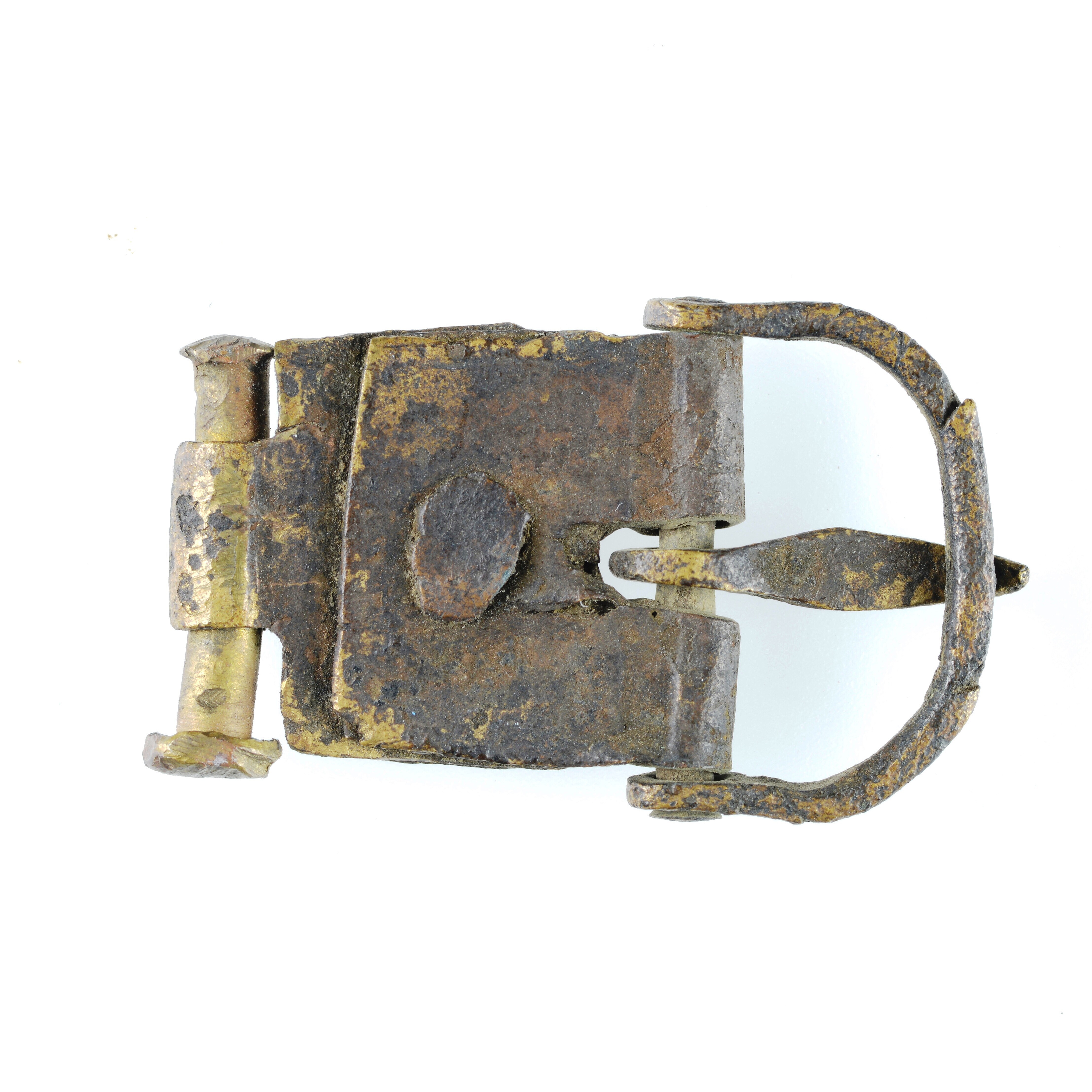 Gesp; D-vormige gesp met angel en vierkante beslagplaat