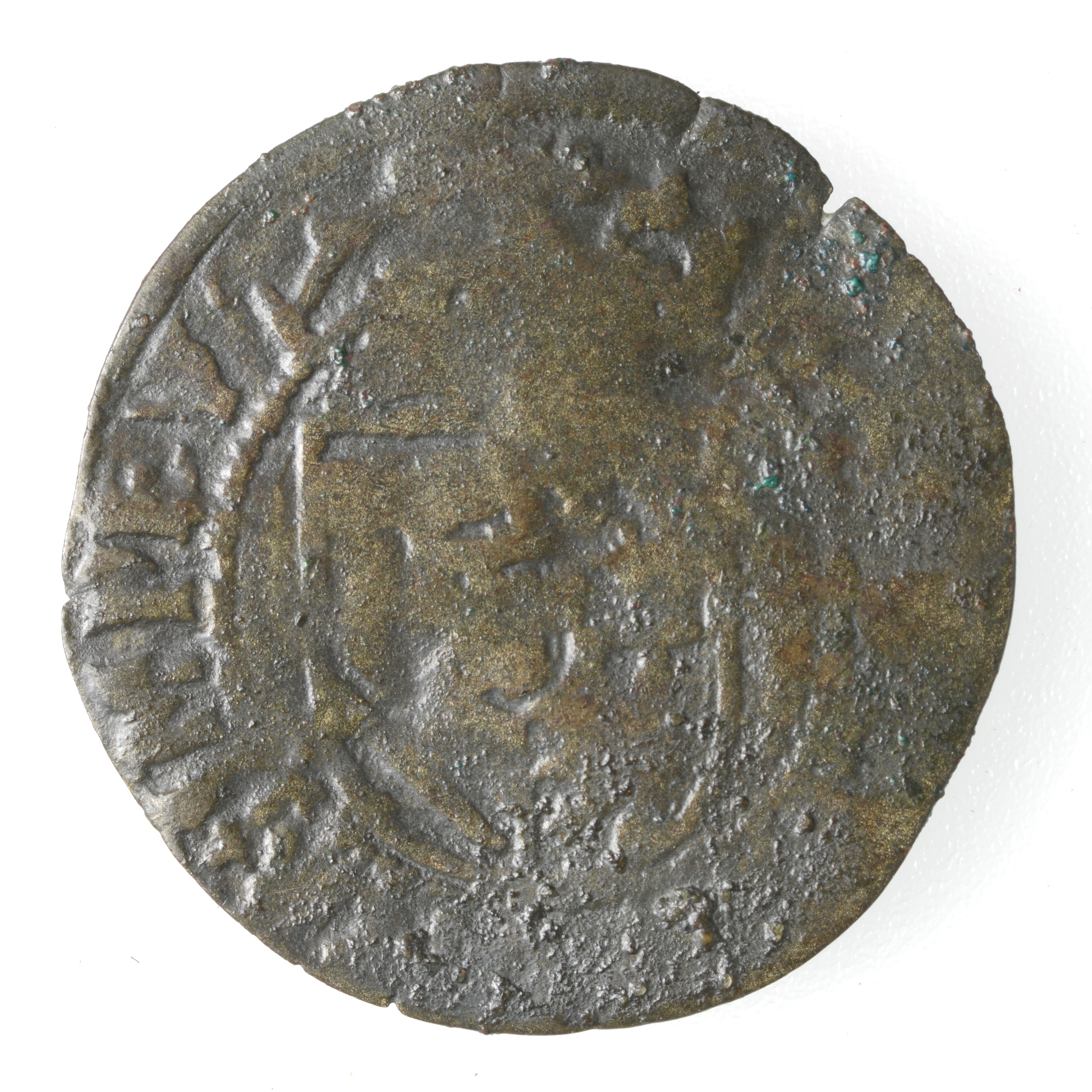 Kwart groot; Hertogdom Brabant (1183-1795); Karel V (1506-1555); vz.: wapenschild in binnencirkel, omschrift: [KAROLVS.ROM]A.IMPE; kz.: kruis in binnencirkel met in hart een rozet, in kwadranten een rozet/franse lelie, omschrift: DA.MICHI. VI[RTVT.CO.HO].TV; gewicht: 0.48 gram