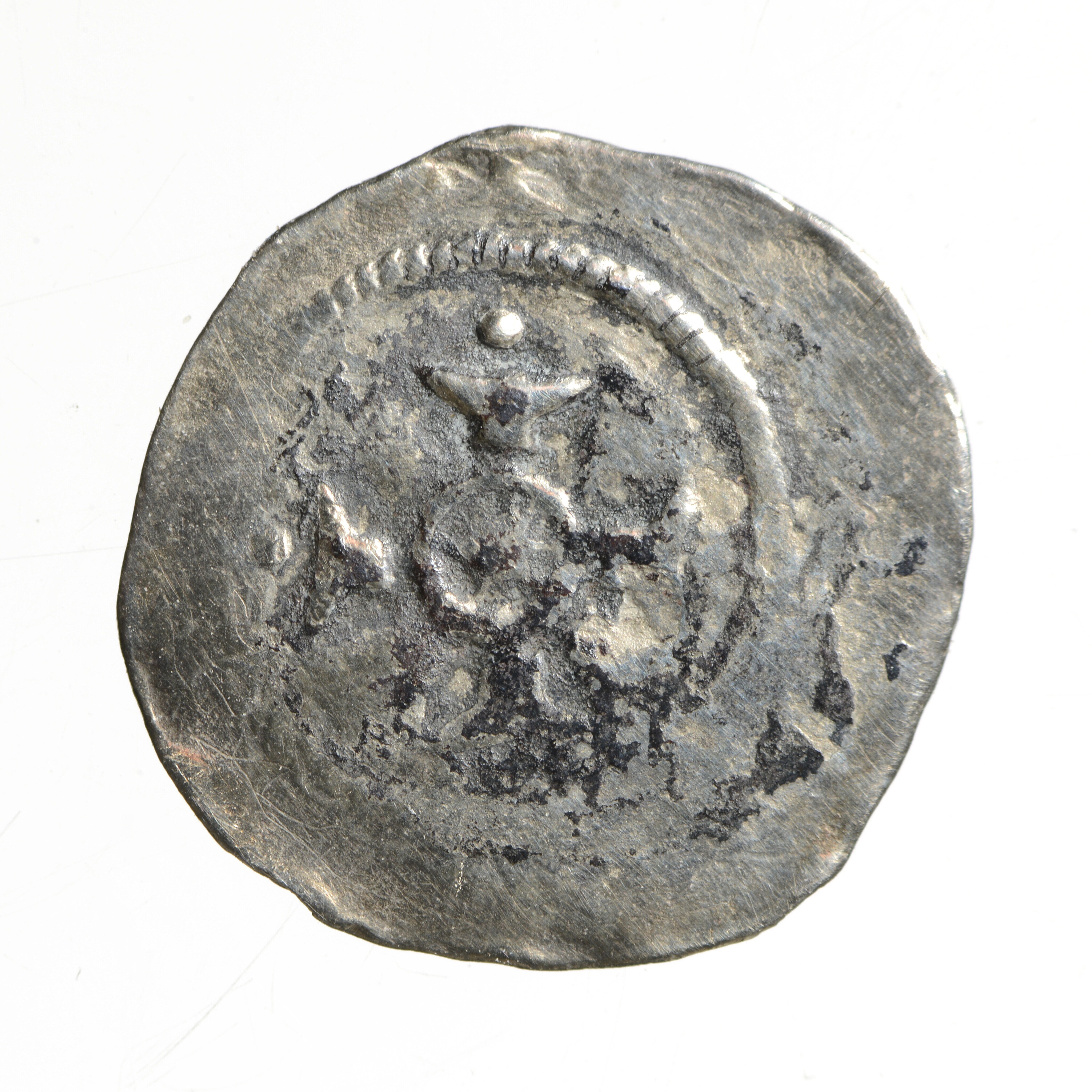 Penning; Utrecht Bisdom (1010-1528); bisschop anoniem; vz.: borstbeeld (naar rechts) van een bisschop met een “Turkse muts” en een kromstaf, binnen een parelcirkel, geen omschrift; kz.: gevoet kruis met bolletjes op de voeten en centraal een ster in een parelcirkeltje, binnen een parelcirkel, geen omschrift; muntplaats: Deventer; gewicht: 0,54 gram