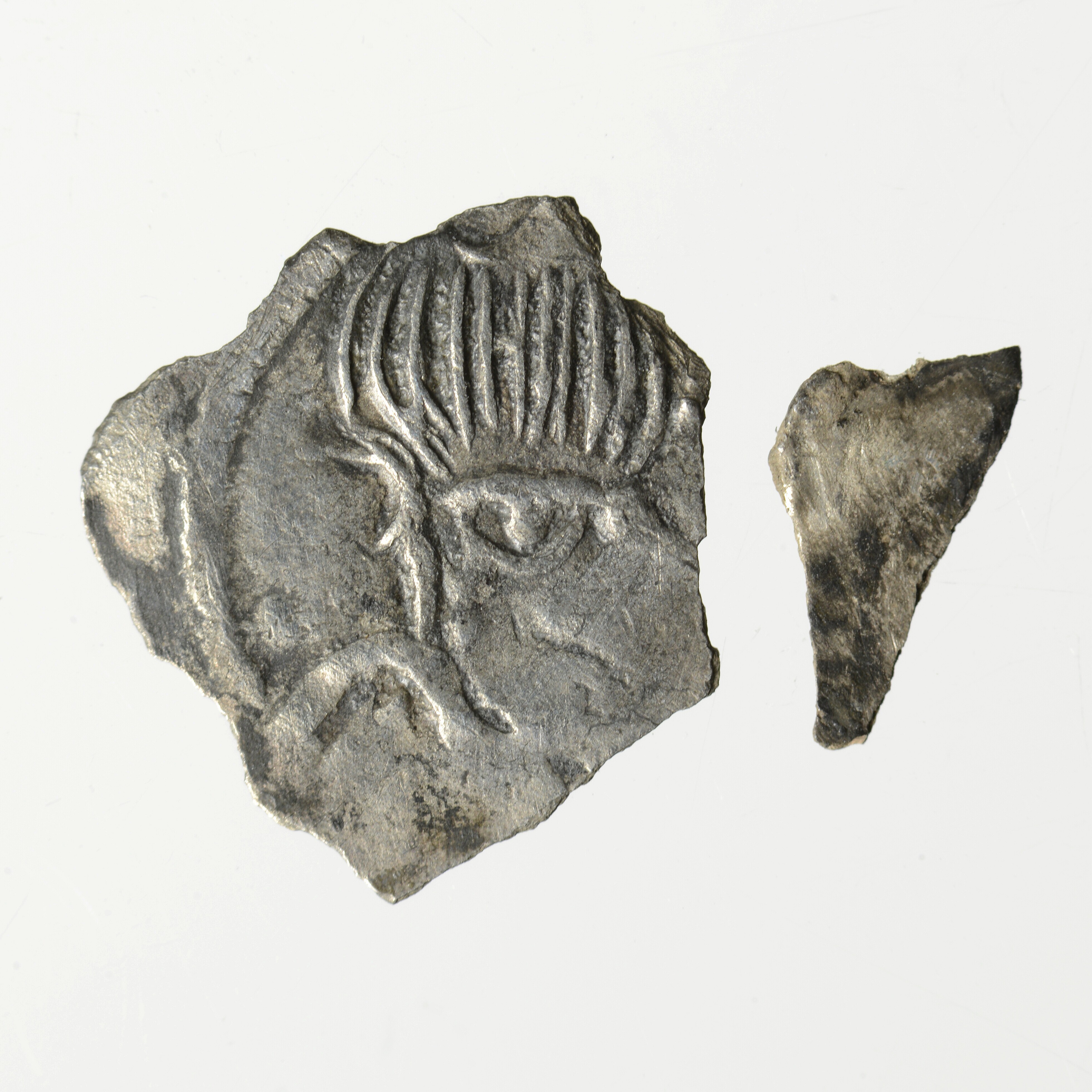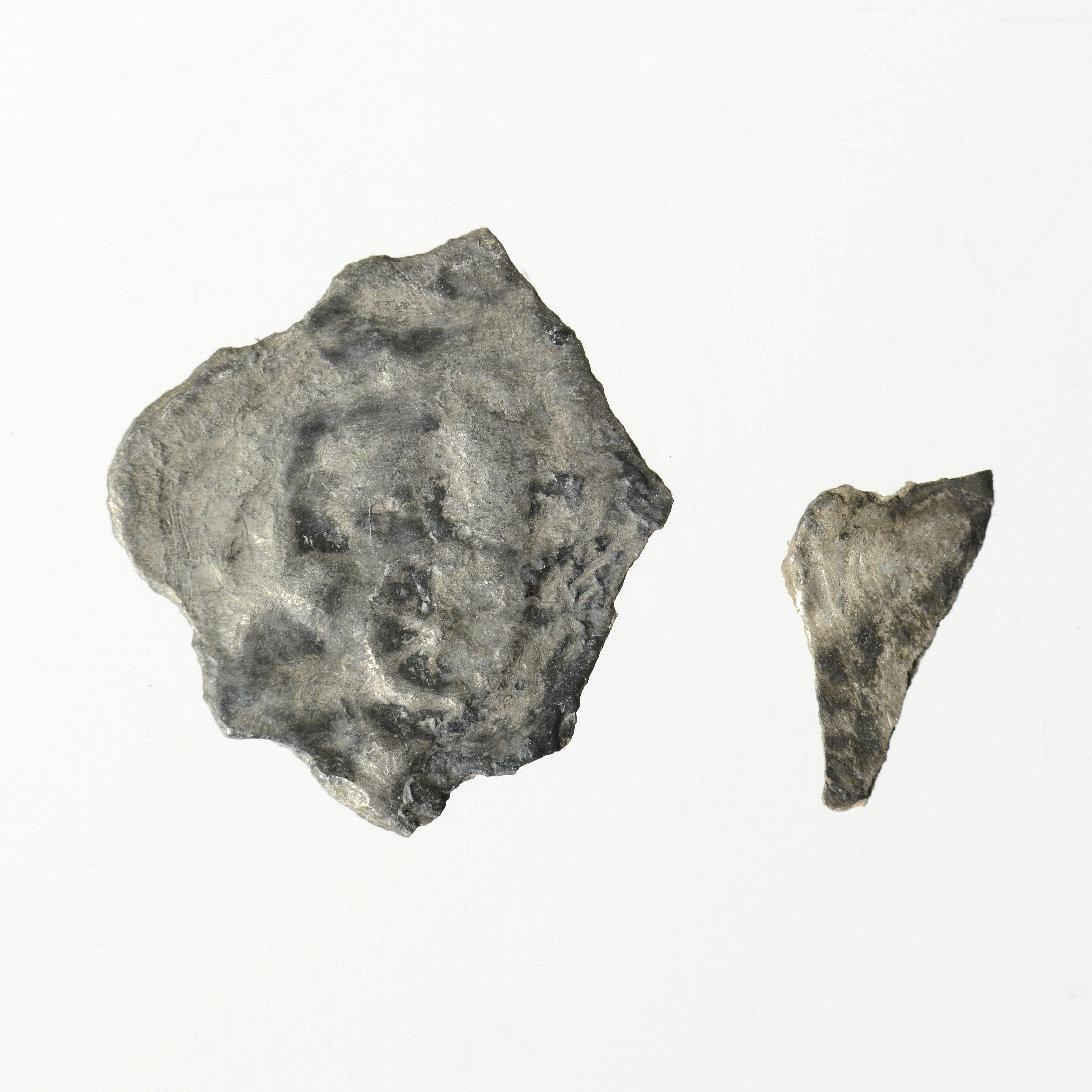 Penning; twee fragmenten; Utrecht Bisdom (1010-1528); bisschop anoniem; vz.: borstbeeld (naar rechts) van een bisschop met een “Turkse muts” en een kromstaf, binnen een parelcirkel, geen omschrift; kz.: gevoet kruis met bolletjes op de voeten en centraal een ster in een parelcirkeltje, binnen een parelcirkel, geen omschrift; muntplaats: Deventer; gewicht: 0,13 gram