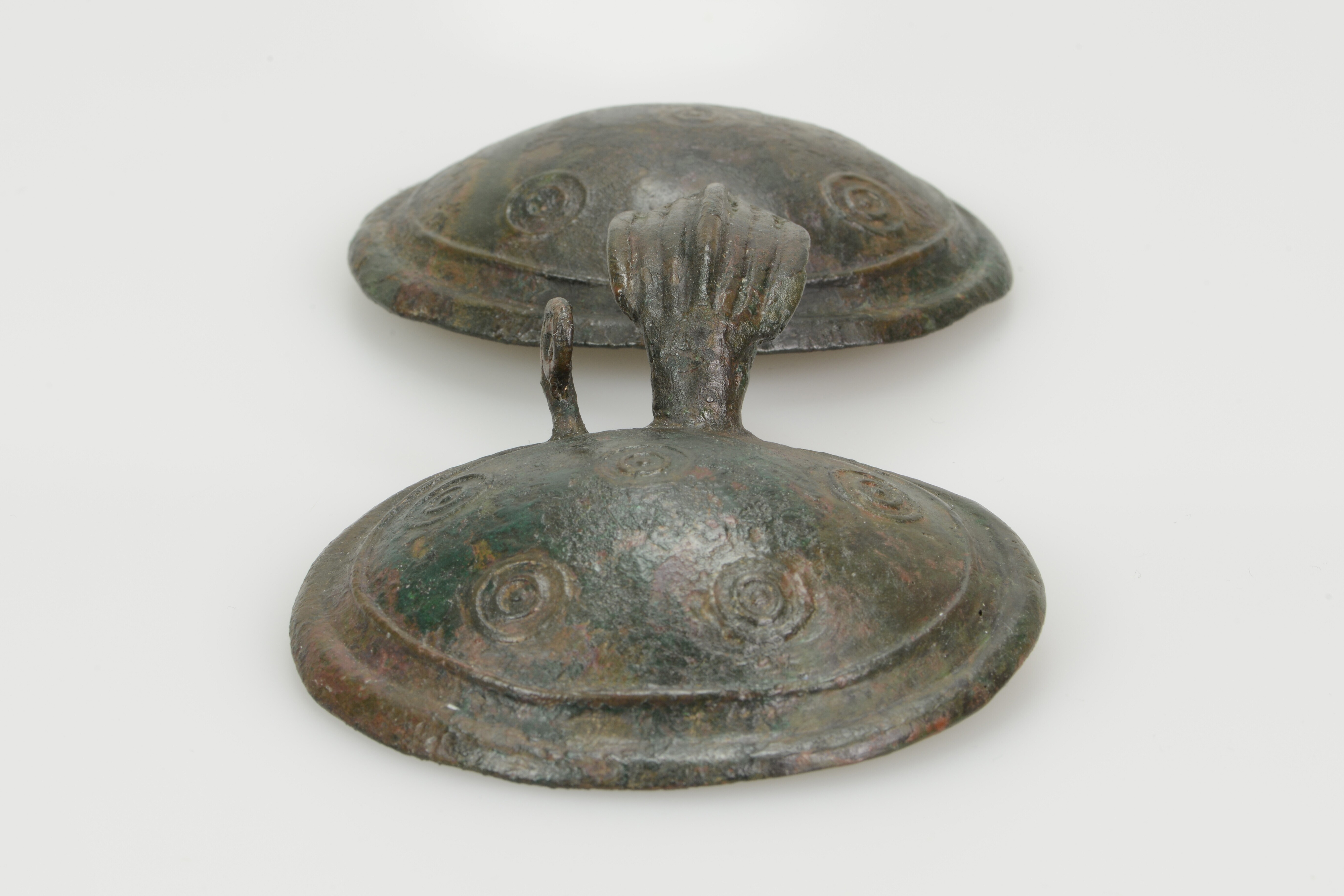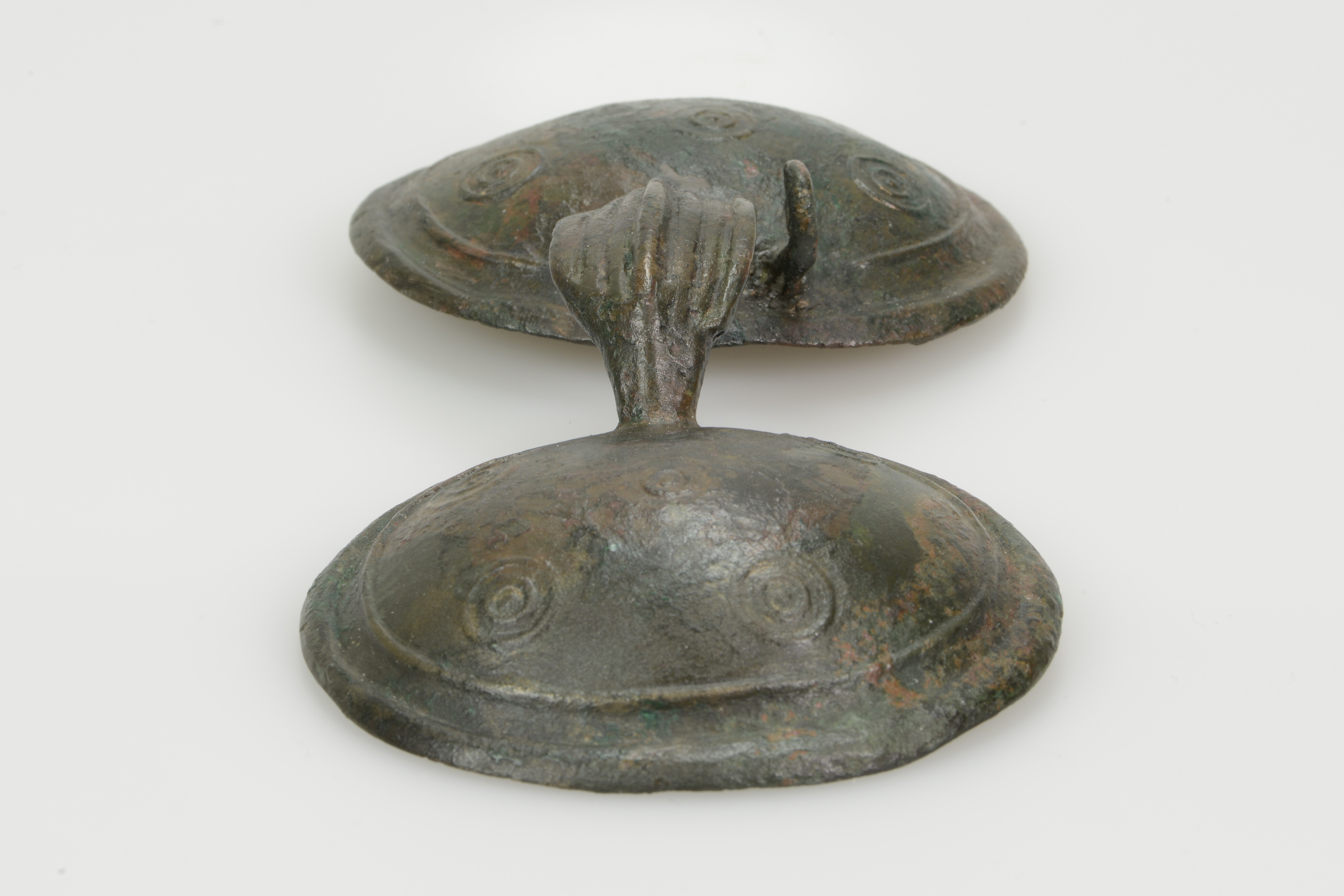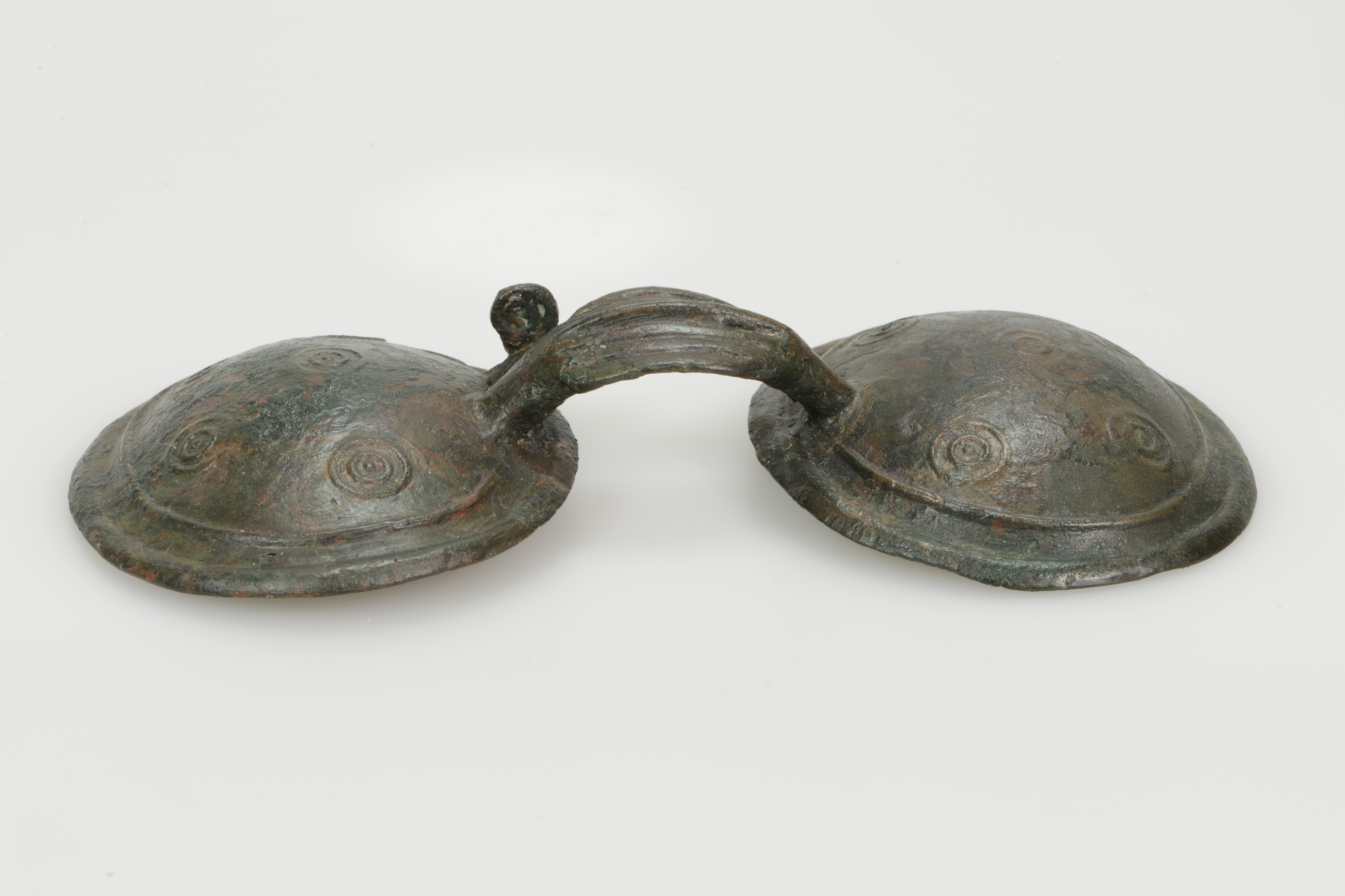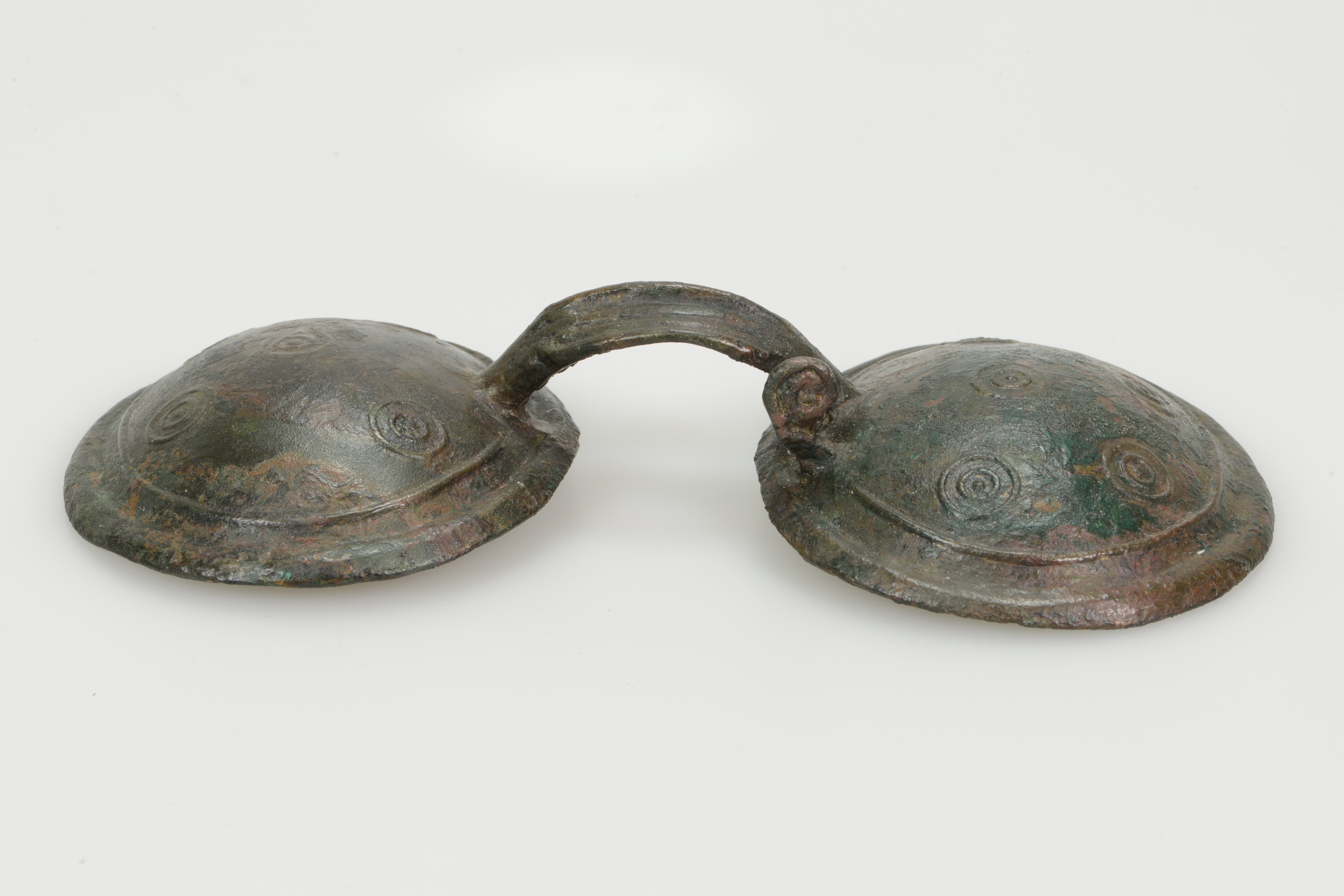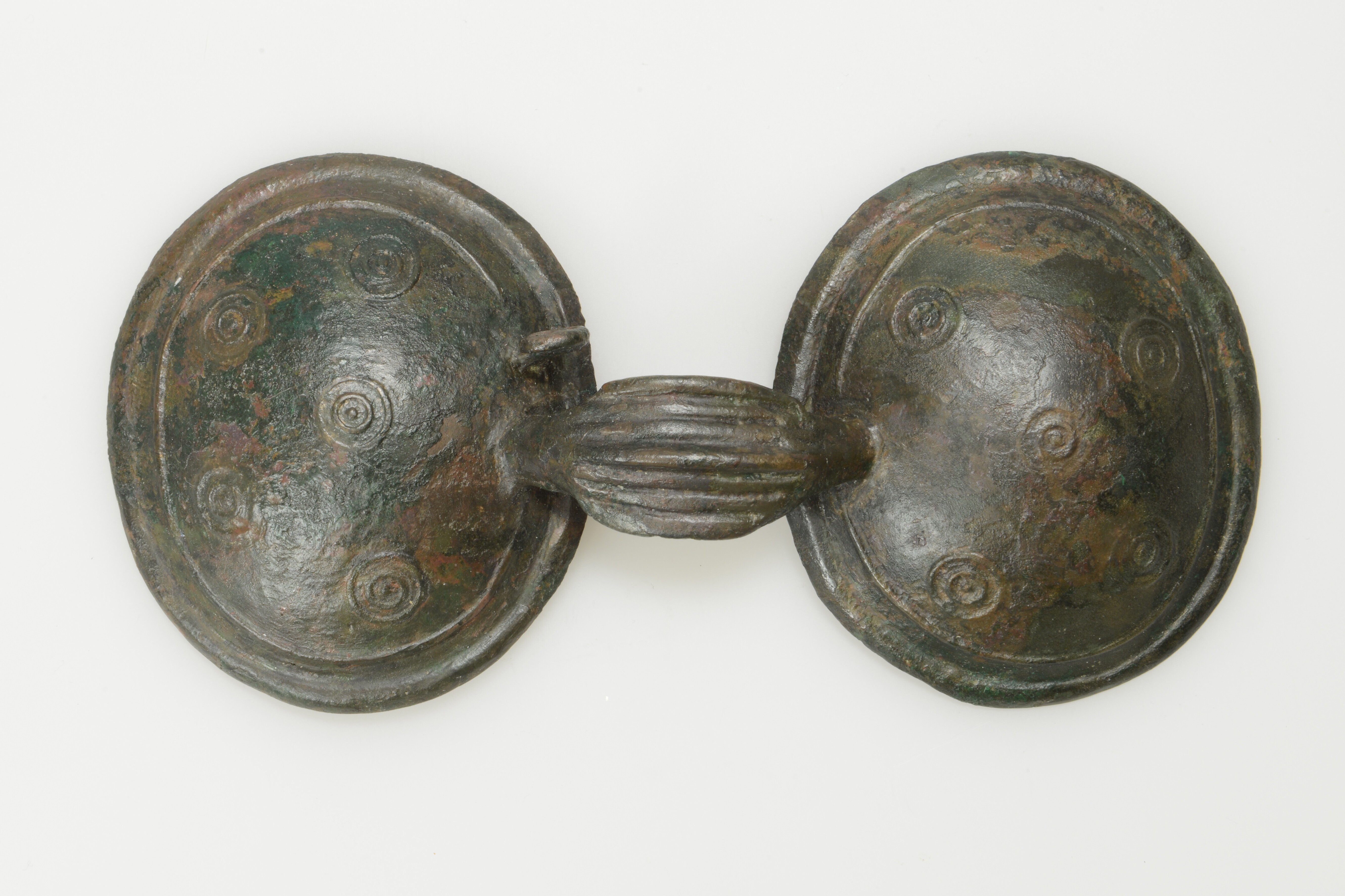 Brilfibula; type Oerel; twee C-ribben langs de rand van de platen, vier punt-in-cirkels langs de binnenste C-rib en één punt-in-cirkel in het midden van de plaat; de rechterplaat heeft een opgietbare gesloten spiraalvormige lus; bevestigingspen ontbreek; decoratieboog: kleine horizontale prominente middenrib (breedte 4.2 cm), met drie kleinere horizontale ribben boven en onder.