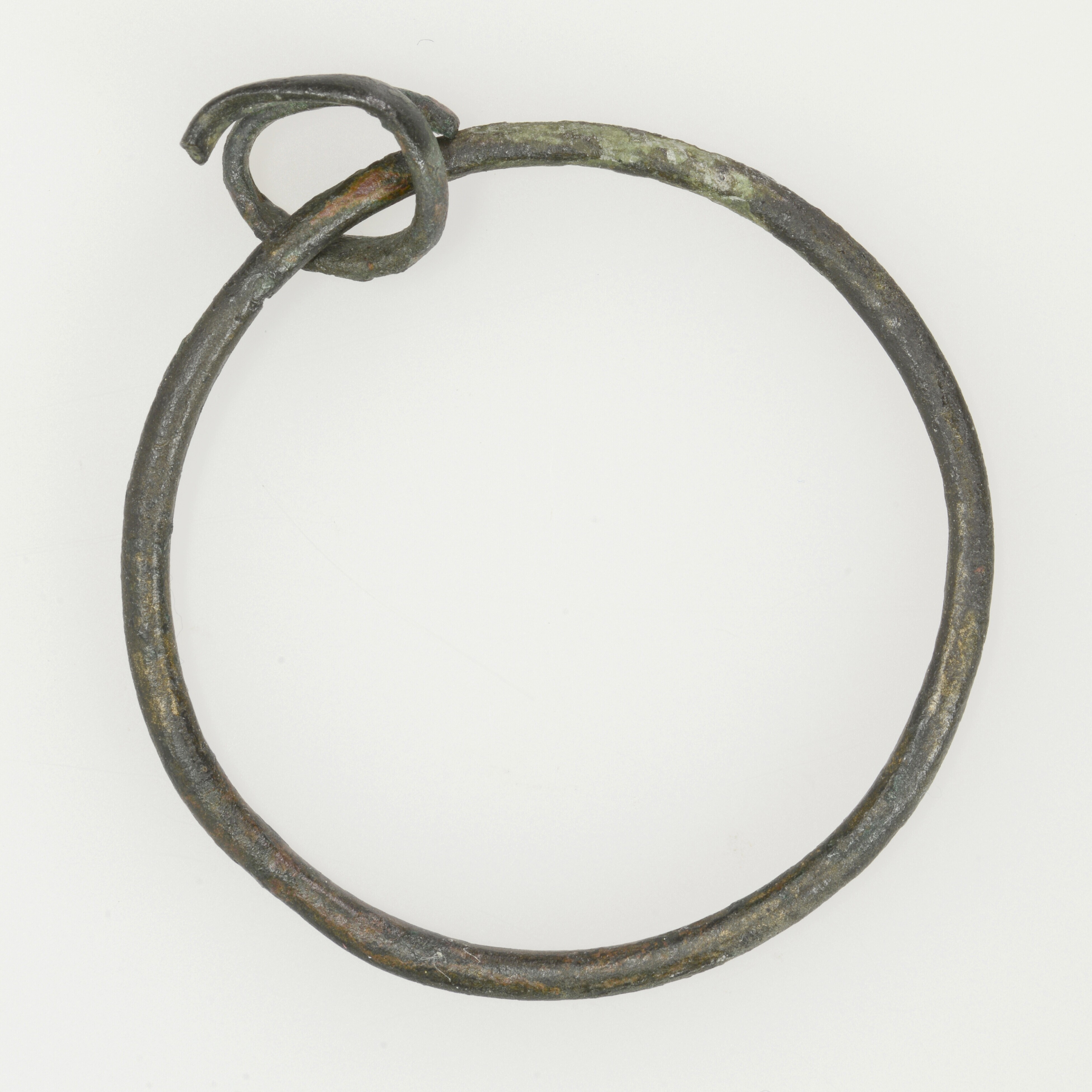 Ringen; een grote ring met ronde doorsnede met daaromheen een ring/spiraal van bronsstrip. Mogelijk onderdeel van een halssnoer/halsketting