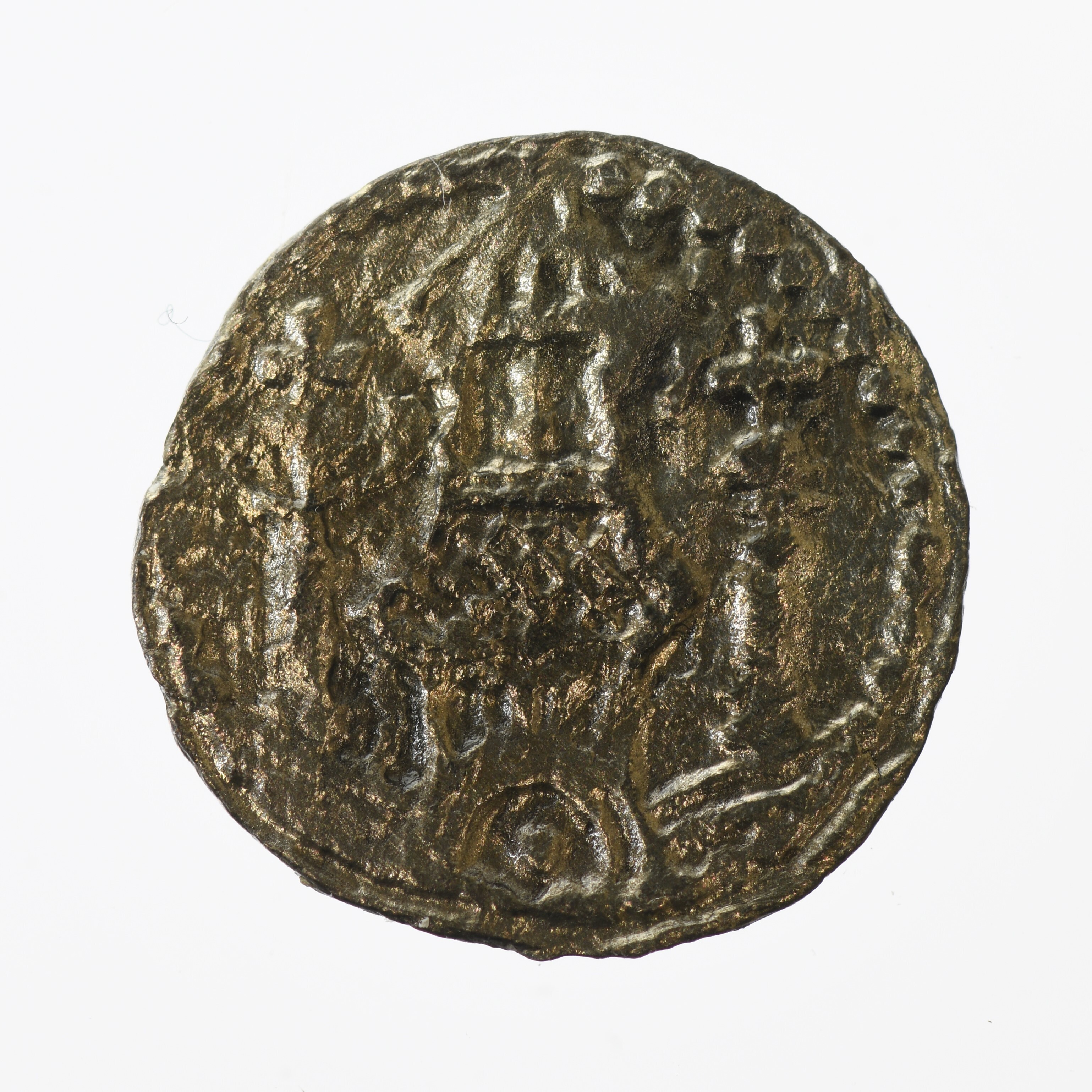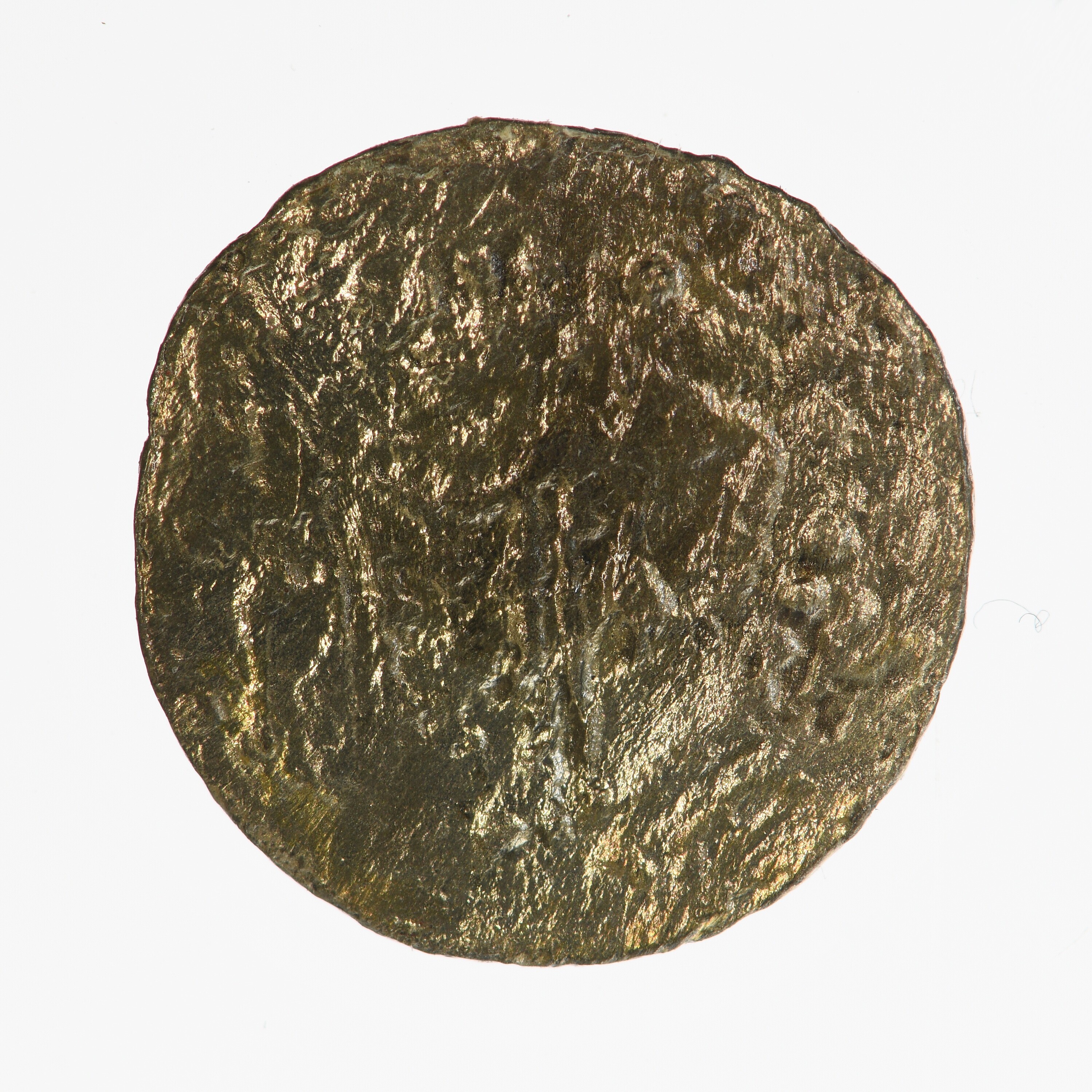 Penning; Heilige Romeinse Rijk (962-1806); Frederik II (1212-1250); vz.: vorstelijke beeltenis met scepter in de rechterhand en met onleesbaar omschrift; kz.: centraal kasteel of toren geflankeerd door twee torens met kruizen bovenop; muntplaats: Nijmegen; gewicht: 0.31 gram