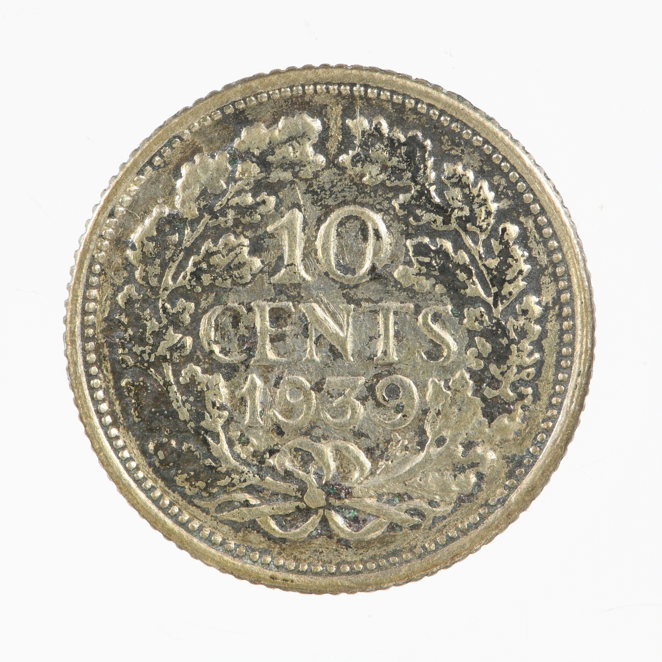 Dubbeltje; Nederland Koninkrijk (1813-heden); Wilhelmina (1890-1948); vz.: hoofd naar links, met omschrift WILHELMINA KONINGIN DER NEDERLANDEN; kz.: binnen een bladerkrans in vier regels: 10 / CENTS / 1939 / (druiventros) - (mercuriusstaf); muntplaats: Utrecht; gewicht: 1.38 gram