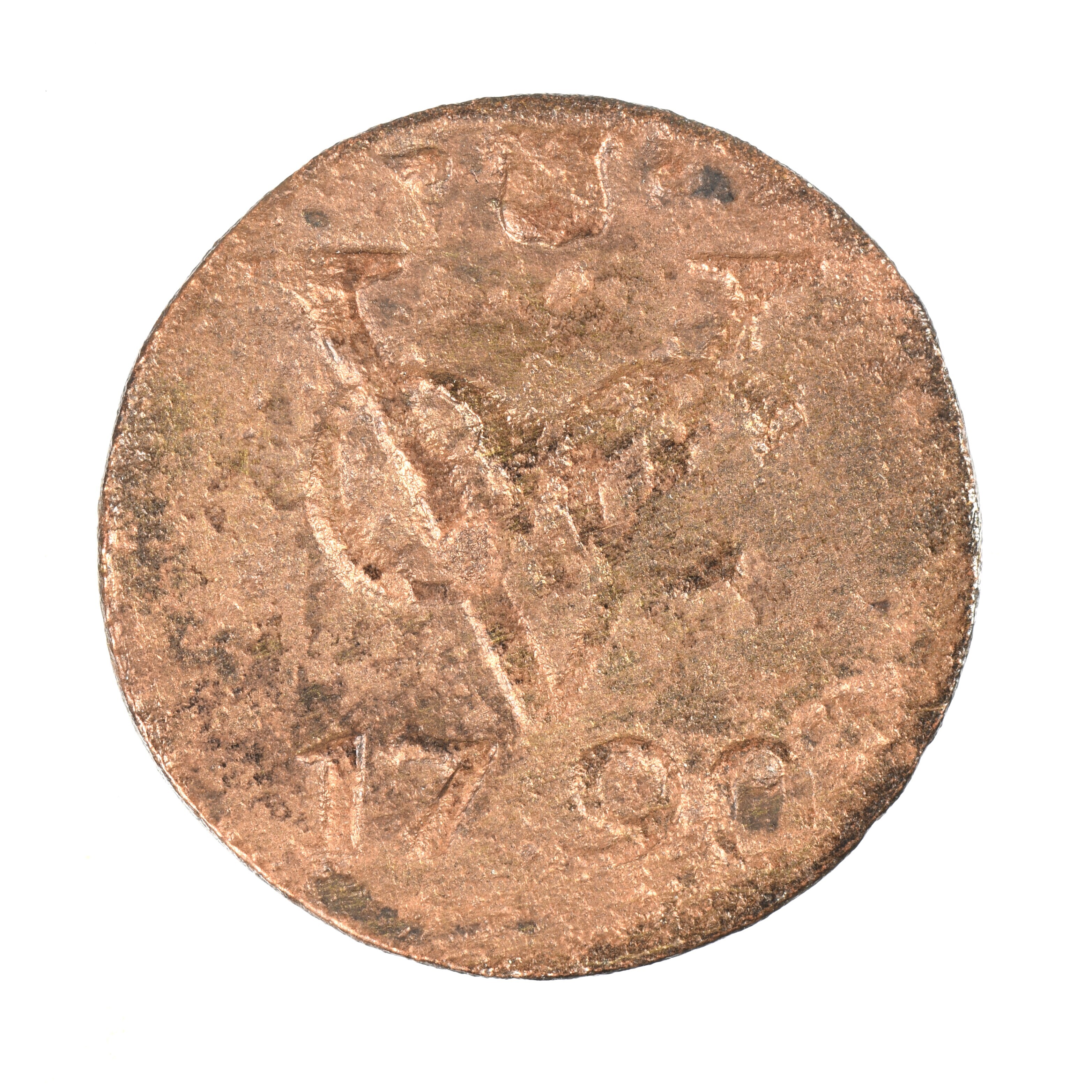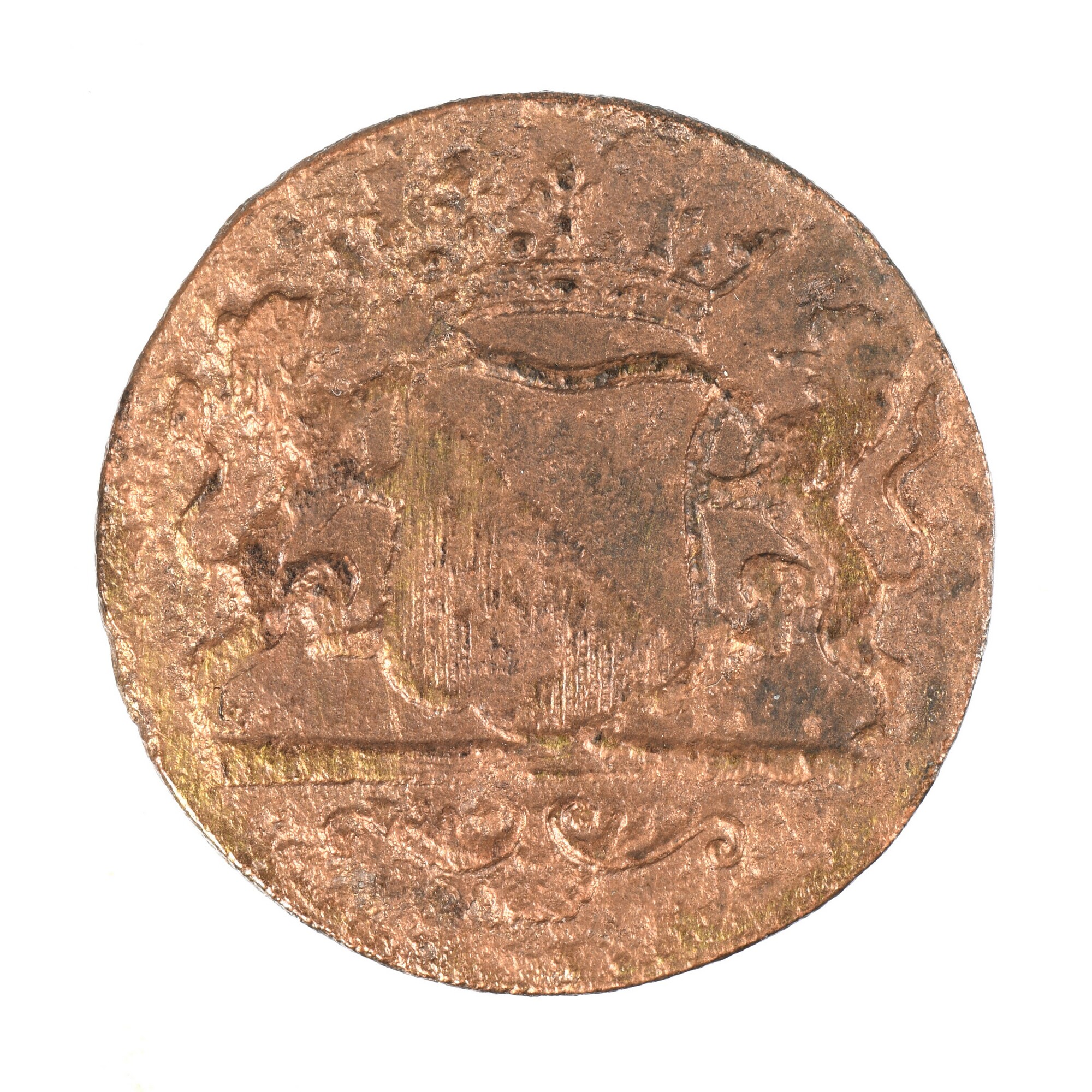 Duit Utrecht; Verenigde Oostindische Compagnie; vz.: in drie regels: • (stadswapen van Utrecht) • / monogram VOC / 1790; kz.: gekroond wapenschild van de stad Utrecht, vastgehouden door twee leeuwen, daaronder een streep; muntplaats: Utrecht; gewicht: 2.93 gram