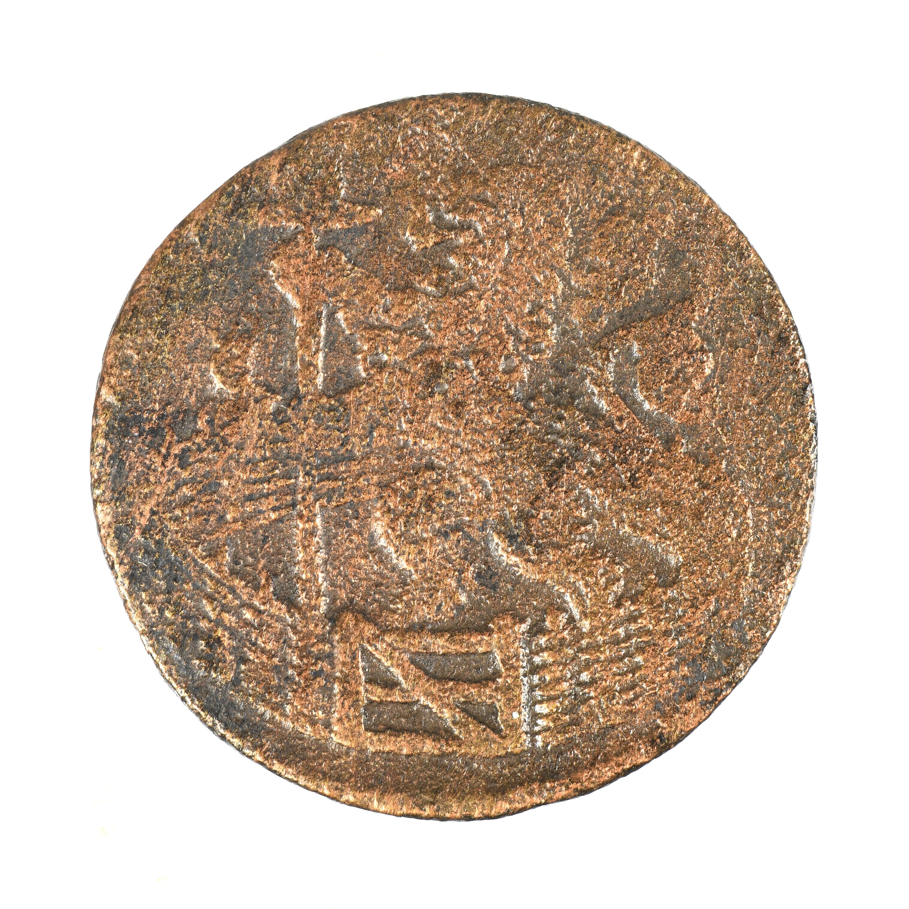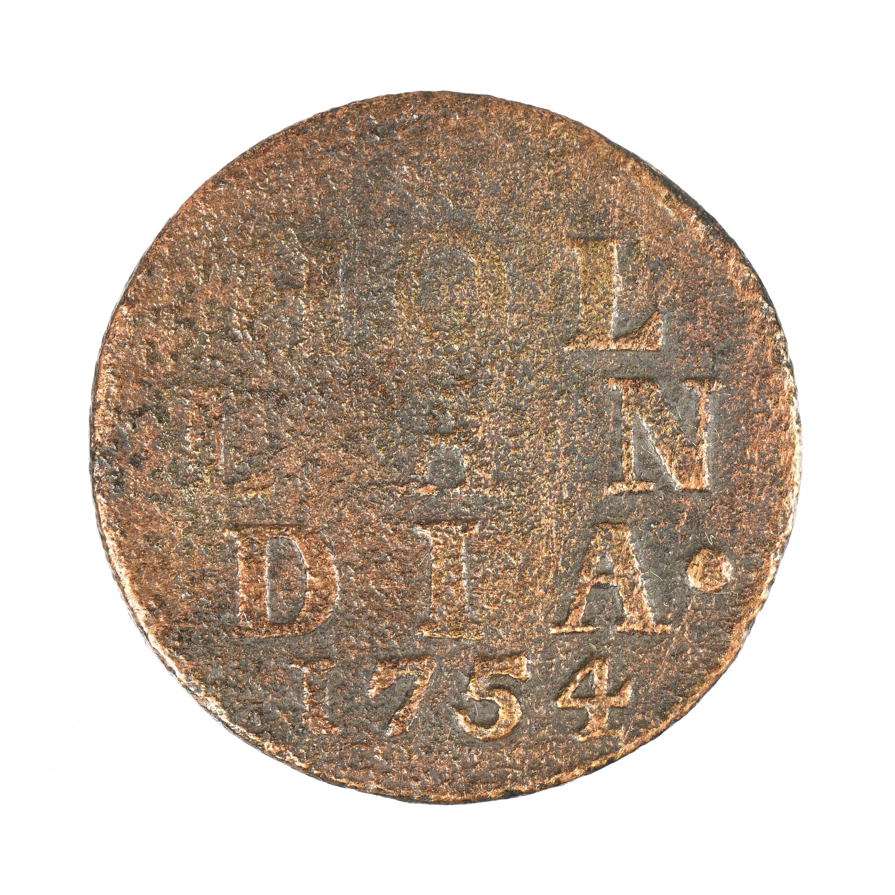 Duit; Holland Provincie (1581-1795); vz.: in vijf regels: • (rozet) • / HOL / LAN / DIA• / 1754; kz.: klimmende leeuw naar links met vrijheidshoed en een lans binnen de Hollandse tuin; muntplaats: Dordrecht; gewicht: 2.85 gram