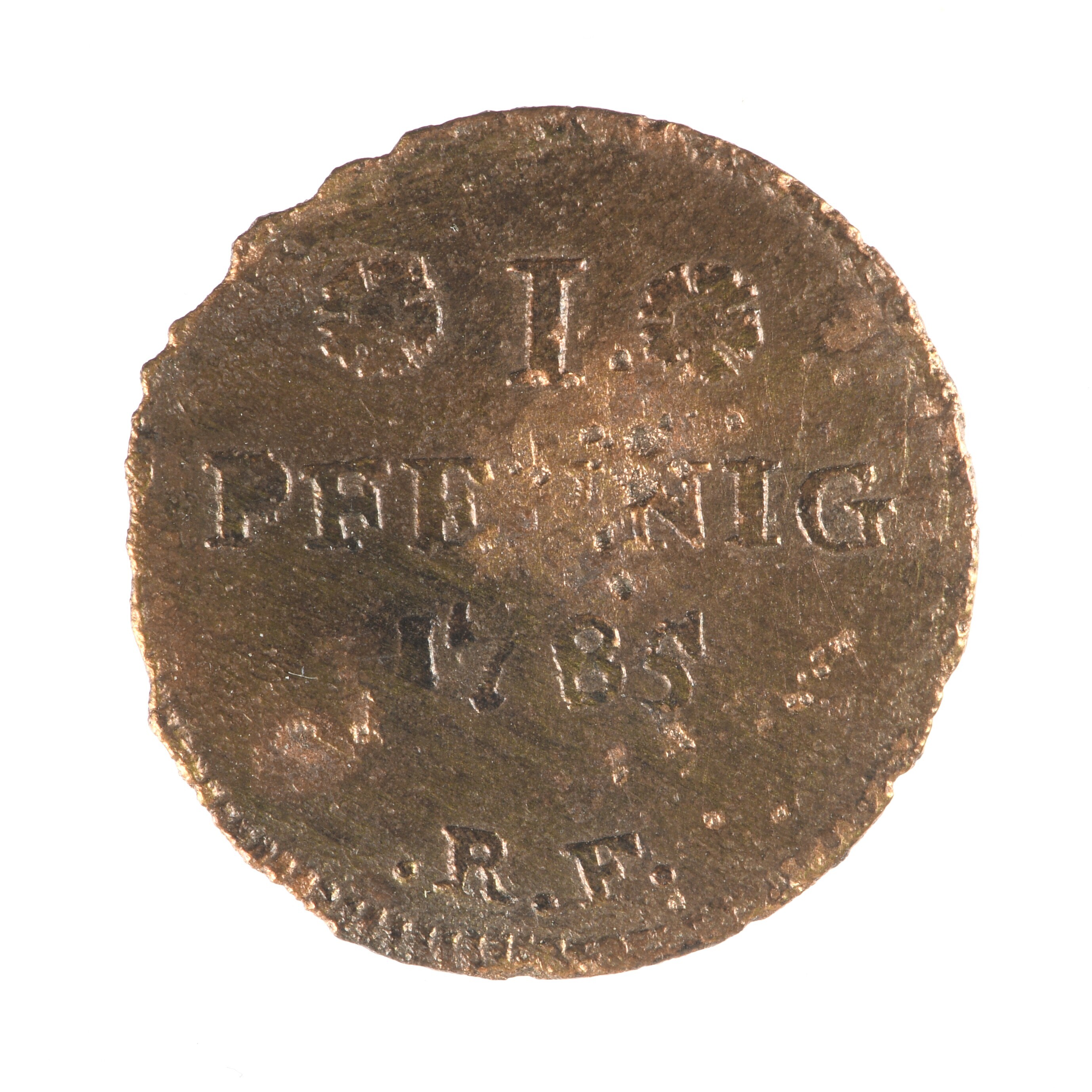 Pfennig; Duitsland; Duitse Staten; Landgraafschap Hessen-Darmstadt (1567-1806); Lodewijk IX (1768-1790); vz.: (rozet) 1 (rozet) / PFENNIG / 1785/ •R•F• in vier regels; kz.: naar links lopende leeuw naar links binnen een gekroonde cirkel met omschrift DARMST - HESSEN; muntplaats: Darmstadt; gewicht: 1.56 gram