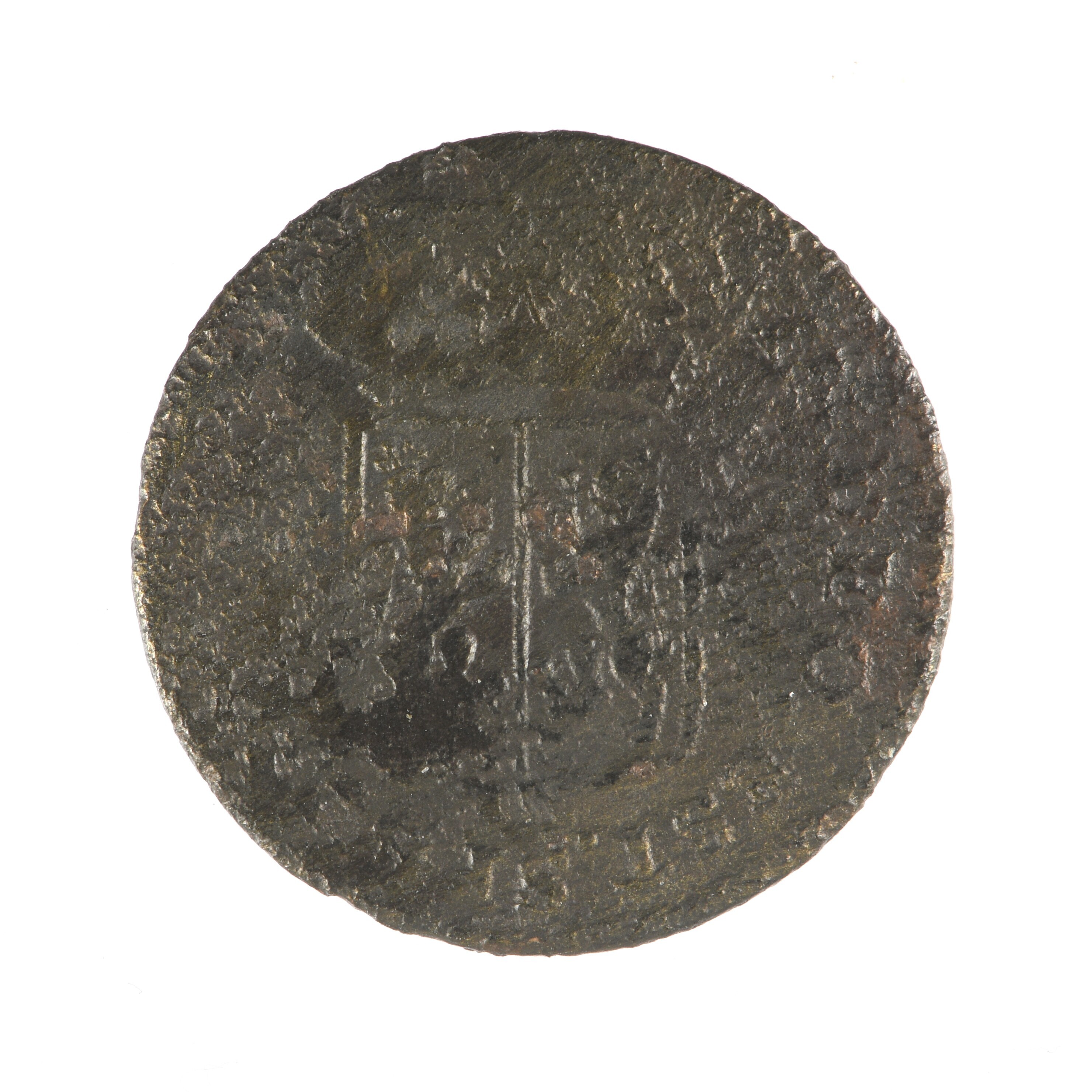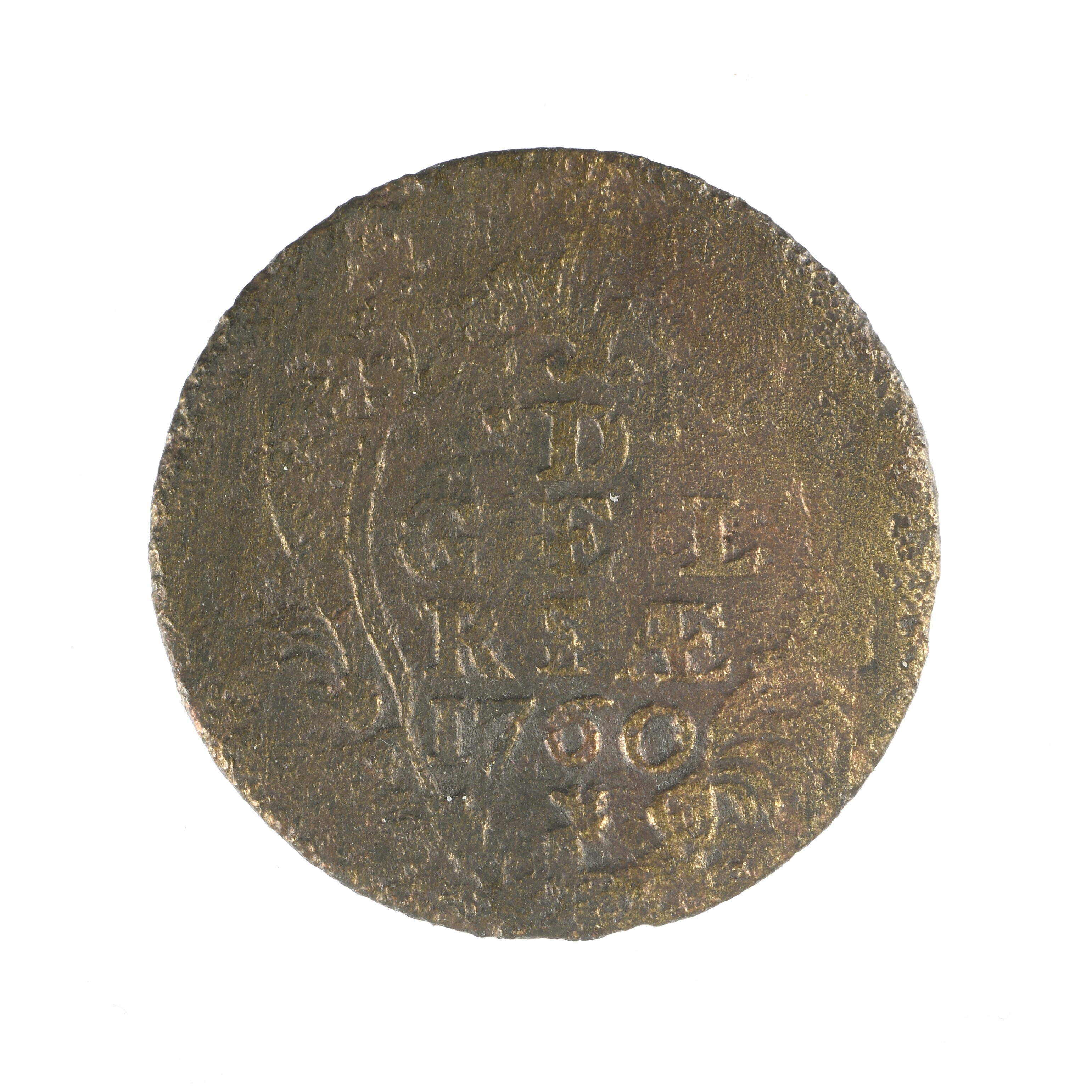 Duit; Gelderland Provincie (1581-1795); vz.: in vijf regels: •D• / GEL / RIAE / 1760 / (geknotte boom met loot); kz.: gekroond wapenschild van Gelderland, met omschrift IN DEO EST SPE[S NOSTRA]; muntplaats: Harderwijk; gewicht: 2.66 gram