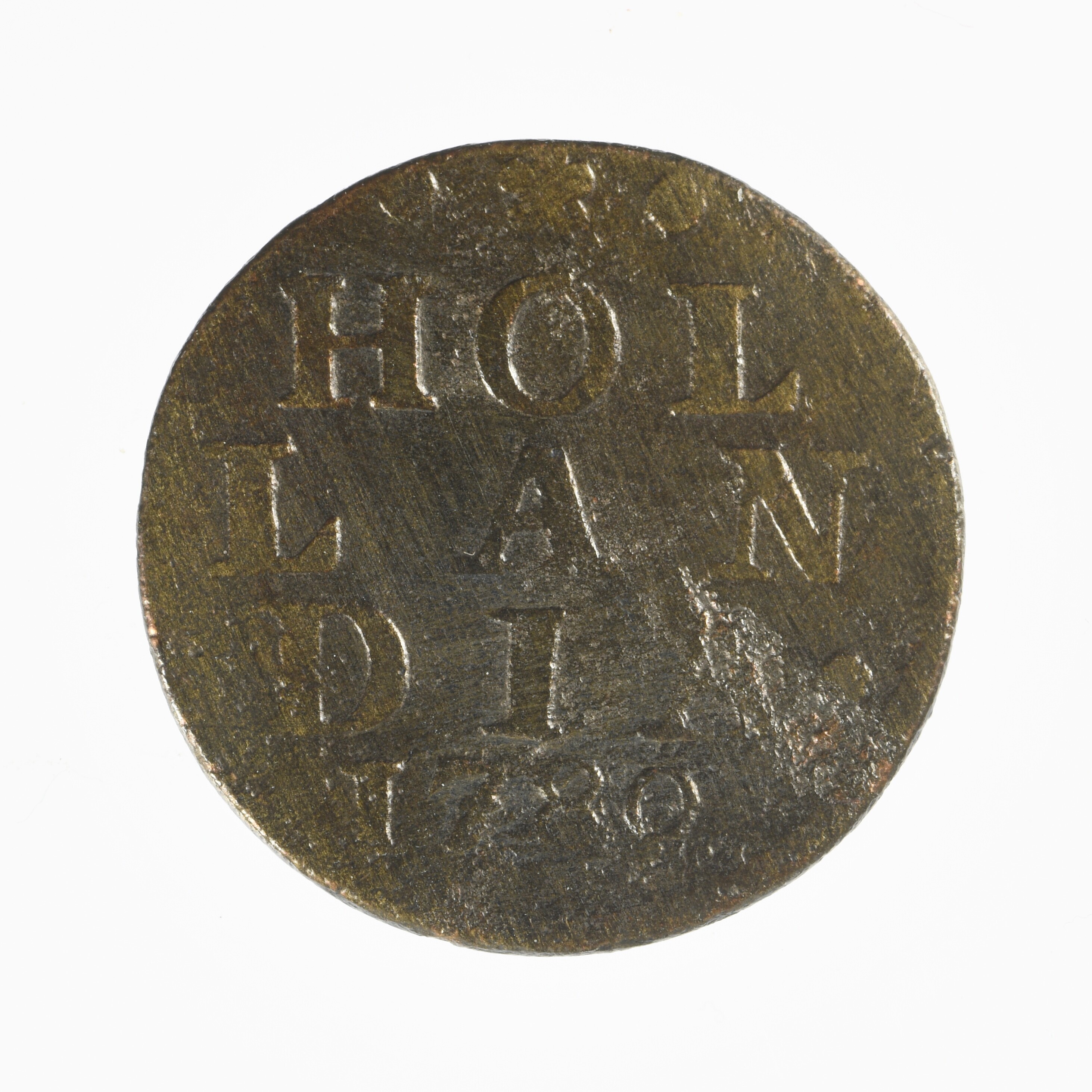 Duit; Holland Provincie (1581-1795); vz.: in vijf regels: •(rozet)• / HOL / LAN / DIA• / 1780; kz.: klimmende leeuw naar links met vrijheidshoed en een lans binnen de Hollandse tuin; muntplaats: Dordrecht; gewicht: 3.04 gram