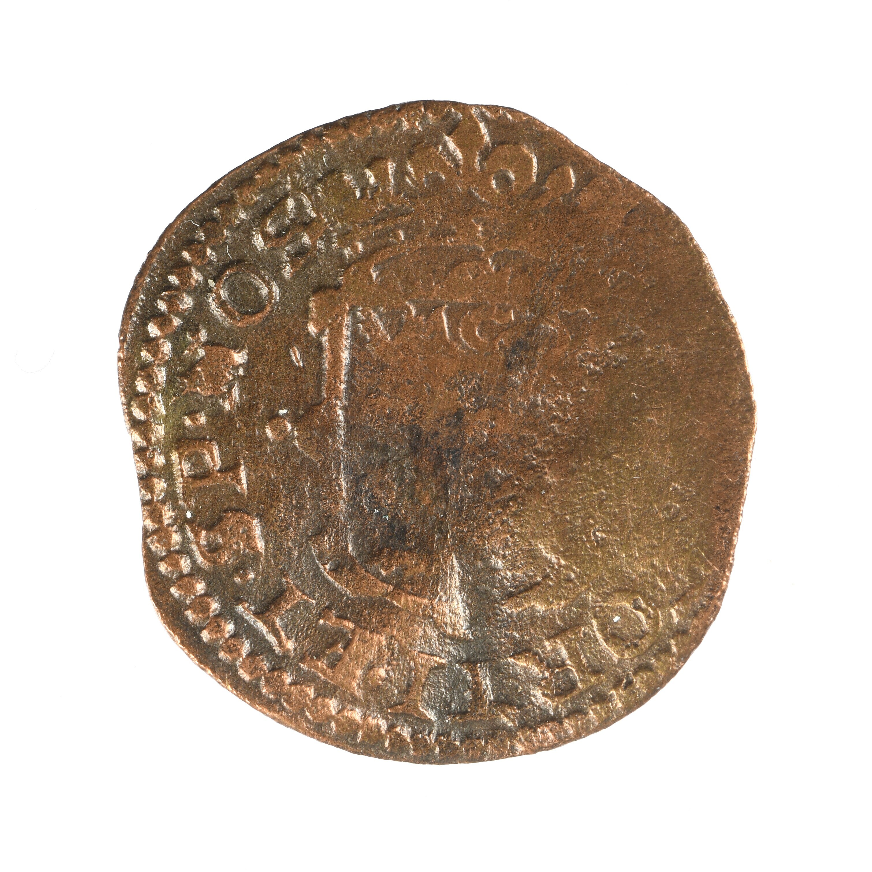 Duit; West-Friesland; vz.: een tulpkrans met daarin de tekst WEST F[RISIAE] in twee regels, daaronder het jaartal 1[626]; kz.: gekroond wapenschild met het wapen van West-Friesland. De leeuwen hebben hun kop 'en face' gericht met randtekst [DEVS.] FORTI. ET. SP. NOS; gewicht: 1.49 gram