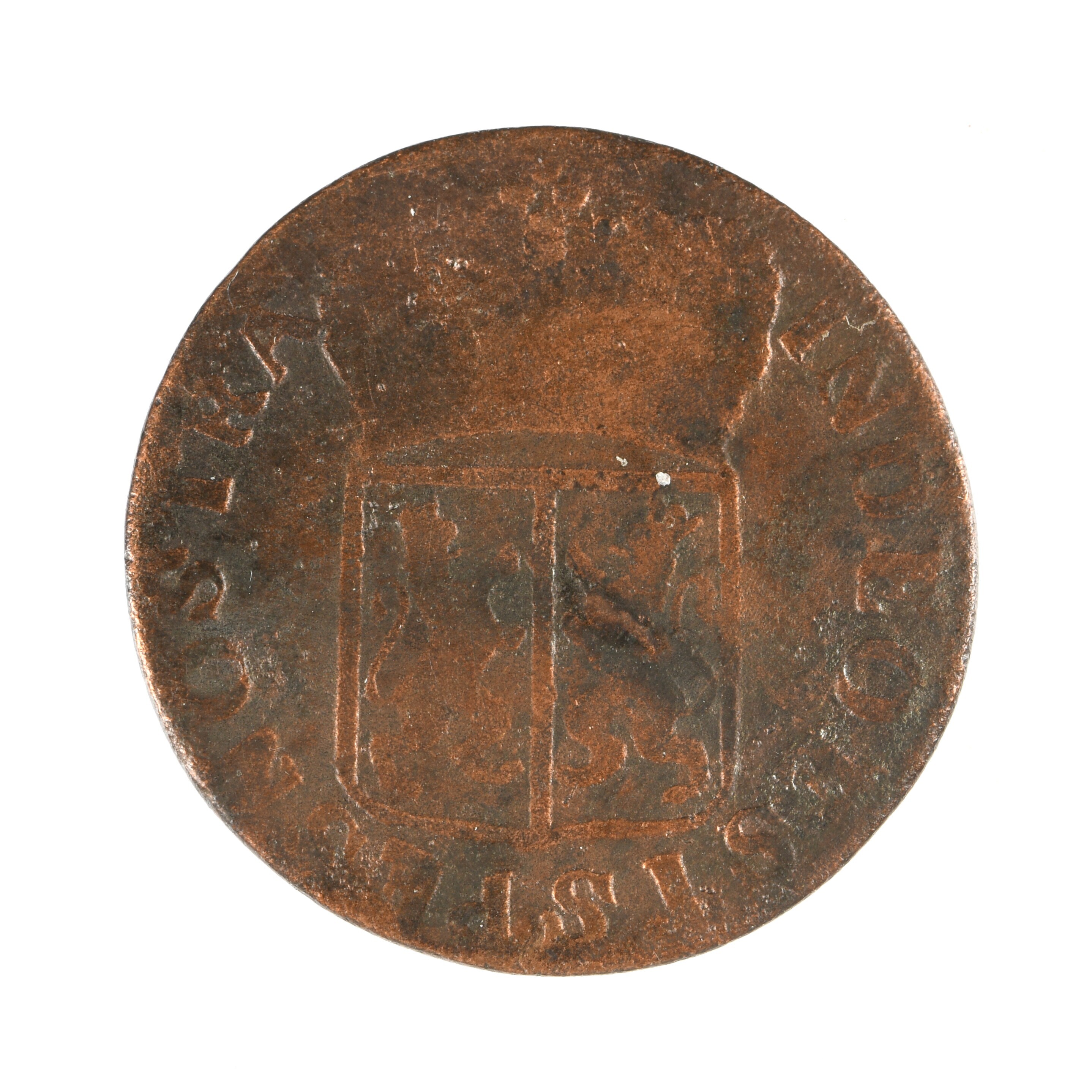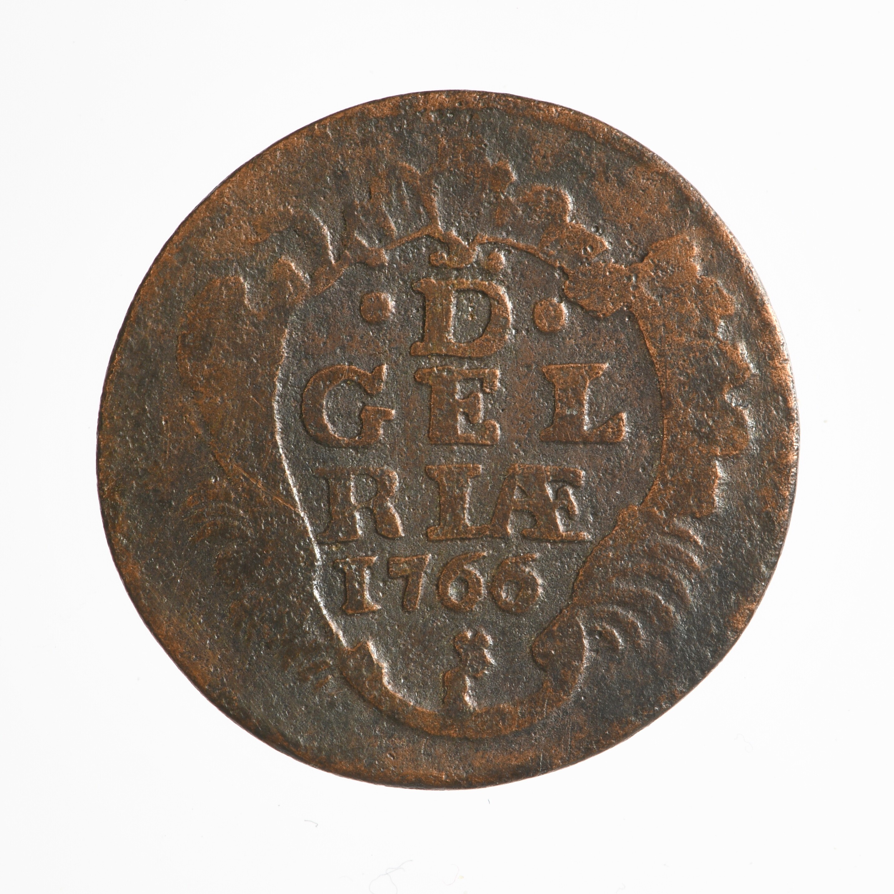 Duit; Gelderland Provincie (1581-1795); vz.: een zgn. rococostijl versiering met daarin de tekst •D• / GEL / RIÆ in drie regels. Daaronder het jaartal 1766 en het muntmeesterteken afgeknotte boom; kz.: gekroond wapen van Gelderland. Tekst: IN DEO. EST. SPES NOSTRA; gewicht: 2.91 gram