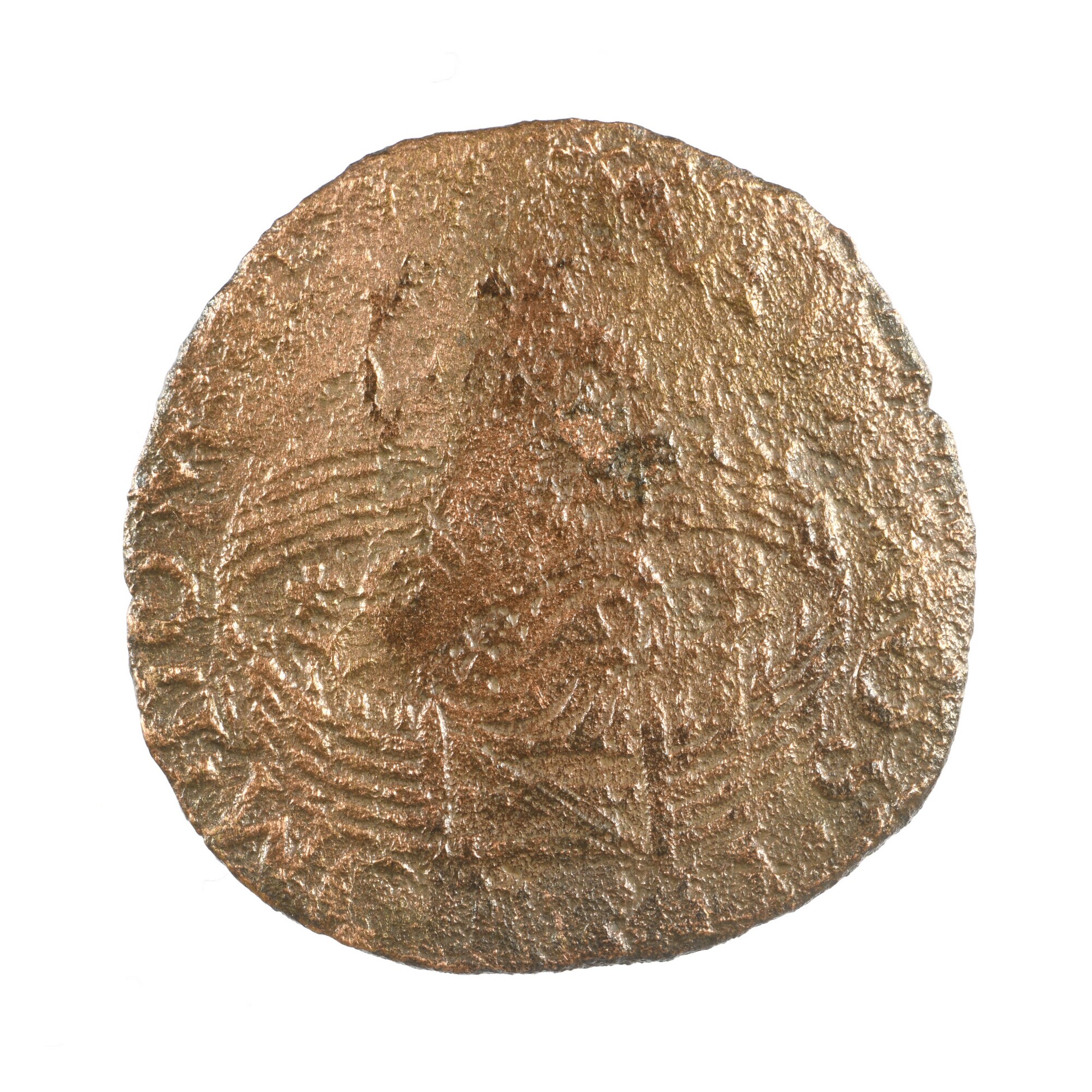 Duit; Holland Provincie (1581-1795); vz.: binnen een bladerkans in drie regels: HOL / LAN / DIA; kz.: de Hollandse maagd zittende in een gesloten tuin, omschrift: •AV[X]•NOS•IN•[N]OM•]DOM•(rozet); gewicht: 2.98 gram