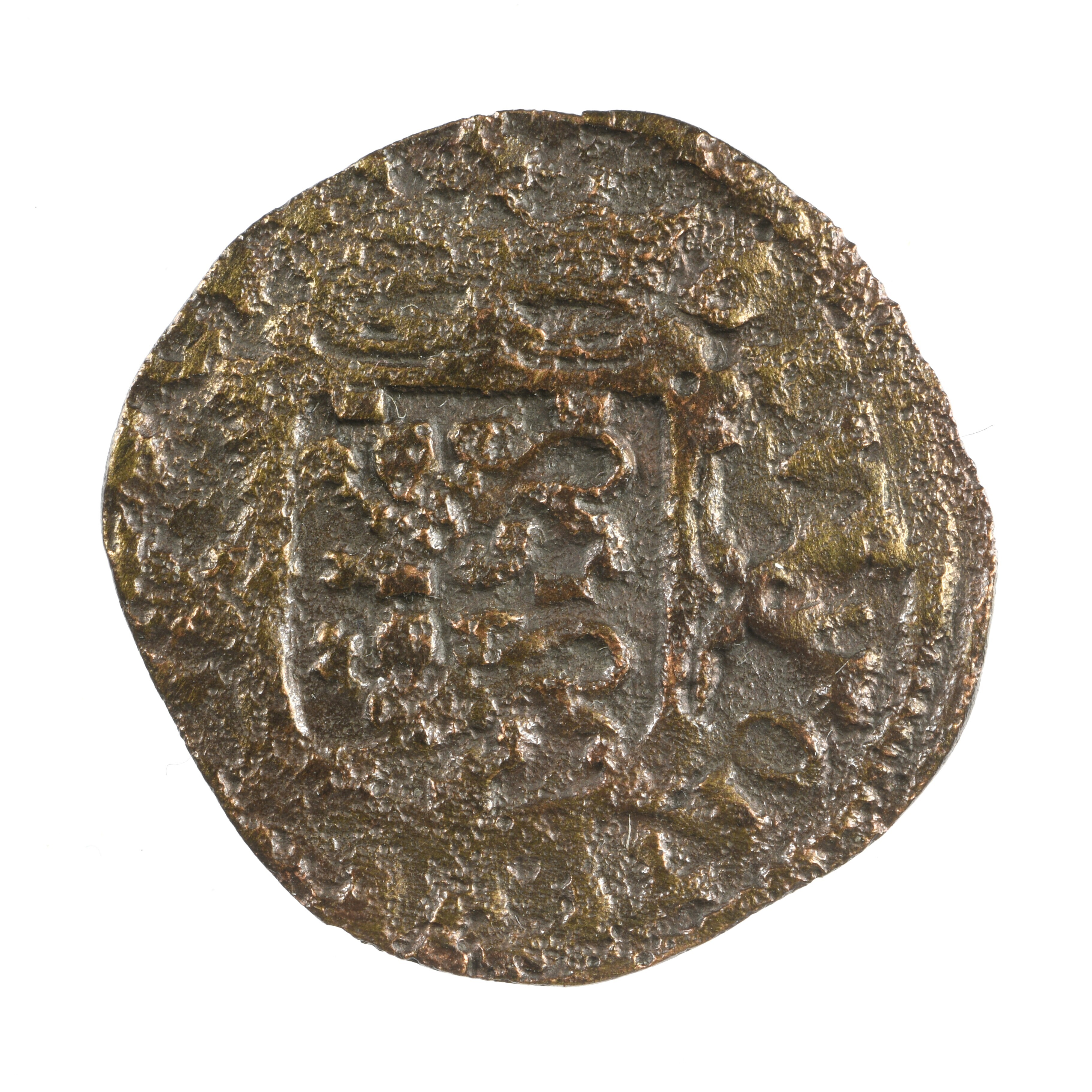 Duit; West-Friesland; vz.: binnen een bladerkrans in drie regels WEST / FRISIAE / 1605; kz.: gekroond wapenschild van West-Friesland op een breedarmig kruis, omschrift: DEVS FORTI [ET – SPES] NOS; gewicht: 1.68 gram