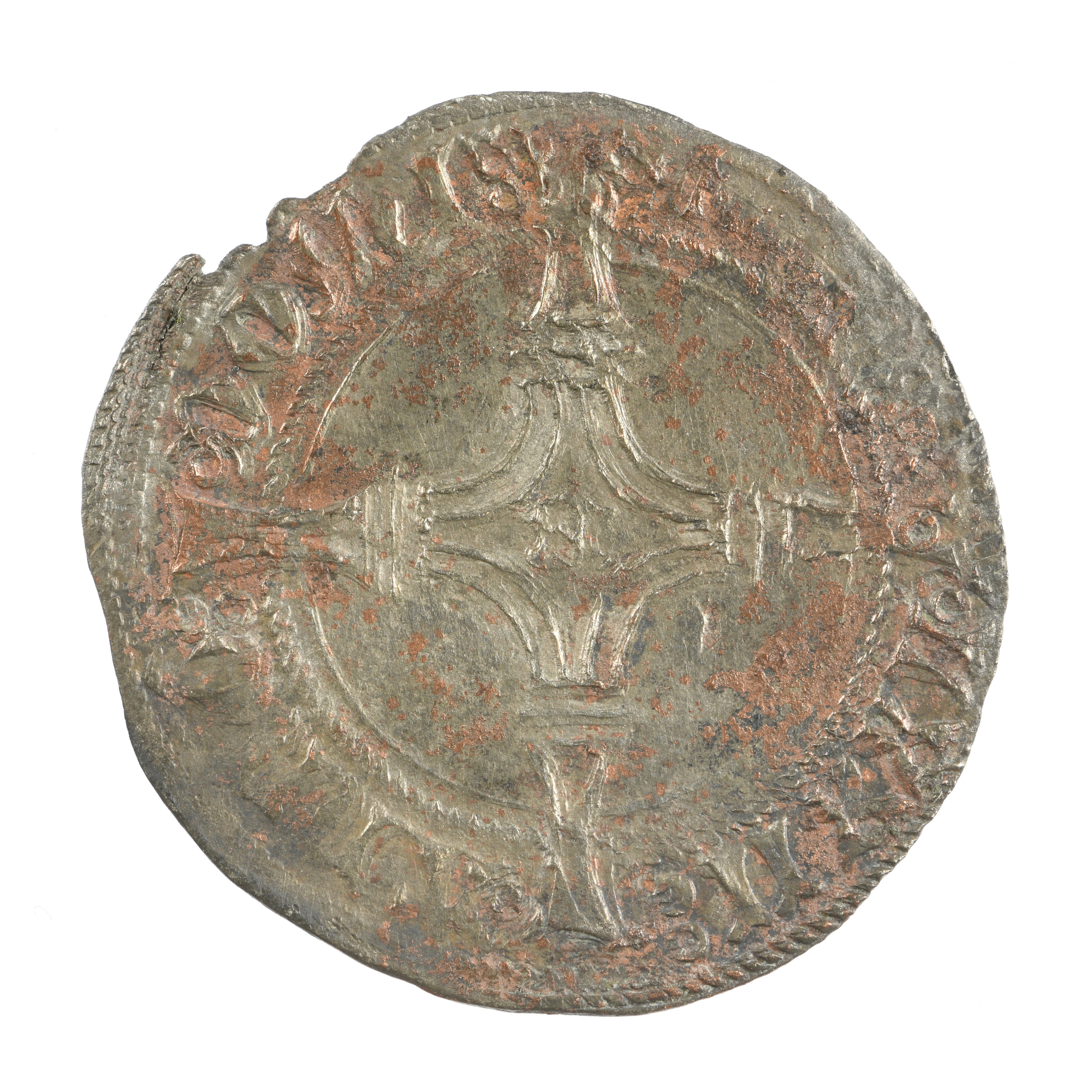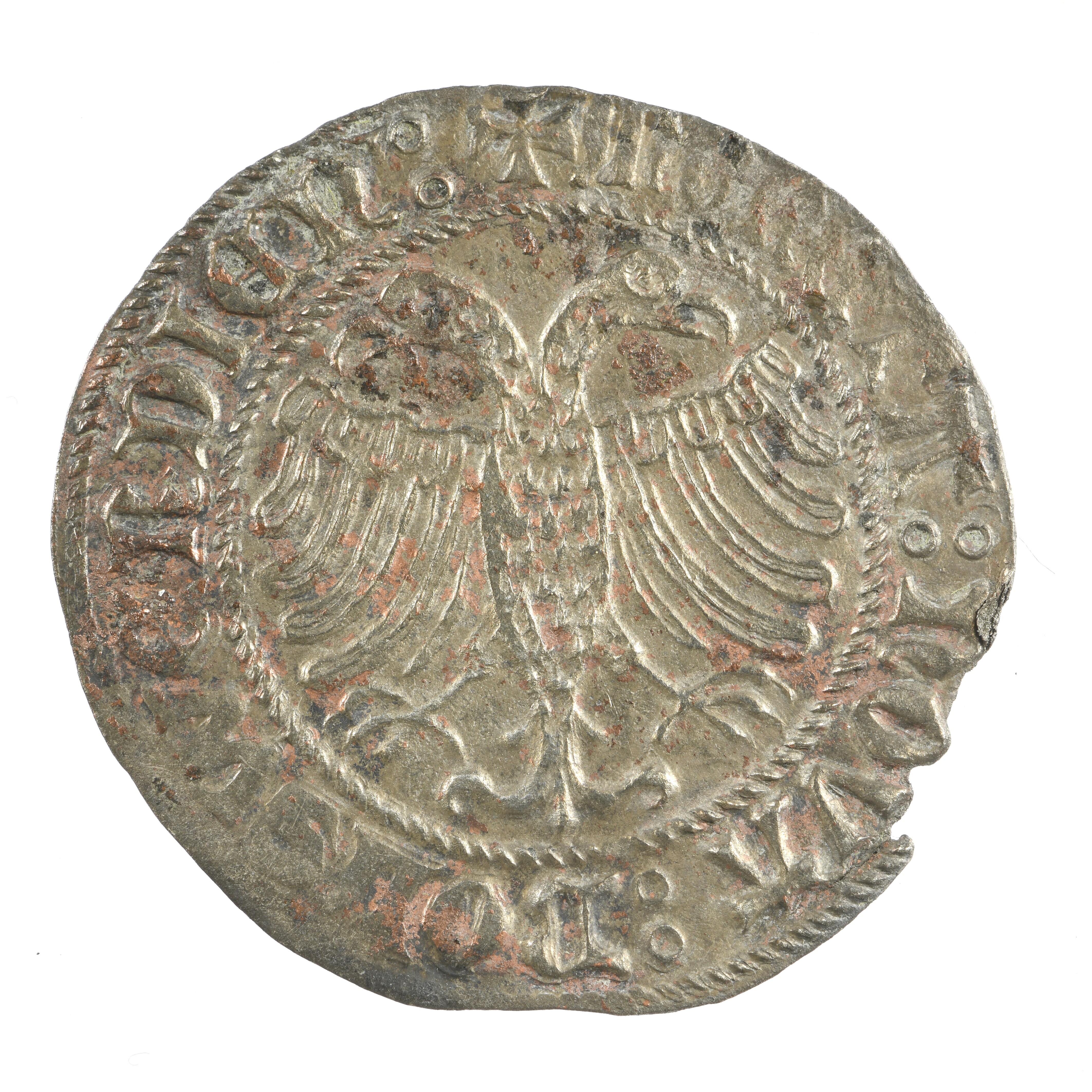 Stuiver/Vlieger; Bolsward; vz.: Dubbelkoppige adelaar binnen een parelcirkel, omschrift: MON?TA:NOVA:BOLSW?RDIAN; kz.: Lang gevoet kruis met letter B in een ruitvormig hart, omschrift: ANNO - :DOMIN - [M - CCCC] - :LXXII; gewicht: 2.06 gram
