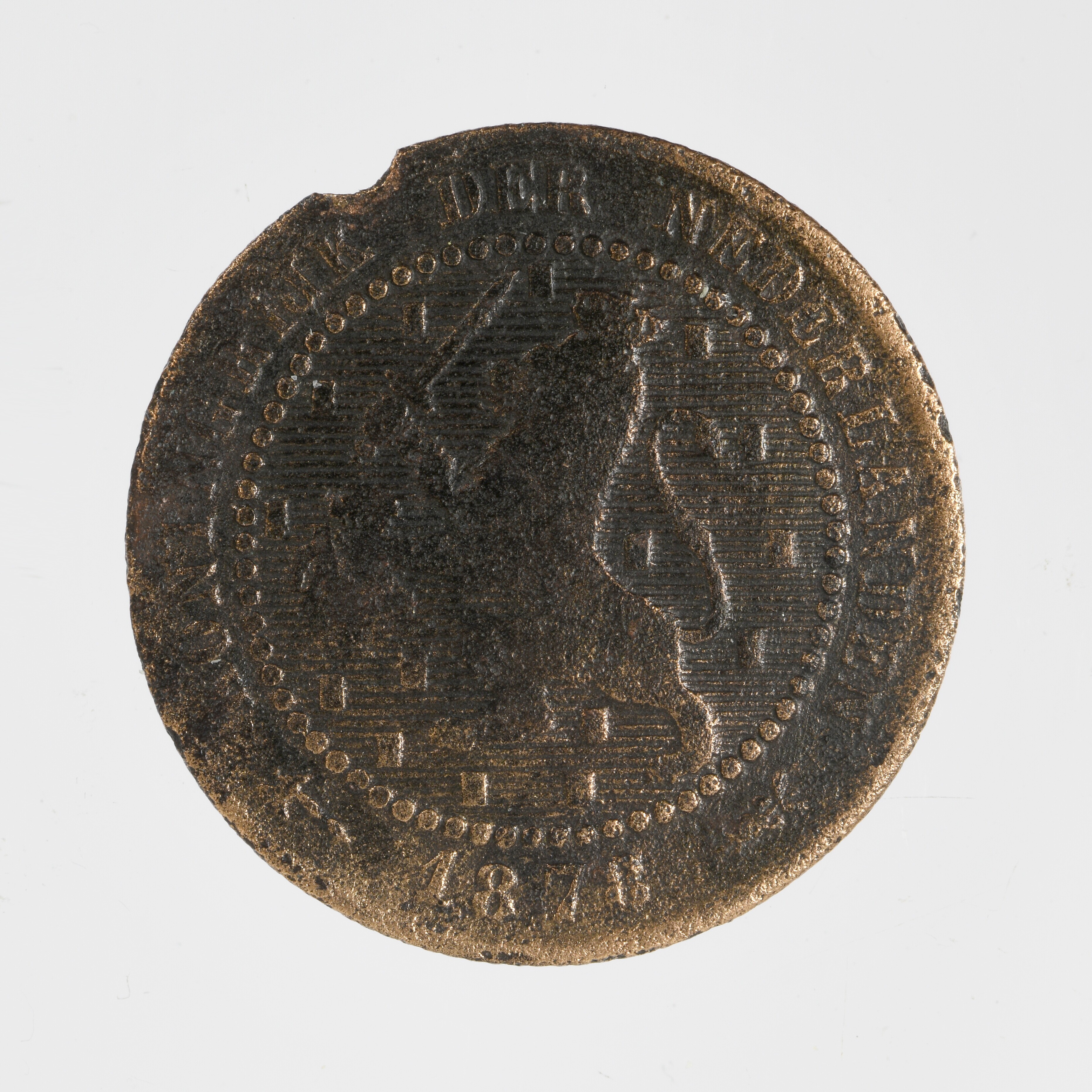Cent; Nederland Koninkrijk (1813-heden); Willem III (1849-1890); vz.: vz.: klimmende leeuw naar links met zwaard en pijlenbundel op een veld van azuur met zeventien blokken binnen parelcirkel, met omschrift: (bijl) KONINGRIJK DER NEDERLANDEN (mercuriusstaf) 1877; kz.: binnen een krans van twee samengebonden oranjetakken opschrift in twee regels: 1 / CENT; muntplaats: Utrecht; gewicht: 2.25 gram